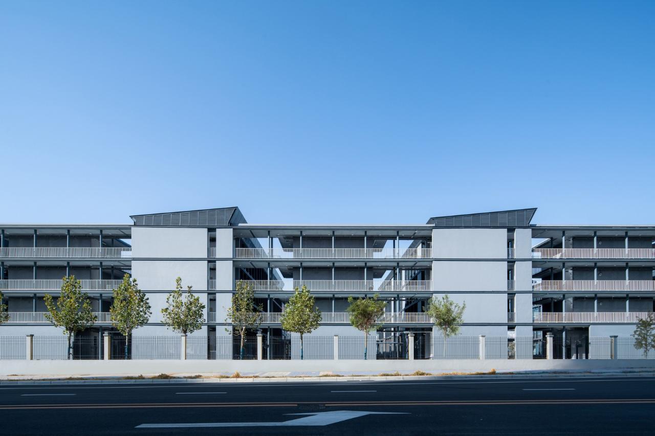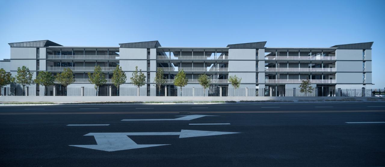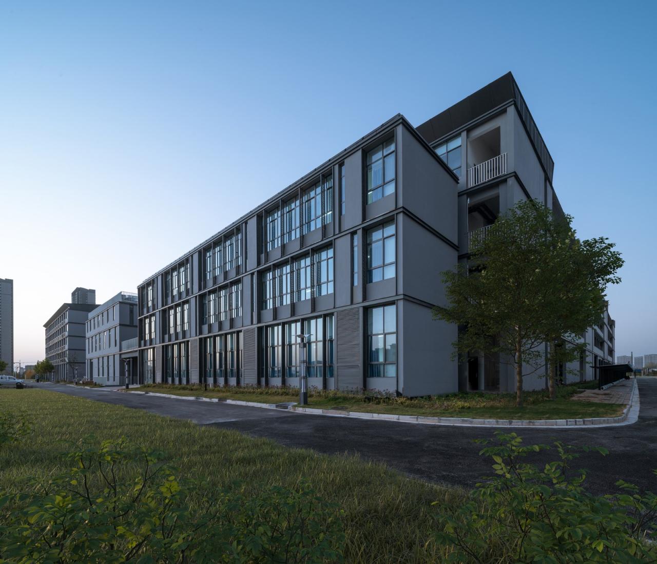 设计主要实现了以下三点:1,建筑涂料饰面采用“包豪斯灰”,局部点缀格栅百叶。由于造价的严格控制,百叶的材料为空调室外机百叶的再循环利用,通过有节奏韵律的错动和变化彰显一定的细部品质。