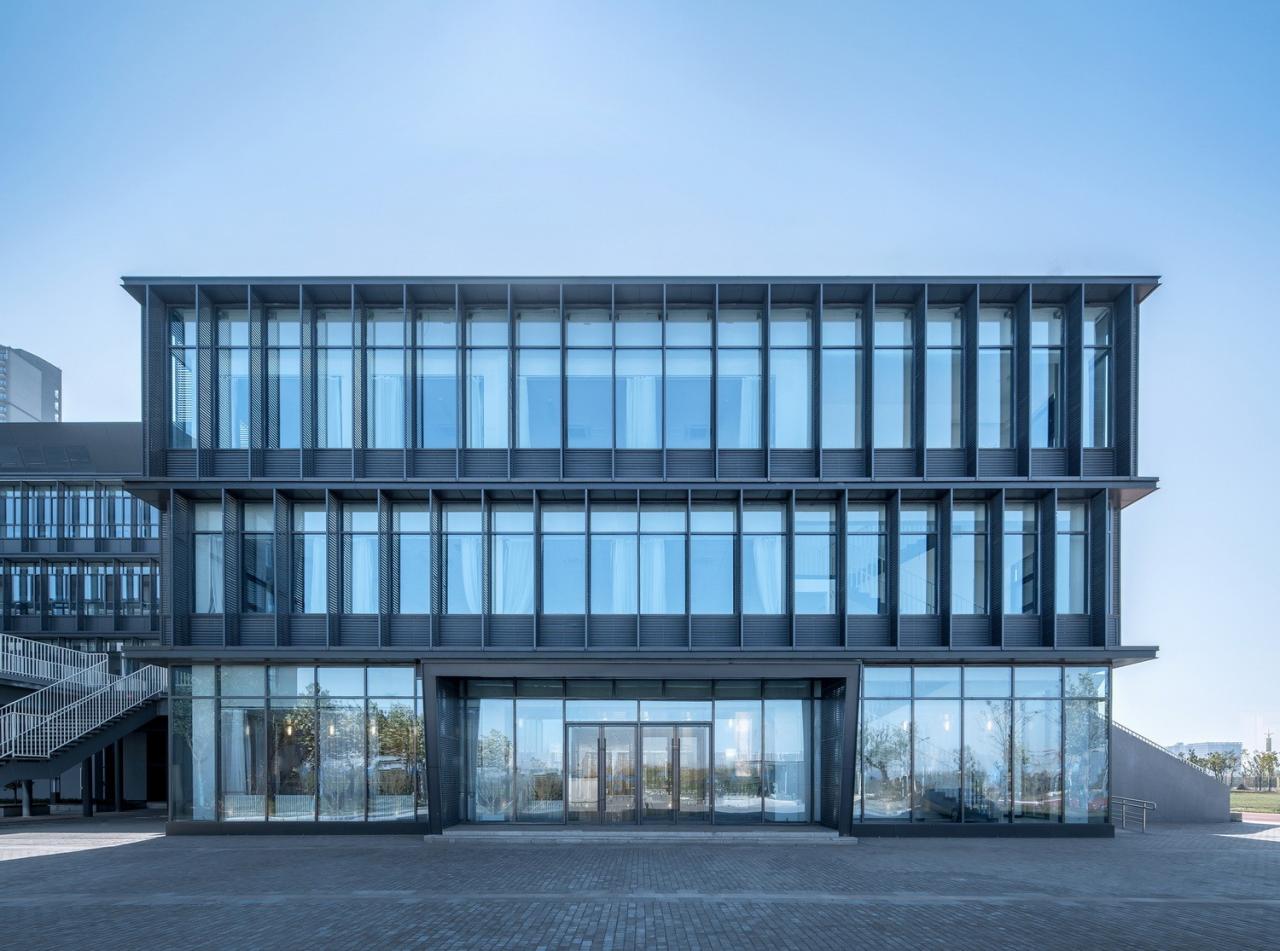 3,屋顶采用了单坡顶的形式,与整体风格保持一致;与此同时,我们遵循“形式追随功能”的原则,把坡屋顶下方的空间用作空调室外机组的存放空间,在传统坡顶的造型下,实现功能的“微创新”。