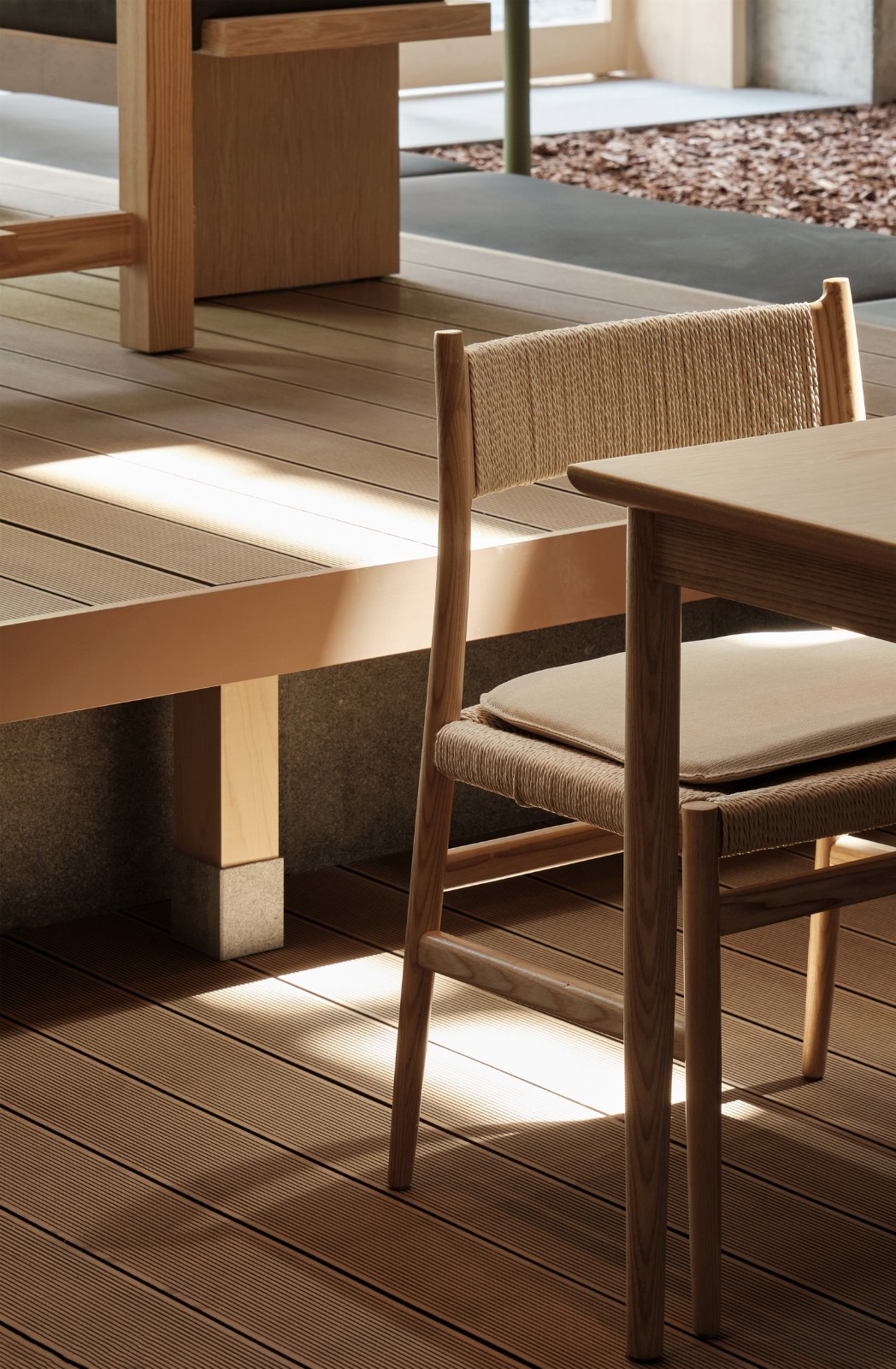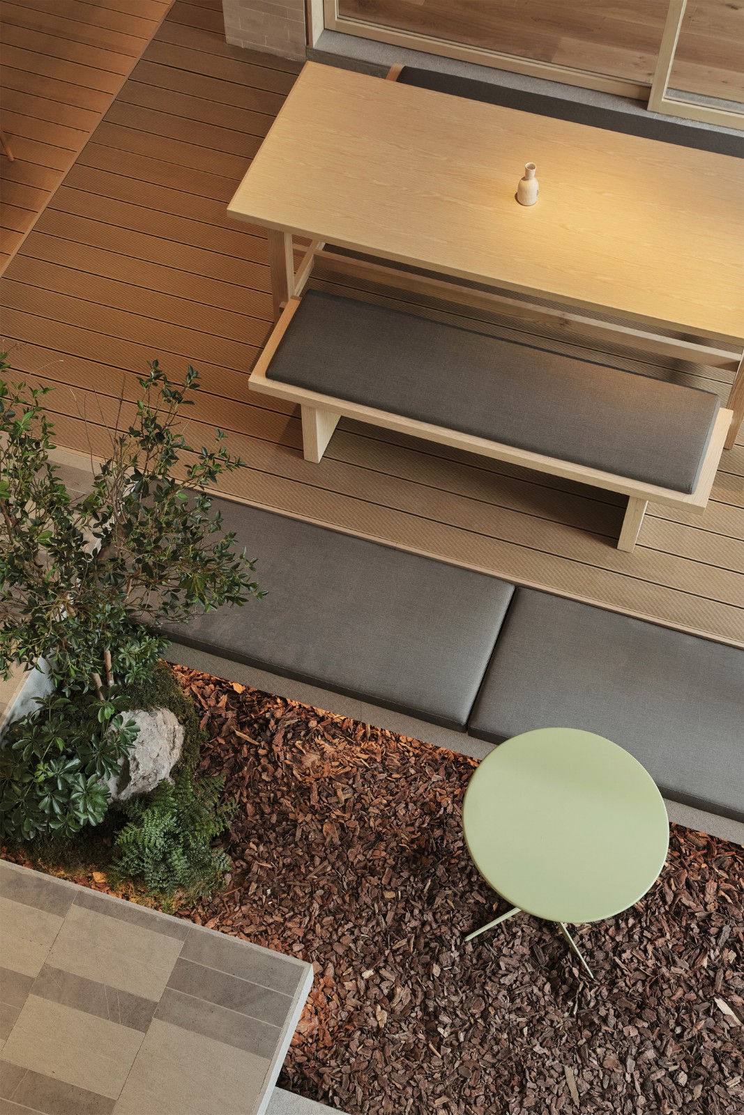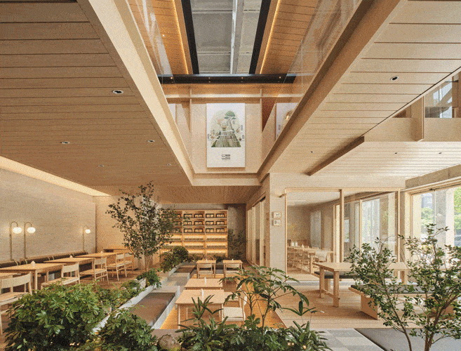 基于强调朴素美学的品牌调性,整体空间在环境中依地而生,以灵活开放的姿态介入到年轻消费者的社交生活方式,融入观点品牌对年轻人都市美好生活的愿景,在茶饮与素食美学的创新下,以重构自然来呈现出连系日常的诗意空间。