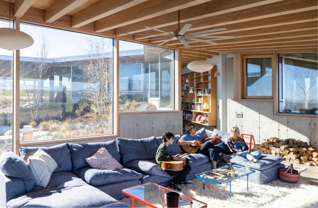 花之家建筑部分嵌入山坡中,因此其场地地形也为房屋提供了一定的隔热,并让室内空间可以有着从开放至封闭、从公共到私密、从地上至地下的动态氛围变化。此外,在场地向西的坡道上部,建筑天窗照亮了卧室及卫生间,而在向东的坡道底部,则有更多的公共区域可以借由落地窗向周围的景观开放。