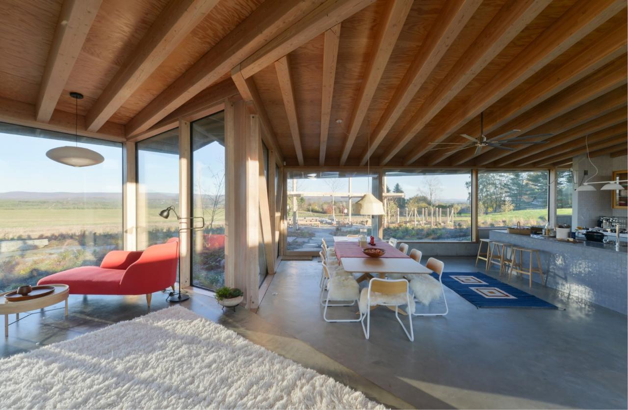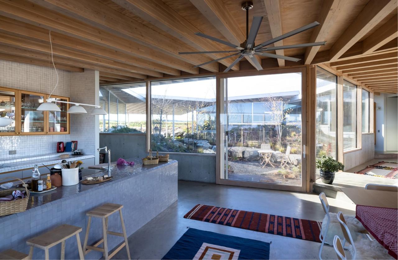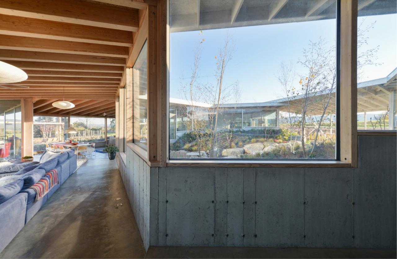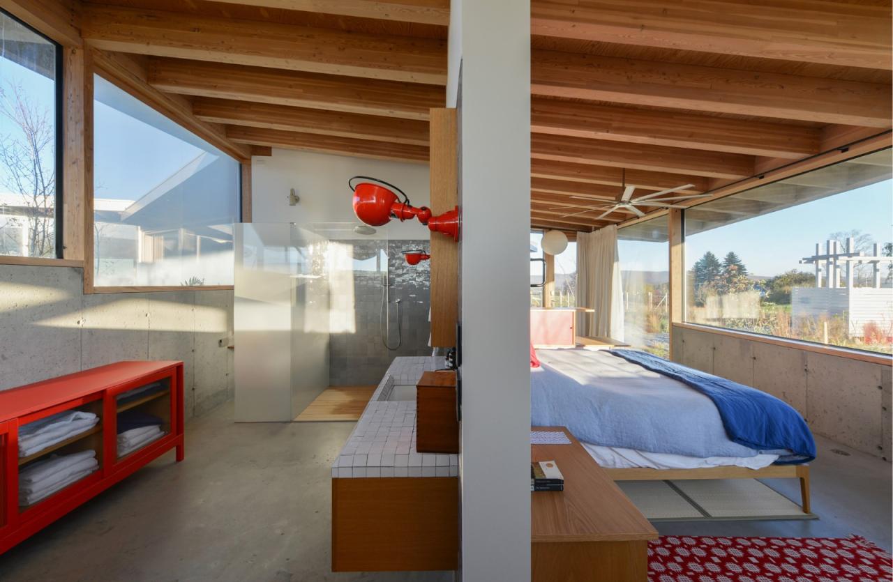 建筑将浴室、储藏室及机械设备设置在上述的结构核心筒中,由此最大限度地探索了可用空间,同时极少化了建筑中的实墙体量。在最终的设计中,无柱的室内空间解放了内部的流线,并保有庭院内部景观与室外远景间的清晰视野。同时,建筑师也在设计过程中不断地整合、清晰化建筑组件可能会有的不同轮廓,从而寻求极简结构体系所能创造的丰富空间体验,并突出了建筑内外的景观及多样的功能区划。