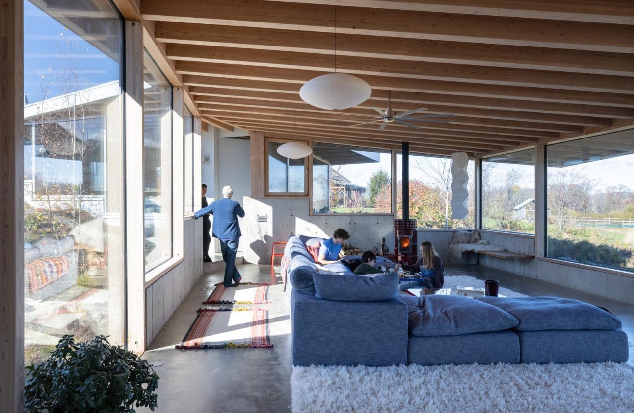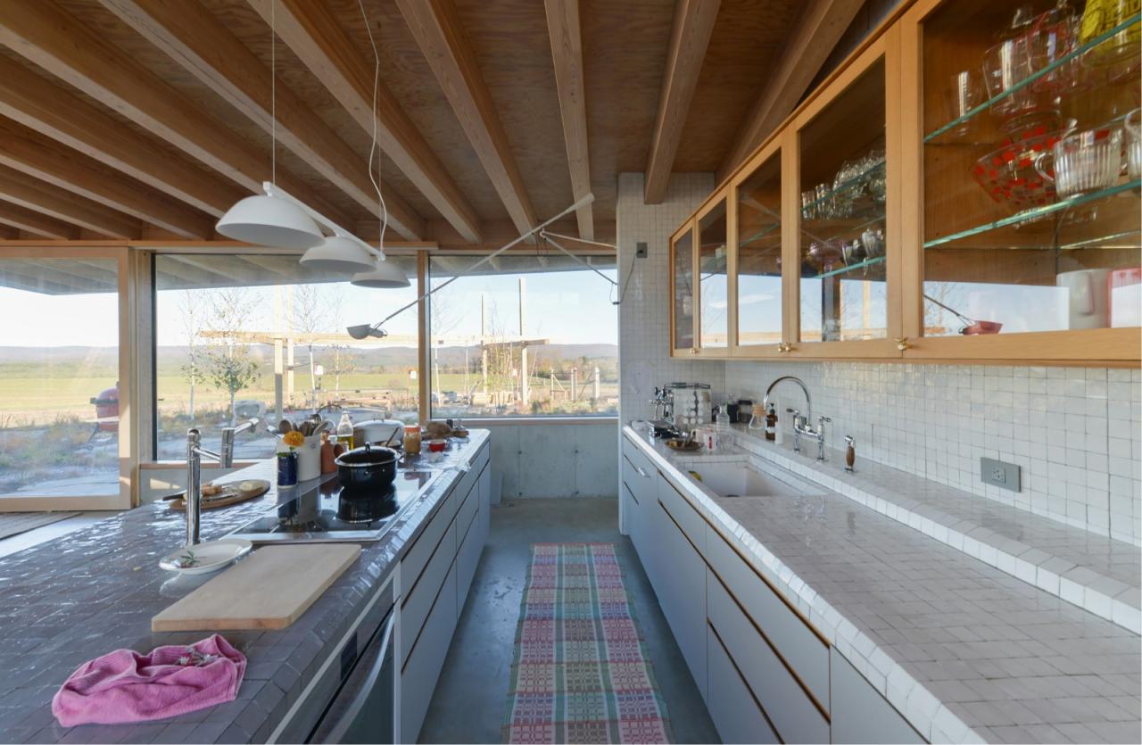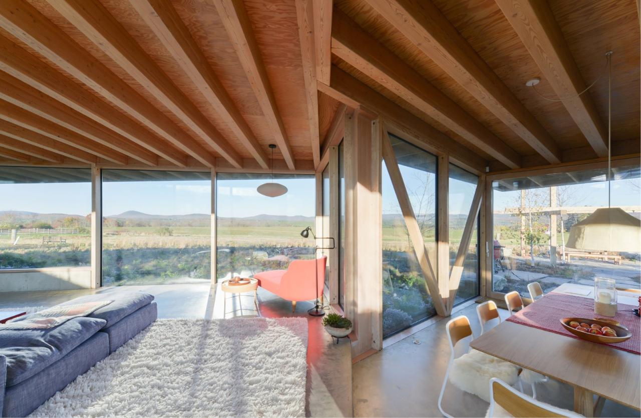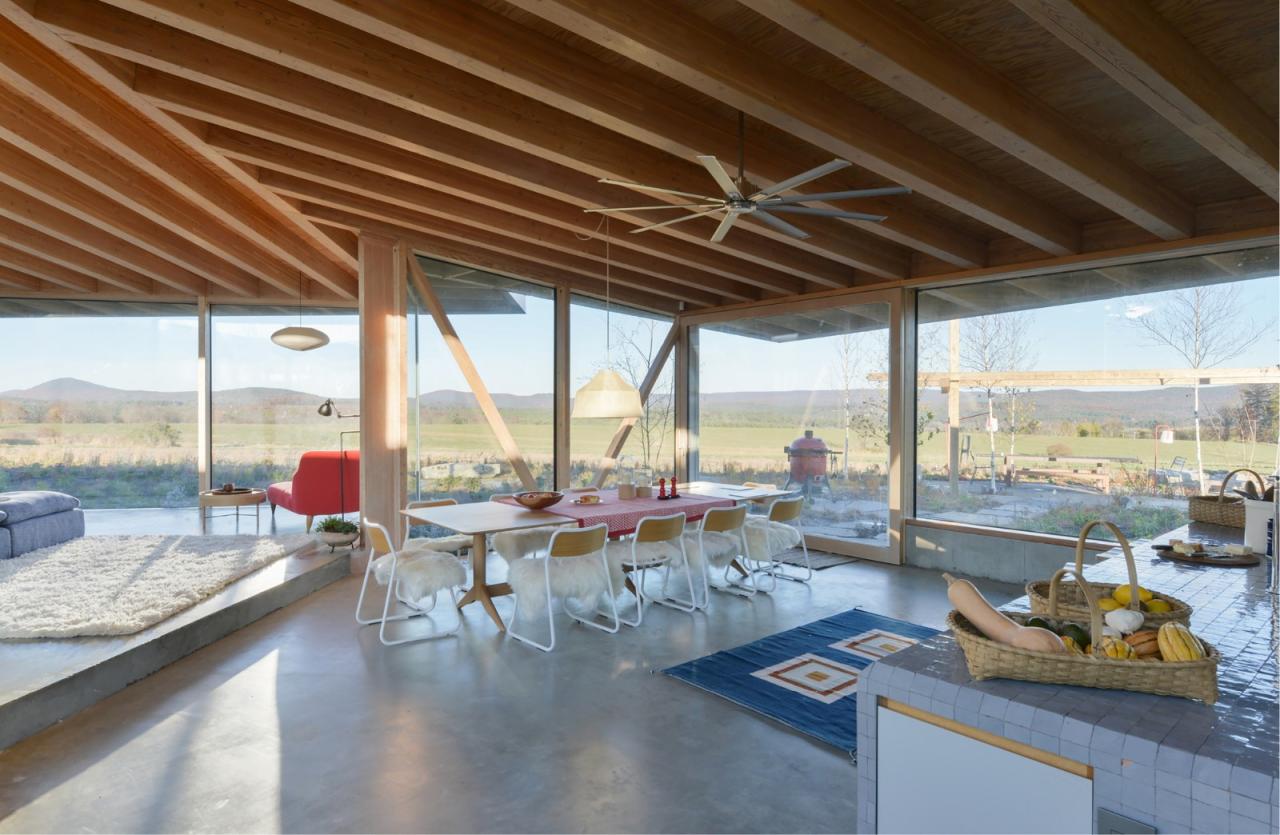 建筑将浴室、储藏室及机械设备设置在上述的结构核心筒中,由此最大限度地探索了可用空间,同时极少化了建筑中的实墙体量。在最终的设计中,无柱的室内空间解放了内部的流线,并保有庭院内部景观与室外远景间的清晰视野。同时,建筑师也在设计过程中不断地整合、清晰化建筑组件可能会有的不同轮廓,从而寻求极简结构体系所能创造的丰富空间体验,并突出了建筑内外的景观及多样的功能区划。