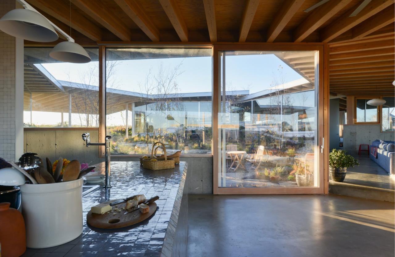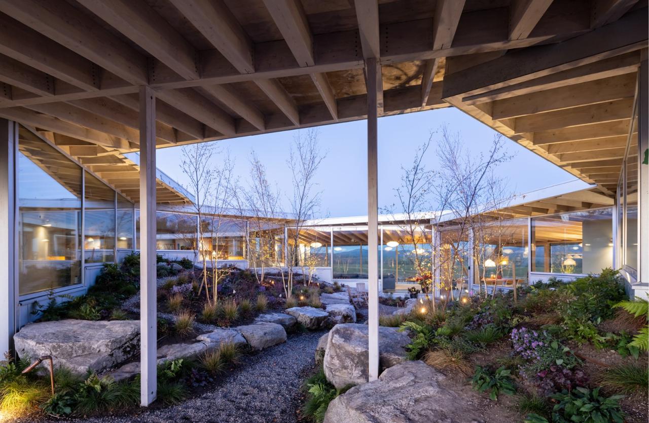 “花之家”由六个“花瓣”小屋体量围绕中央开放庭院,小屋相互紧扣、组合形成“花”型建筑,它通过与当地自然景观及平面布局的动态互动,重新诠释并拓展了玻璃屋的类型定义。