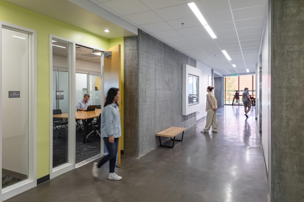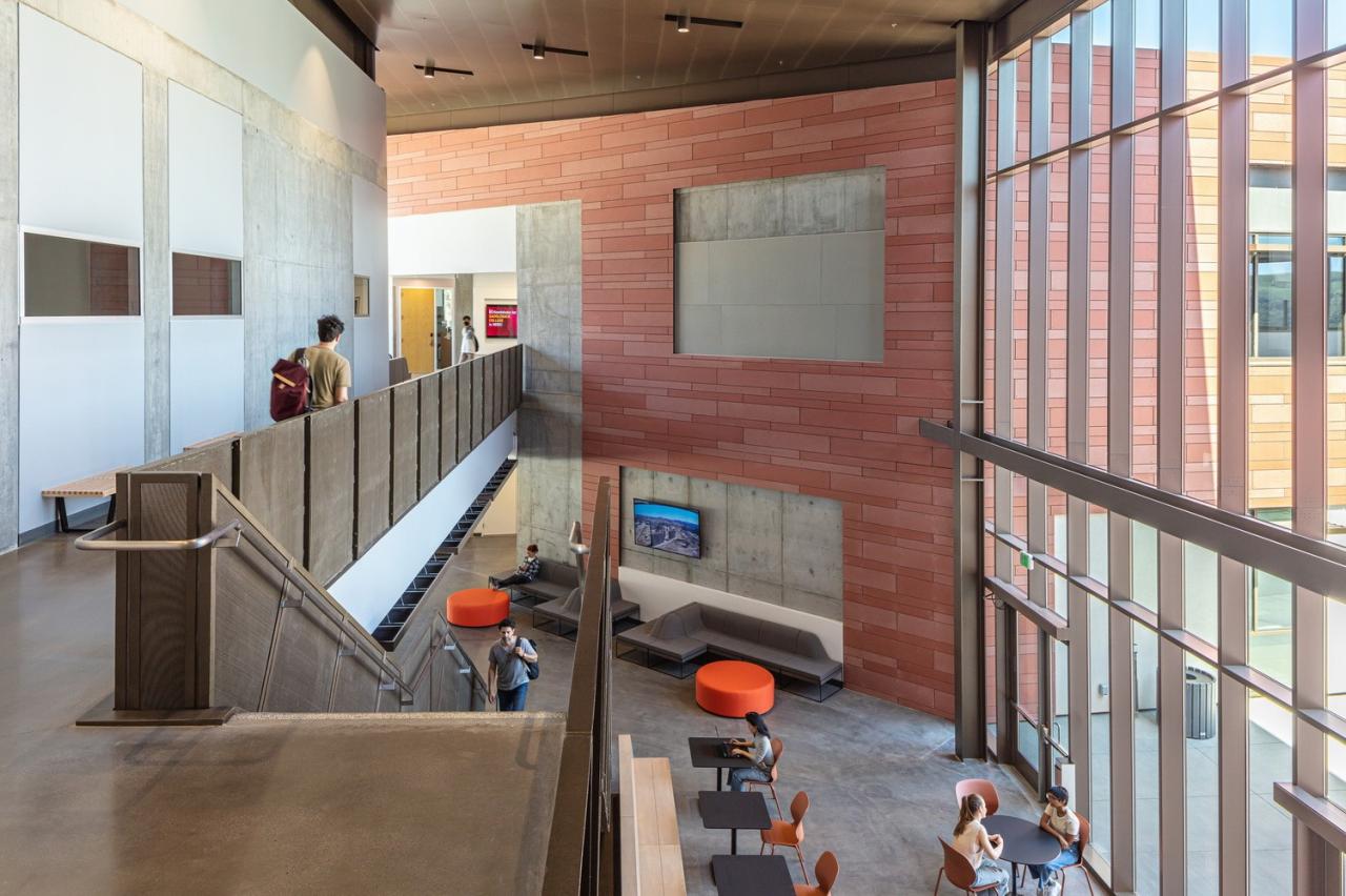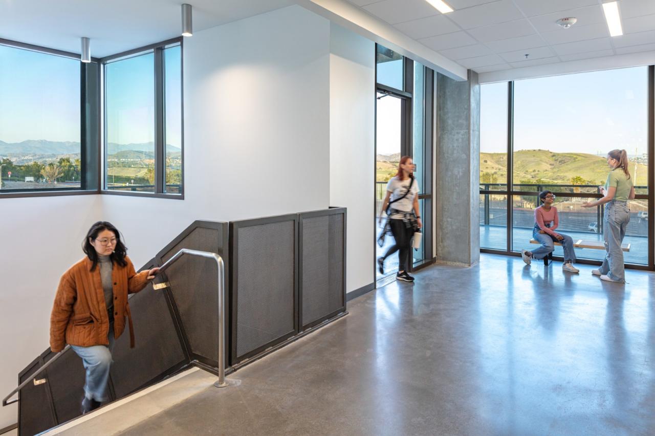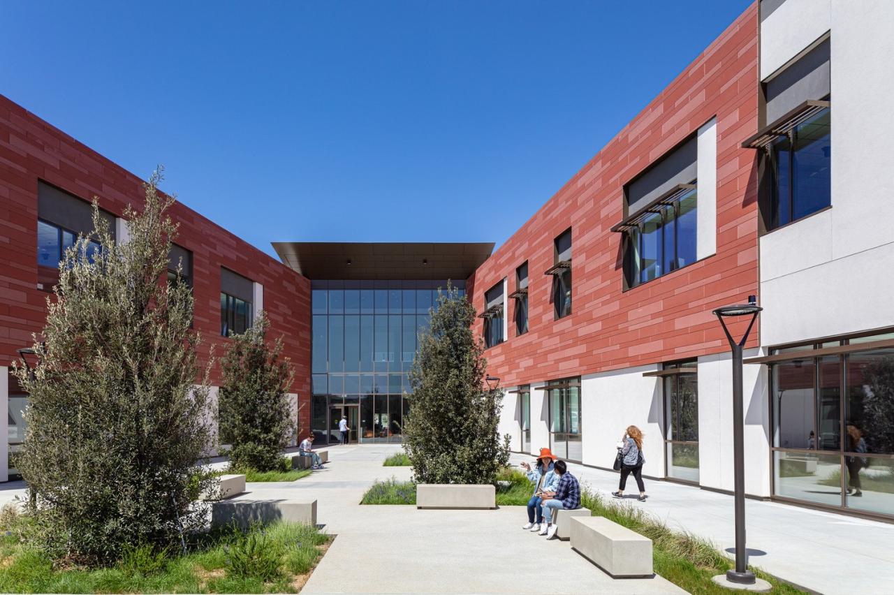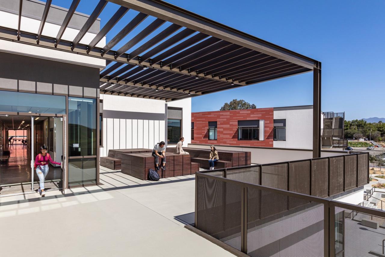 当人们来到这里,双漏斗形的入口门廊拥有长椅、硬质景观和从入口门开始的扇形线条 —— 强调人们到达大门的途径,并将人们的注意力转移到实验室、教室和庭院绿地上。一面赤土墙随着游客从外部进入内部,穿过玻璃立面;将入口门廊和主要社交场所,即教学楼的合作中心,联系起来。这面墙还延伸到东边的院子里,那里有一个露天剧场,可以看到特拉布科阿罗约和圣安娜山(Trabuco Arroyo and Santa Ana mountains)的广阔景观。