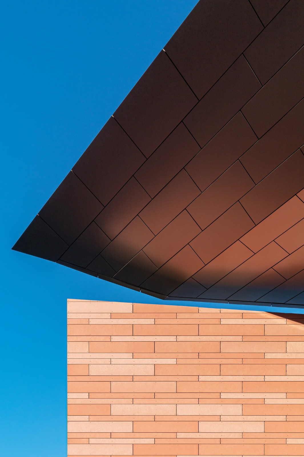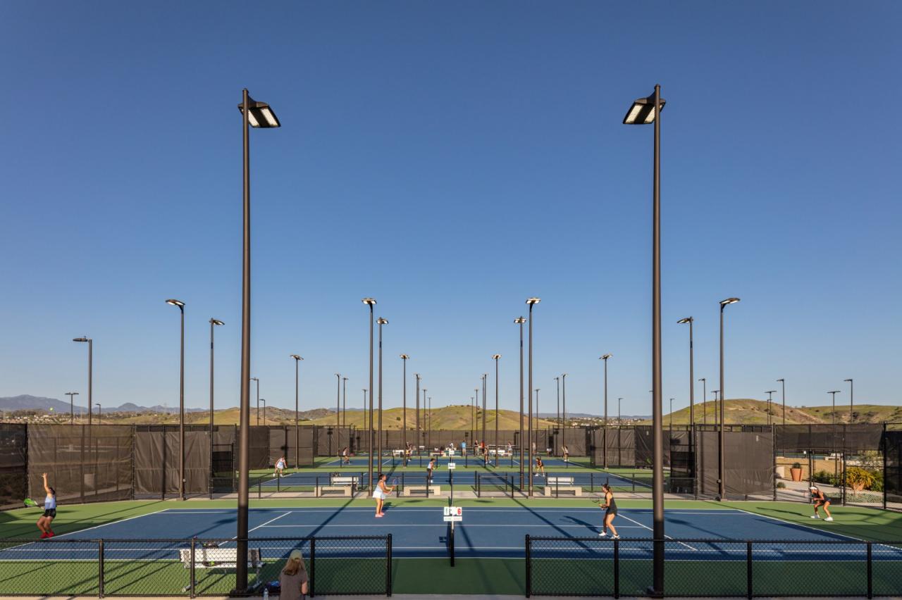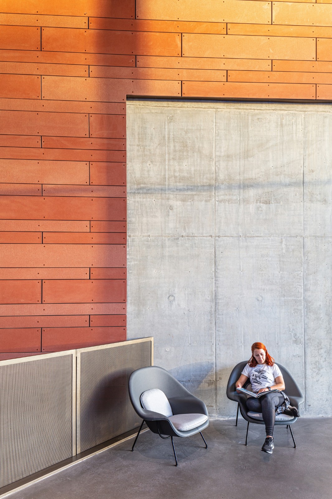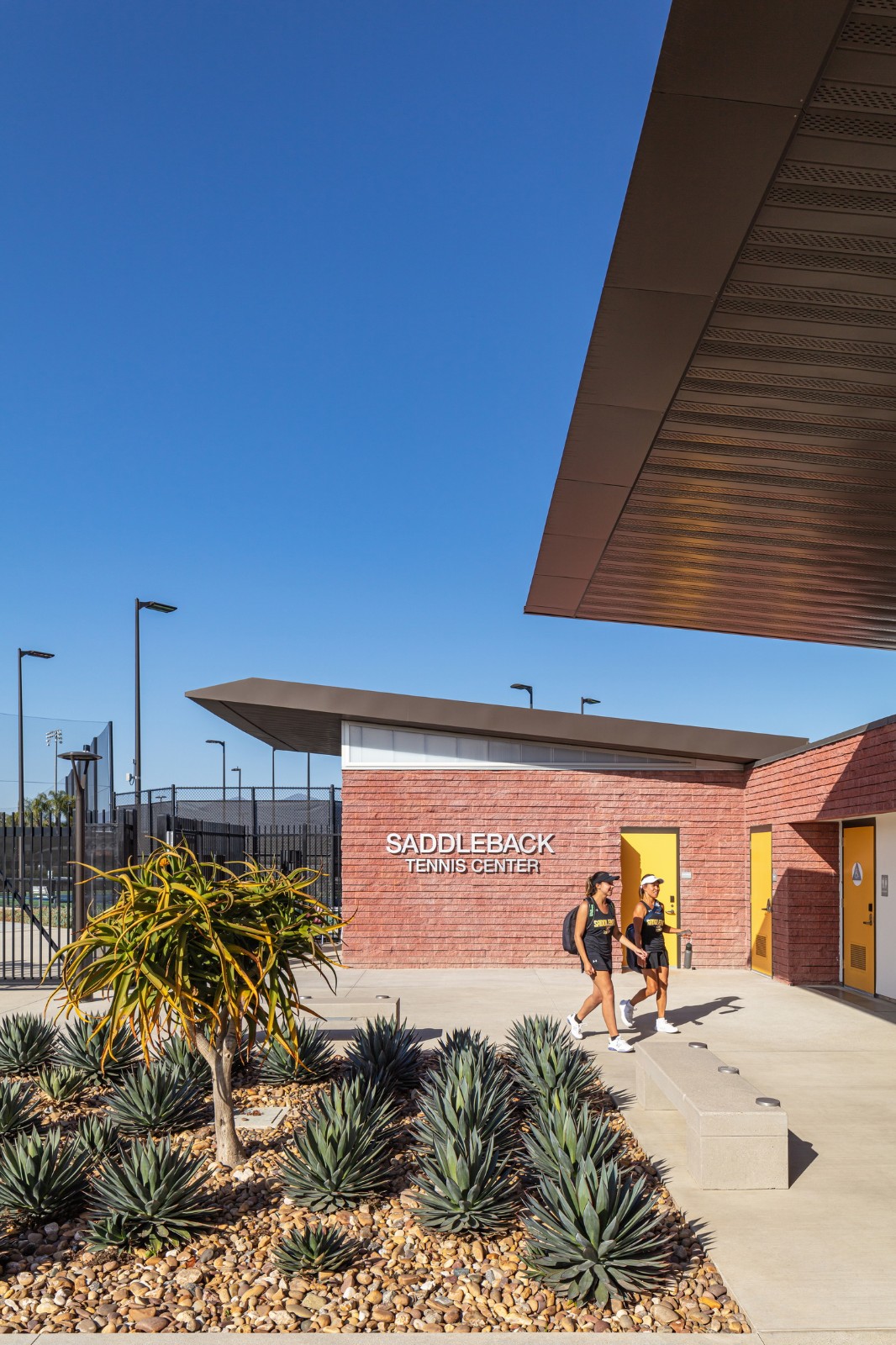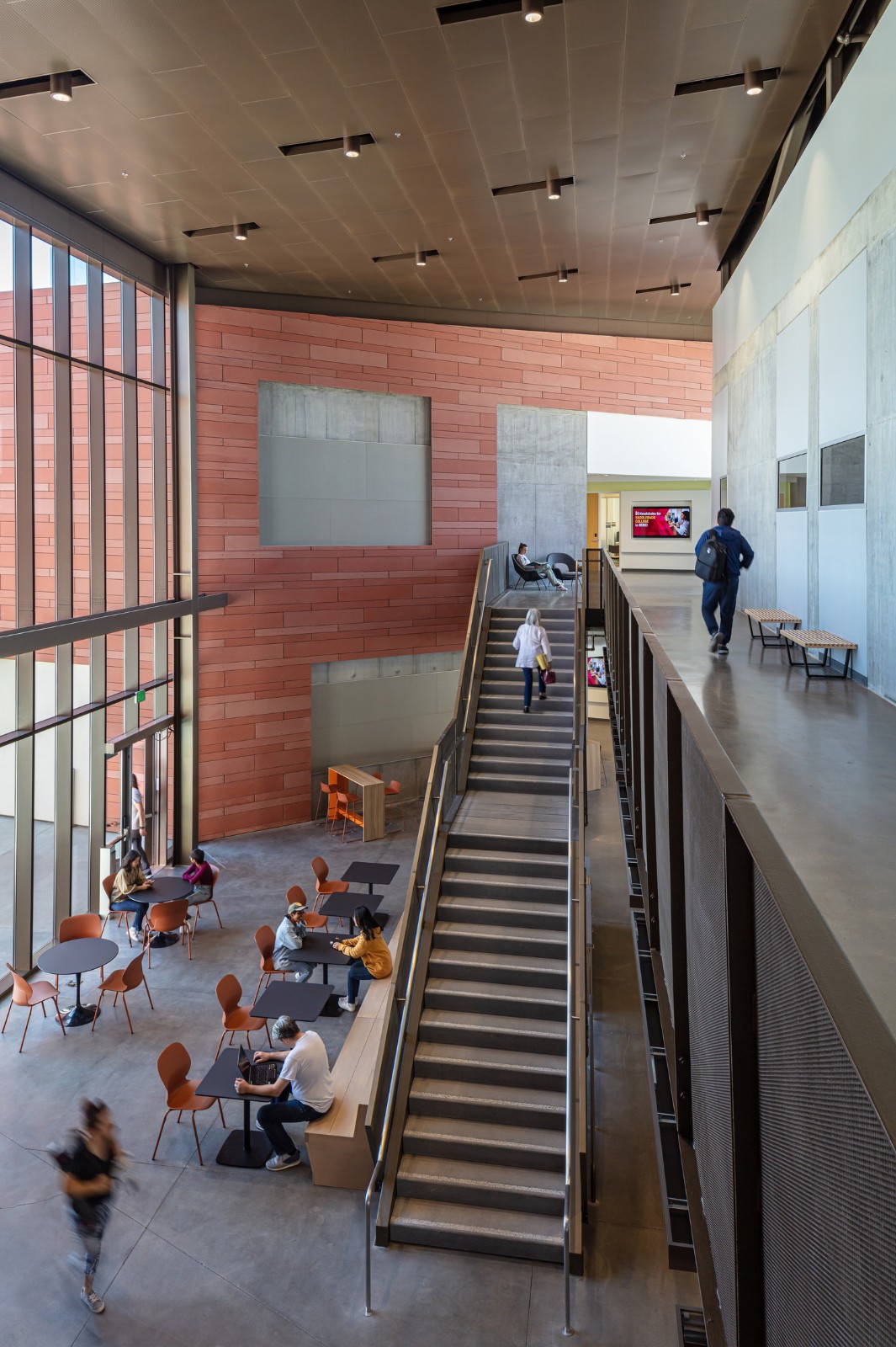 当人们来到这里,双漏斗形的入口门廊拥有长椅、硬质景观和从入口门开始的扇形线条 —— 强调人们到达大门的途径,并将人们的注意力转移到实验室、教室和庭院绿地上。一面赤土墙随着游客从外部进入内部,穿过玻璃立面;将入口门廊和主要社交场所,即教学楼的合作中心,联系起来。这面墙还延伸到东边的院子里,那里有一个露天剧场,可以看到特拉布科阿罗约和圣安娜山(Trabuco Arroyo and Santa Ana mountains)的广阔景观。