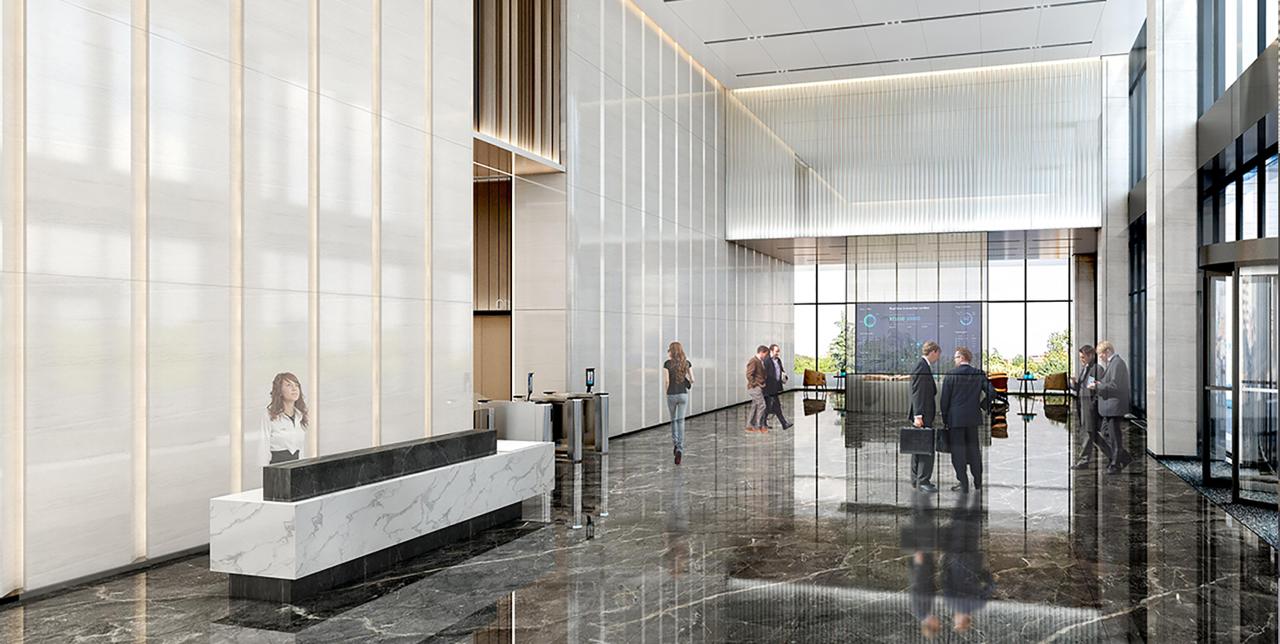 室内空间秉持秩序感与人性化相结合的理念,遵循简约、块面的建筑逻辑,对不同区域的净高进行精细化、差异化设计。其中电梯厅净高2.9M,办公区净高2.7M,局部净高达到3.2m。大面积的白色铝板、暖色调大理石,结合香槟金色不锈钢,打造舒适、尊贵的智慧空间。