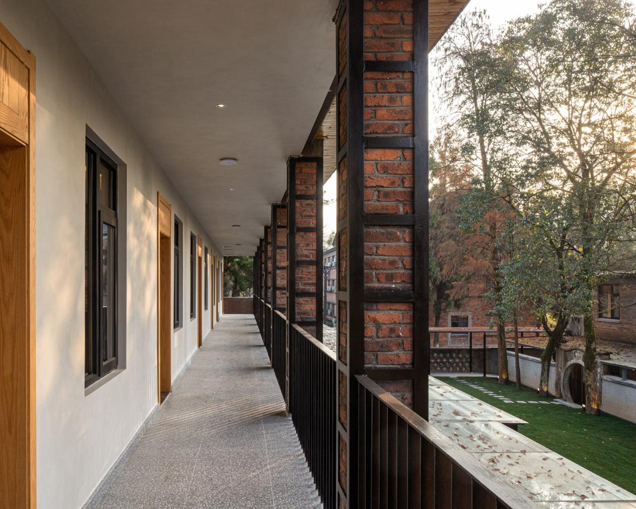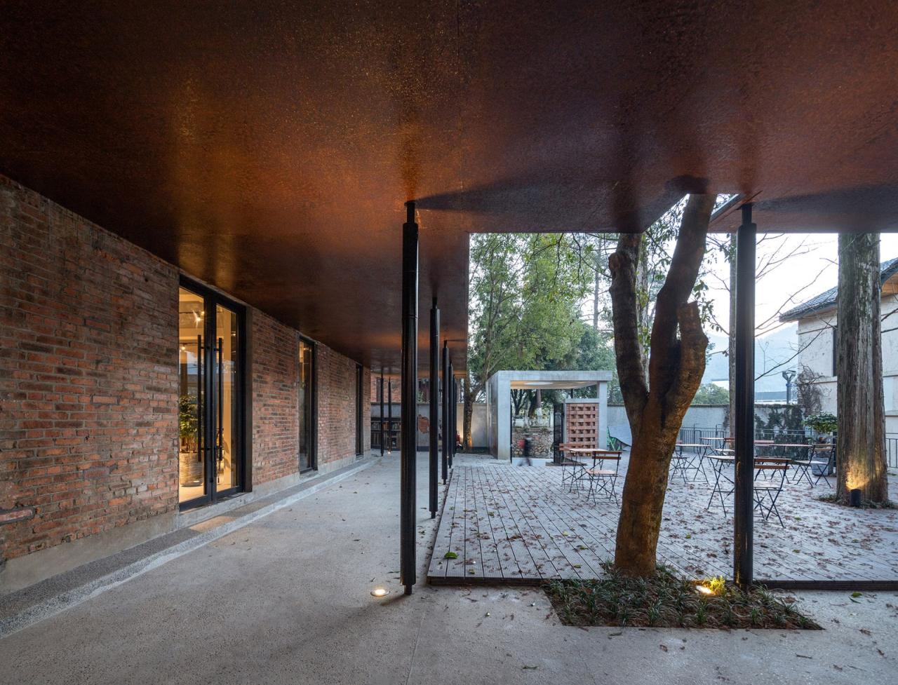 为了保证共享民宿的独立与隐私性,建筑师将原本园区道路与宿舍之间已破损的围墙重新进行了修葺与围合。同时植入了一条风雨回廊,来将前后建筑进行串联。在重塑动线和空间层次的同时也让场地更为整体。建筑师希望回廊在解决风雨遮阳功能的同时,也可以创造出一条游走在各个功能空间与庭院之间的体验动线。通过不同的转折与视角创造出不同的视觉观感与体验感。