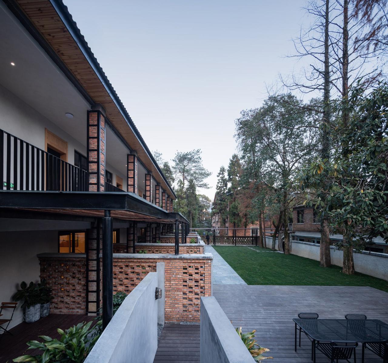 原本楼栋之间庭院留下的生长多年的大型水杉树别具韵味,但是原本的庭院空间不大不小没有被充分利用。而原本隔间式的宿舍户型将其改为客房后,空间局限性也很大。经过分析后,除了将内部户型结构重新进行设计与改造外,建筑师还决定将几个庭院也重新进行分配。1#庭院开放出来作为餐厅的延伸,形成休闲与就餐的公共庭院。2#与3#庭院则将其分割成公共活动的大庭院与客房专属的小庭院,增强空间的公共与专属使用价值的同时,也让水杉树与院落可以更好的相互交融。