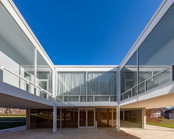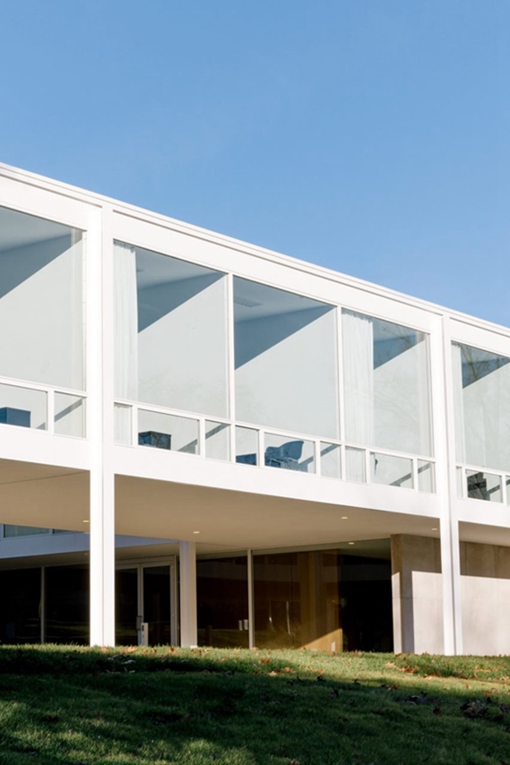 这座60英尺宽(18米)和140英尺长(43米)的建筑有两层,采用白色钢型材,是这个20世纪建筑师的特征。这幢建筑顶层完全包裹在玻璃中,并伸出地面凹陷结构的混凝土墙。较低的楼层大多是开放的,中央中庭一直延伸到第二层。