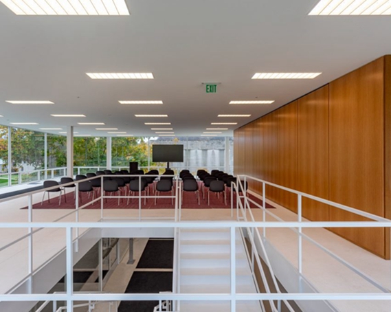 分隔的内部既有纯白色的墙壁,也有木质的墙壁,地面为灰色石灰石和白色环氧水磨石。放置由密斯-范德罗和弗洛伦斯-诺尔(Florence Knoll)的精选家具。新设计对密斯-范德罗最初设计的某些方面进行了更新,以符合规范。其中包括增加楼梯、液压电梯和扩大的机械室。