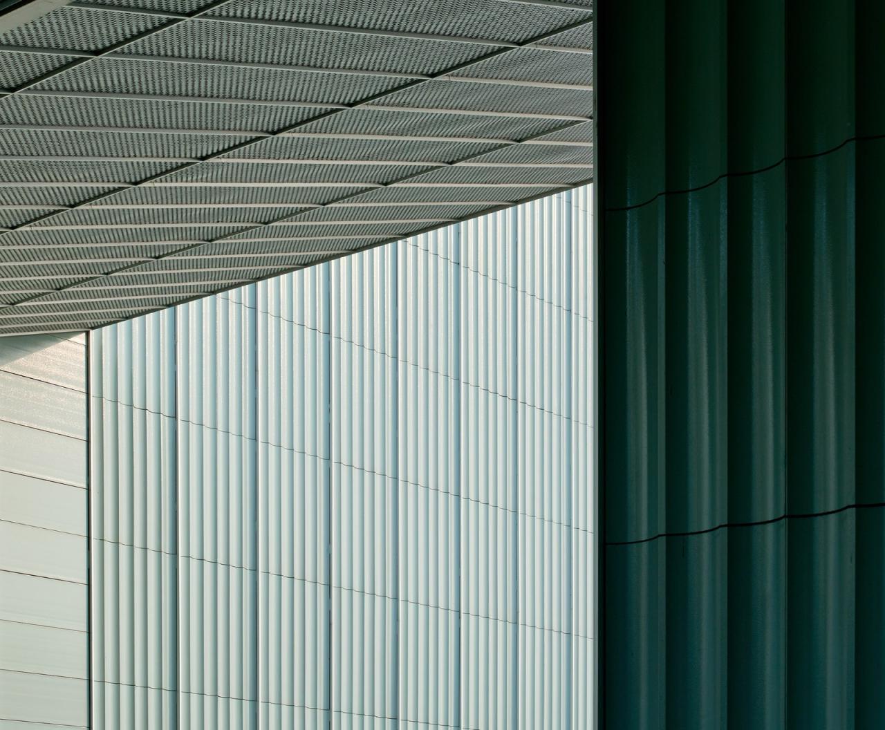 特别设计的竹节肌理板有意在建筑整体的现代风格中融入古典质感,凹槽间的肋线与整体平整、简洁的几何外观相得益彰。