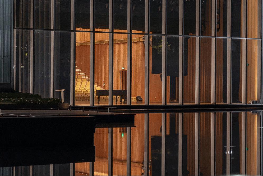 在竹色的主基调中,局部深色编织肌理金属板和金色线条点缀,增添空间层次感。本项目的建筑、室内及景观设计均由goa大象设计一体化完成,照明设计、幕墙设计以及舞台、灯光、声学等其他专项设计也由goa建筑团队统一把控效果,是一次全新而有意义的尝试。
