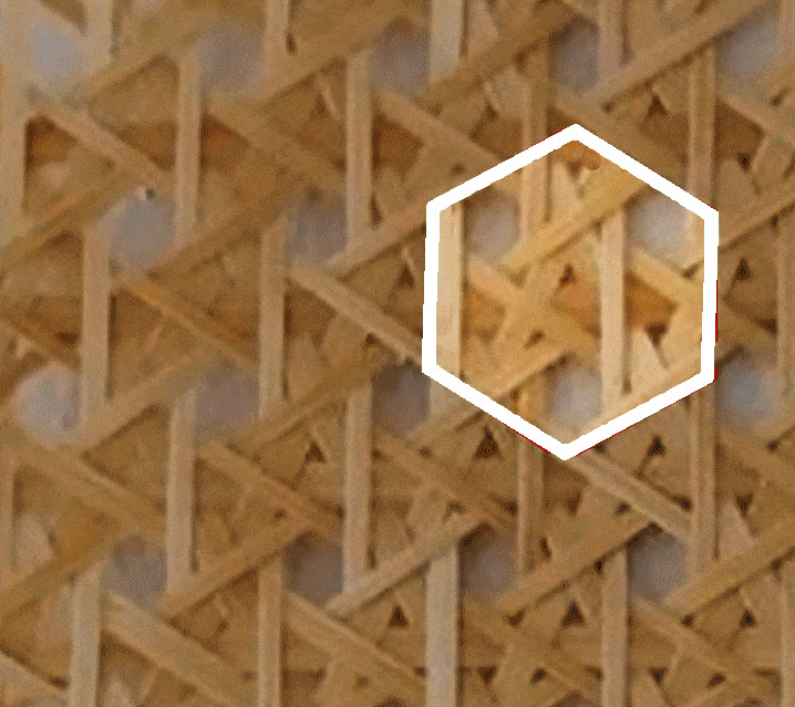 吊顶材质为竹质感金属预制件,以传统竹编工艺的肌理为灵感,提取几何要素并设计拓扑图形,实现了简洁而细腻的视觉效果。