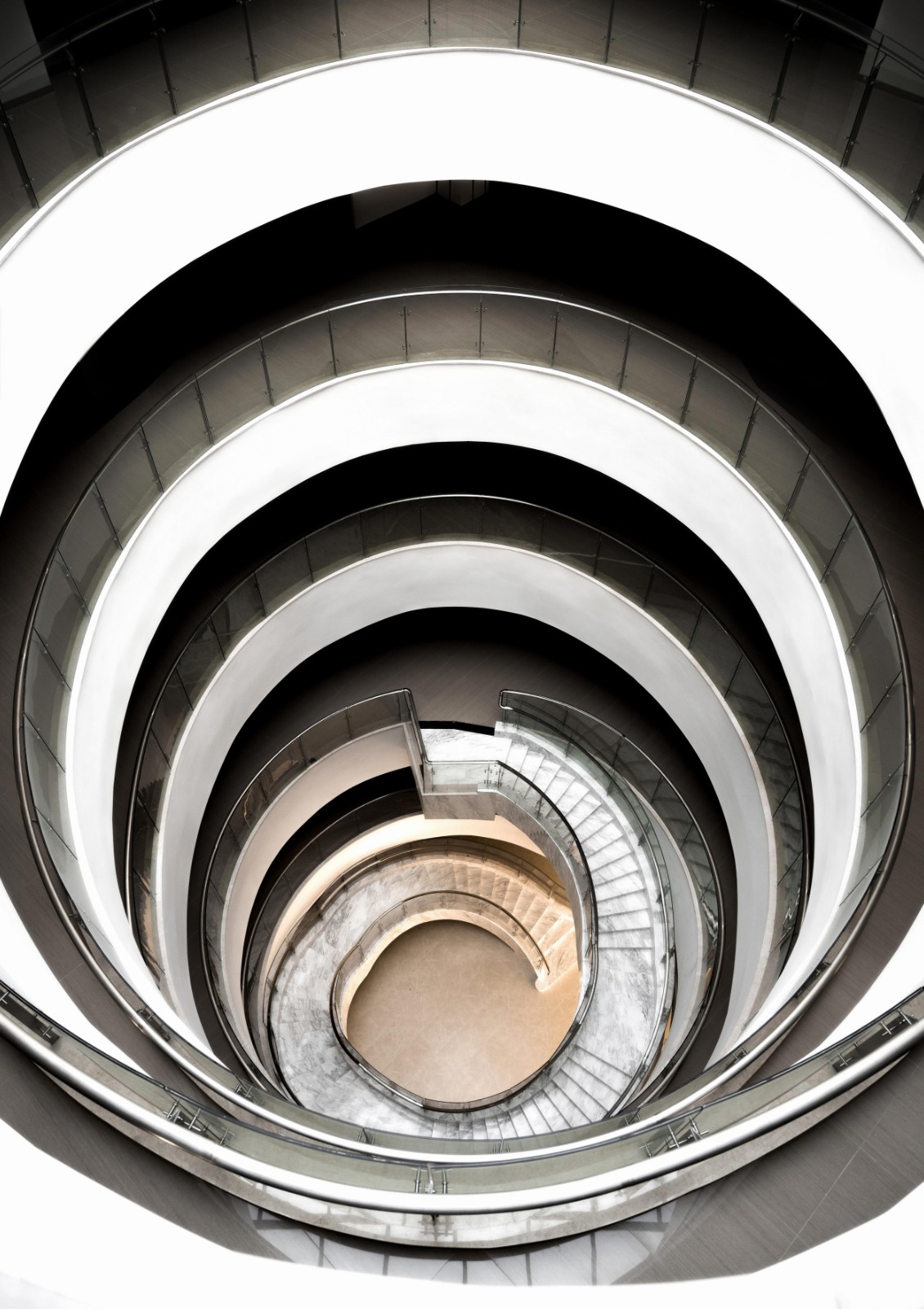 不同于传统方方正正的中庭样式,建筑的中庭空间由数个不规则圆形盘旋错落而成。中庭将自然光引入每一楼层的圆环中,带给人一种自然舒适的感觉。这种舒适感引导人们在中庭聚集,让人们在开敞空间中交流互动。中庭打破了楼层间的间隔,使整个建筑是交互的、流动的。设计师大胆的将独特的几何元素运用于中庭,使其显得时尚而自然,更是“方”“圆”组合的内化。设计师希望中庭的“圆”与该建筑整体的方形形成鲜明对比,以延续“方”“圆”调和的理念。在建筑物中以仰视视角观察中庭,天圆地方的阴阳调和观念更是让人深有其感。