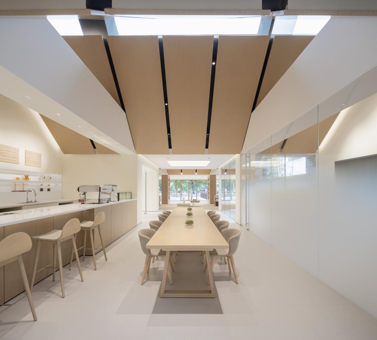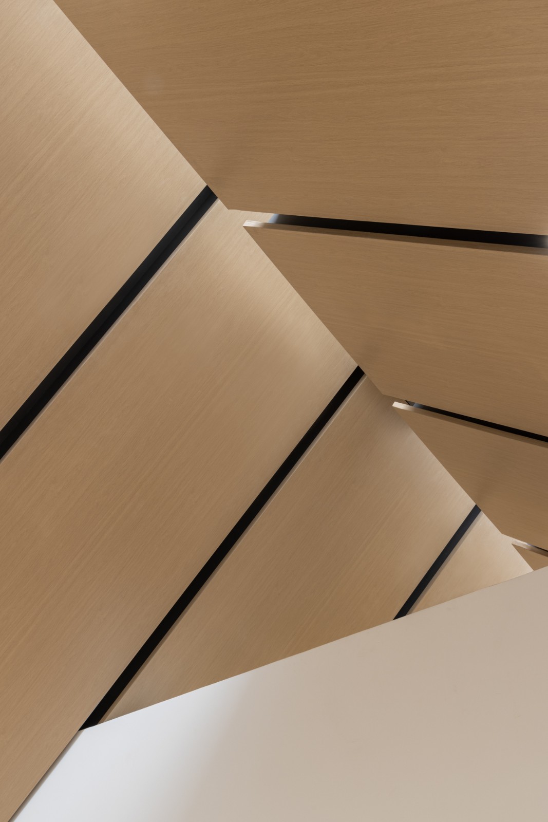 设计团队呼应原建筑坡屋顶用木纹铝板打造出一系列坡顶天花,与厚重的混凝土结构形成轻与重的对比。铝板相互独立,间隙内藏有轨道射灯和空调风口,顶点处分开成“人”字形,配合新增的条形天窗,将阳光引入室内。