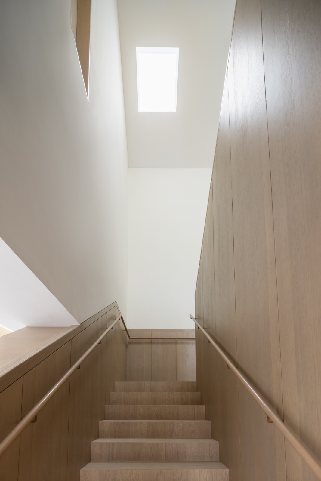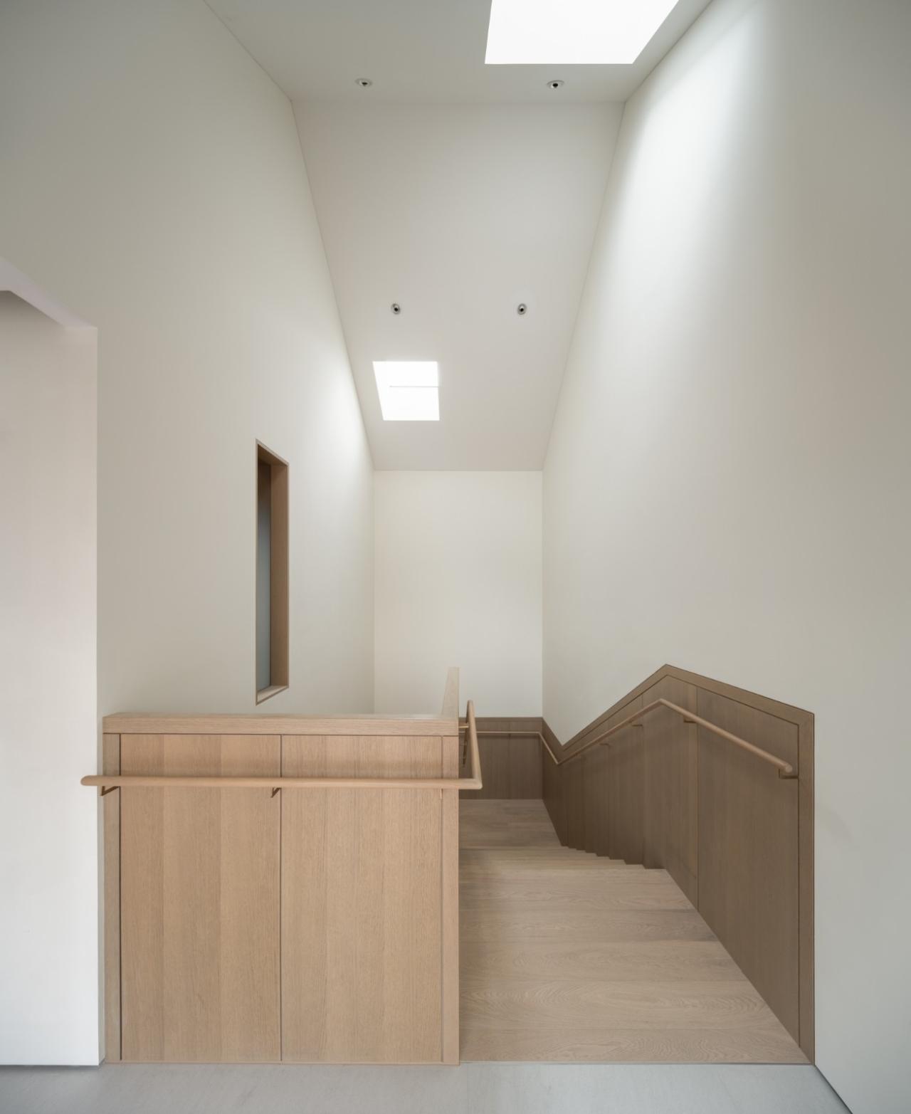 沿楼梯拾级而上,二层原有平屋顶区域经加固后变成户外露台。露台扶手用白色渐变夹膜玻璃制成,不仅有助于保护访客隐私,还能柔和地界定内外边缘,为建筑立面增添雾气般的朦胧诗意。