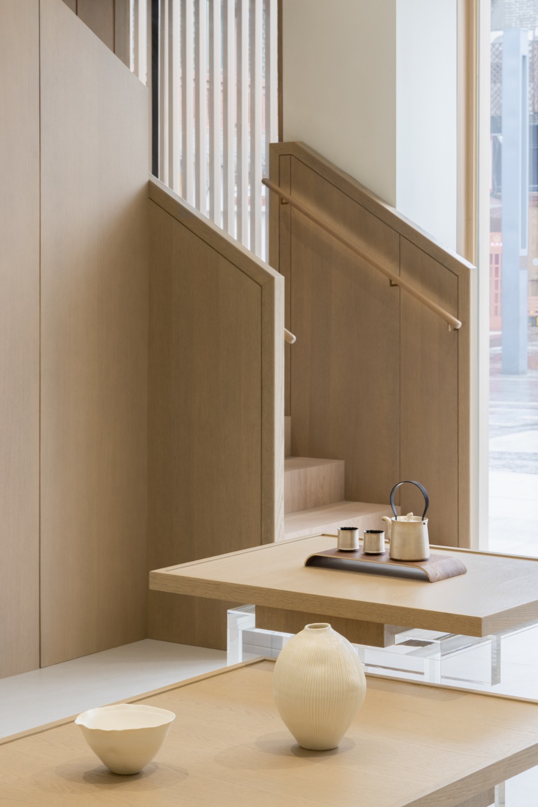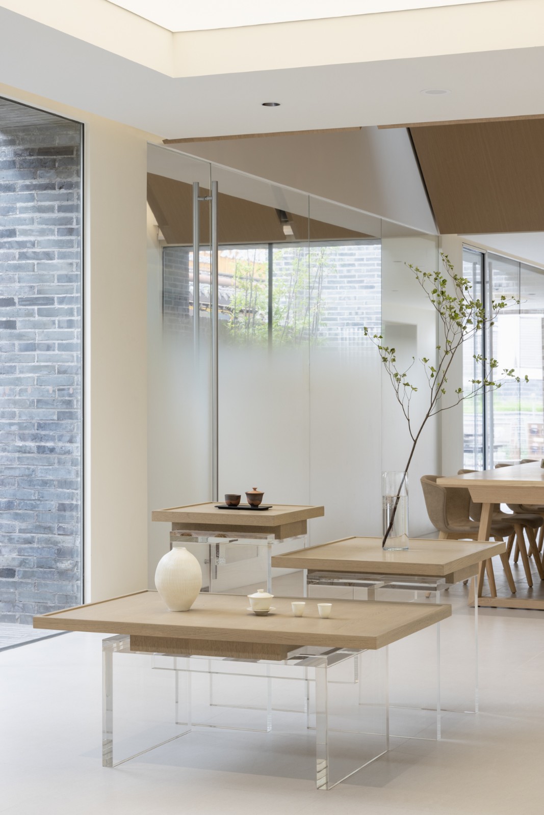 一系列不同高低组合的落地展台亦采用轻重对比的理念进行设计,展台台面仿如一个个漂浮的木托盘,与透明的亚克力底座通过镶嵌的方式结合在一起,不仅视觉轻盈,也用现代的方式呼应了传统榫卯的细节。