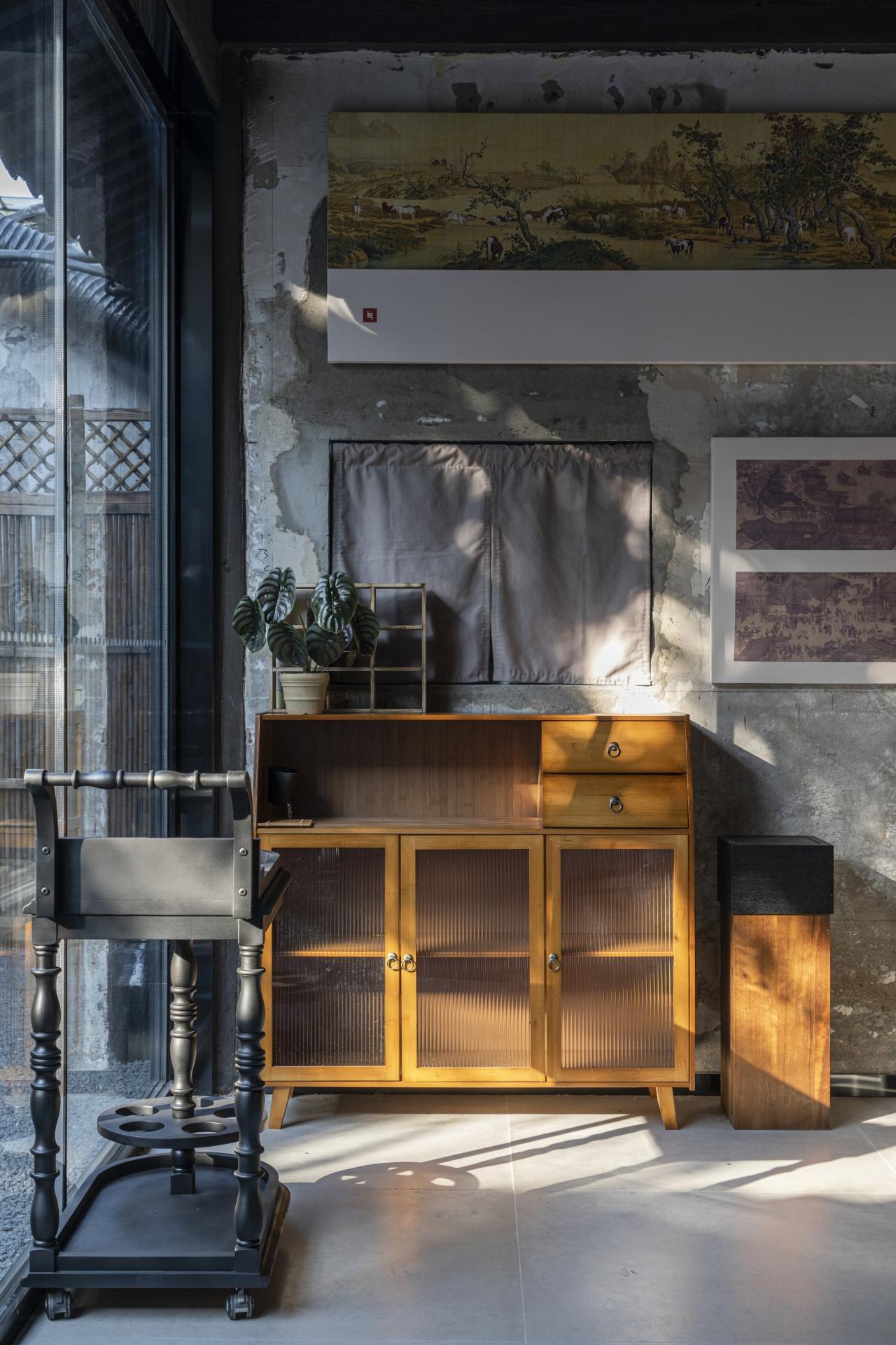 室内、建筑与自然在相互界定中融会贯通,形成一个可以相互渗透的空间结构。我们对原有院落中的墙面、门窗、屋架、铺地等构造系统进行了整理与修复。设计建设过程中避免使用与地域及历史时代不相符的现代工业材料和处理方式,在此基础上,把通透属性的落地玻璃墙嵌入砖混结构的承重柱里,使得室内外动静的变化随时保持着沟通与互动。