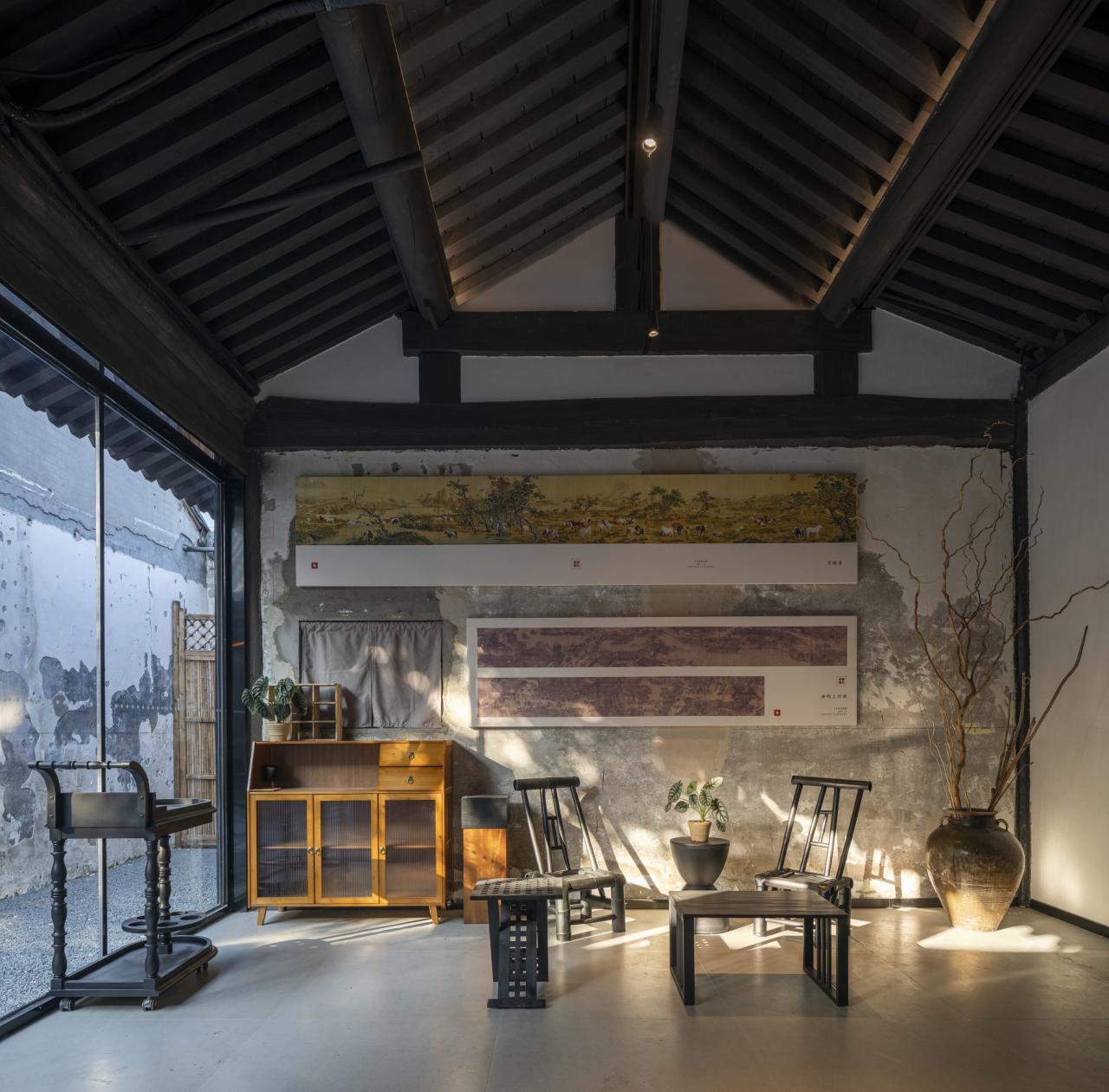 主厅拆除多余的隔墙,仅以木质架构作为支撑形成开敞式空间,沿轴线徐徐展开。空间是一个载体,它会被承载的一切影响着也会让不同的思考者有着不同的体验。我们希望保留原生环境中这种质朴的“钝感力”,来访者透过原始墙壁斑驳的肌理可以真切地感受这座建筑的过往。