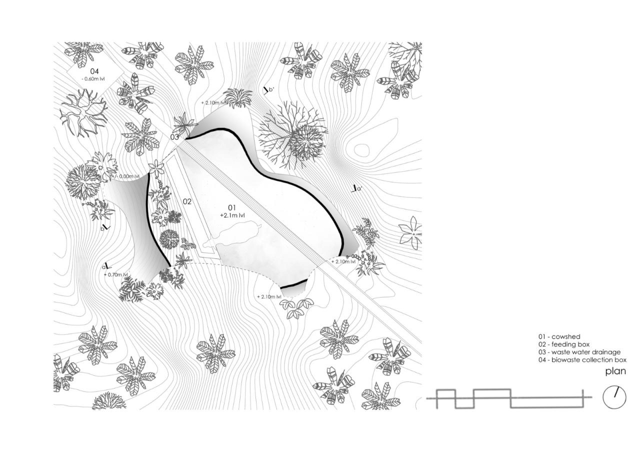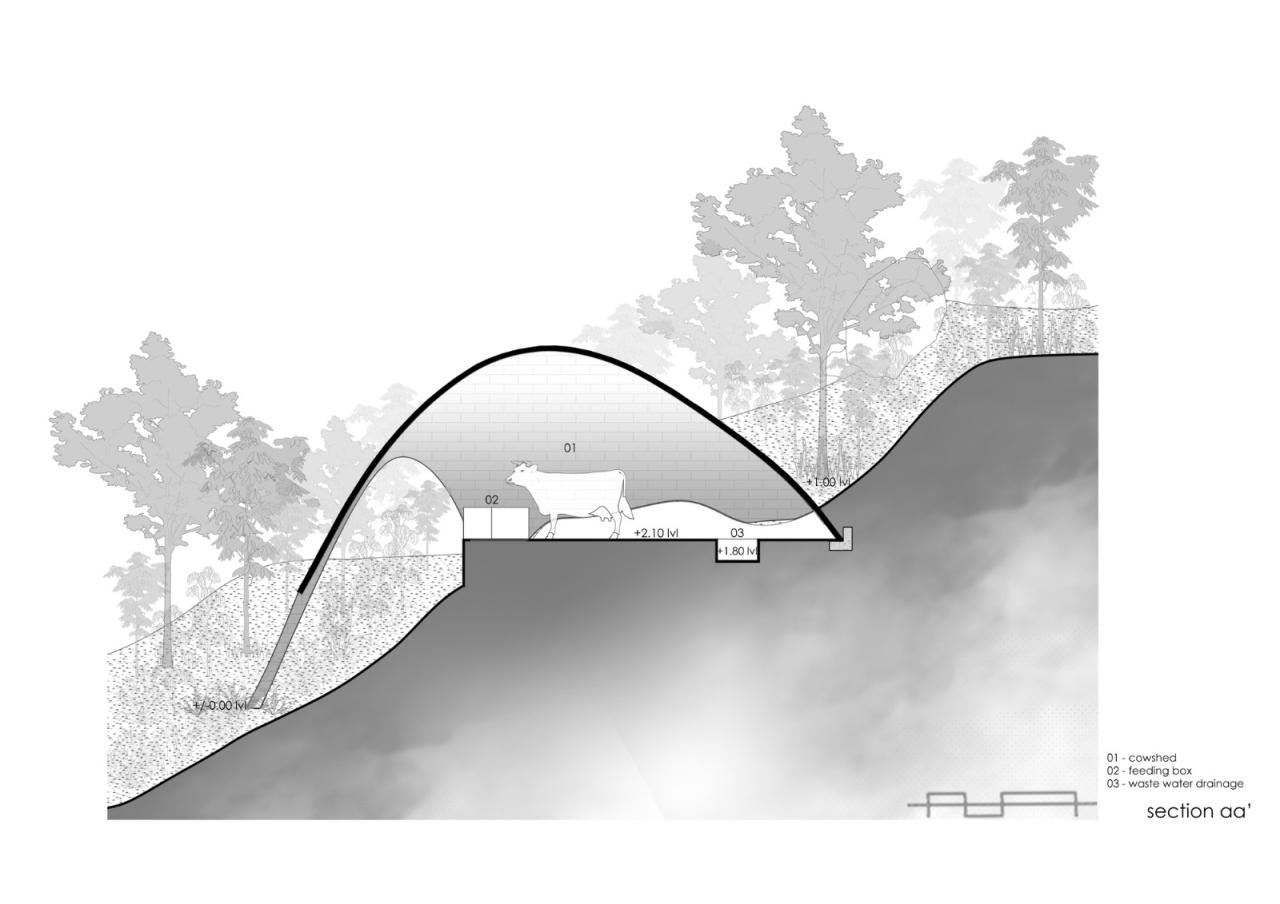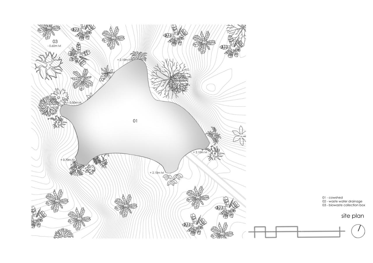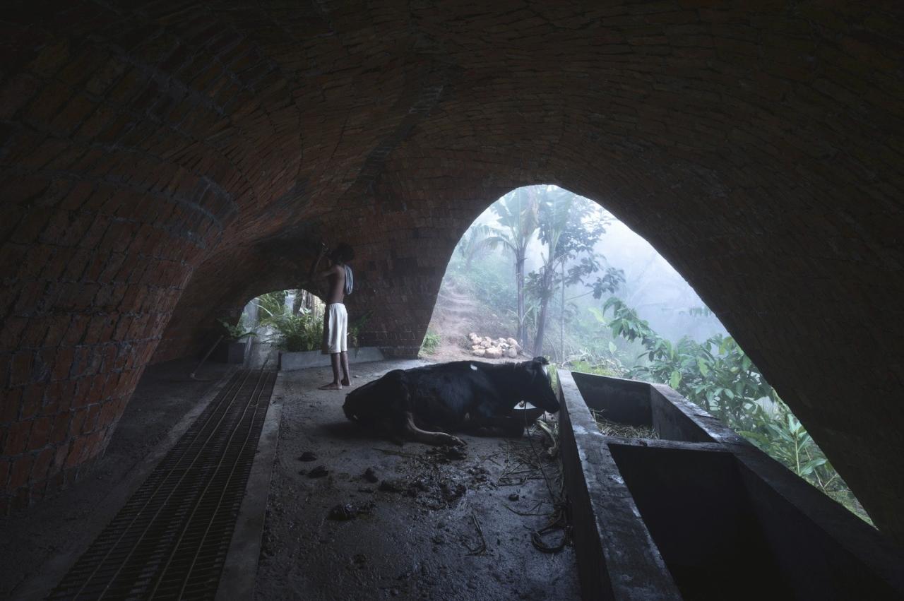 在建筑设计上有实验性尝试让我们感到兴奋,这也有助于我们更好学习。这种实验性的灵感来自我的建筑导师 Ar. Vinu Daniel。我们在坡地上设计了一个实验性的薄壳拱顶结构作为牛棚,这一结构技术以我的导师Ar. Senthil Kumar Doss 的悬链式拱顶结构为依据,他在印度是薄壳拱顶的先驱,并指导了整体项目执行。