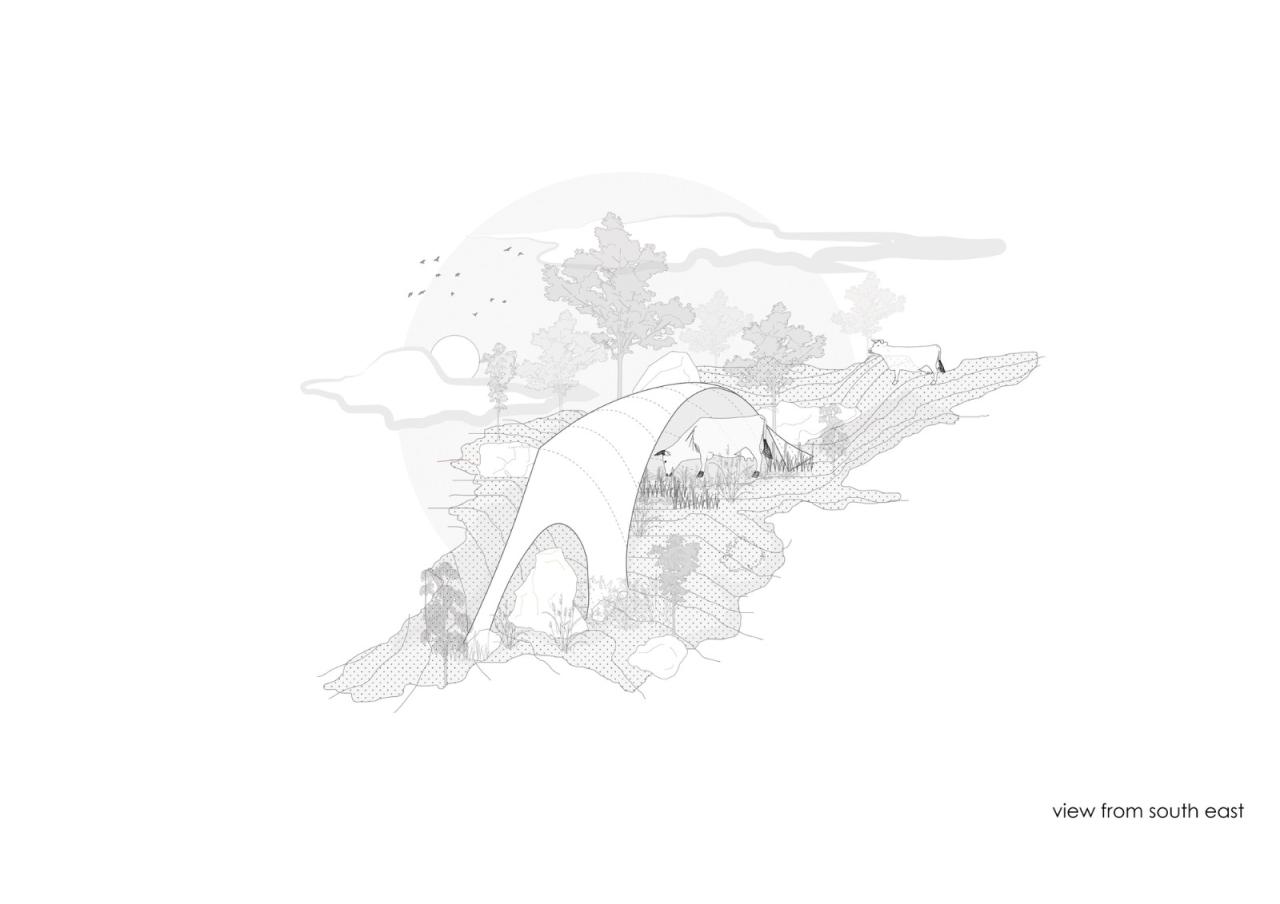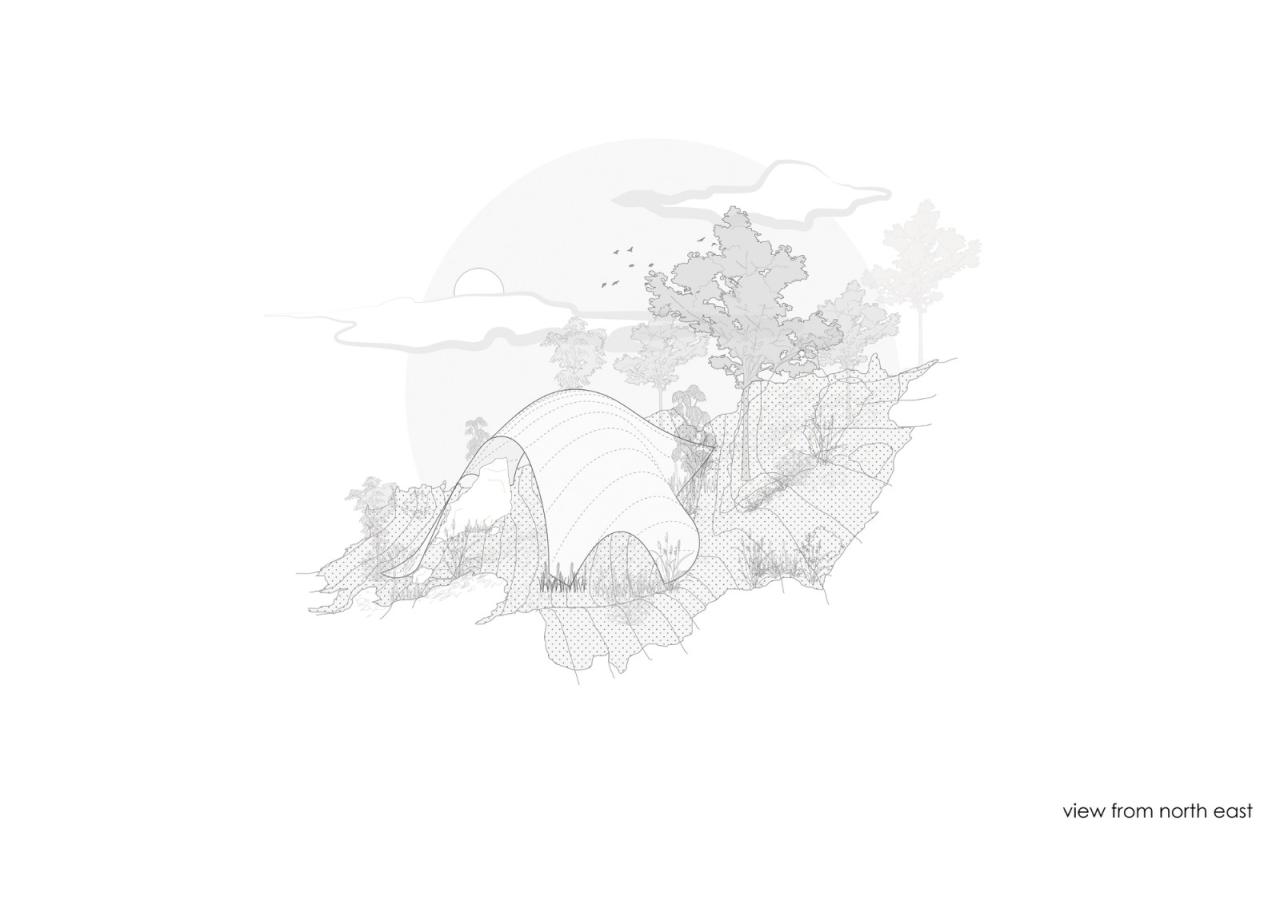此外,考虑到场地的强风和降雨,拱顶中的开口设计有助于将雨水引向深谷。该结构源自 Kangaroo physics 引擎,考虑到场地表面并施加载荷,产生表面的最大弹性,使其成为稳定的受压结构。现有的排水管被保留,穿过建筑排出雨水。尽管因为大雨天和陡坡建造遇到了挑战,施工总共花费了 3 个月。