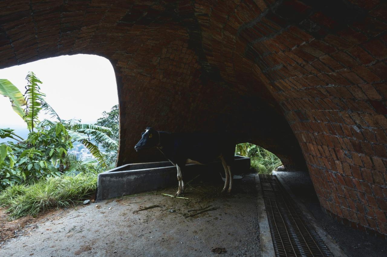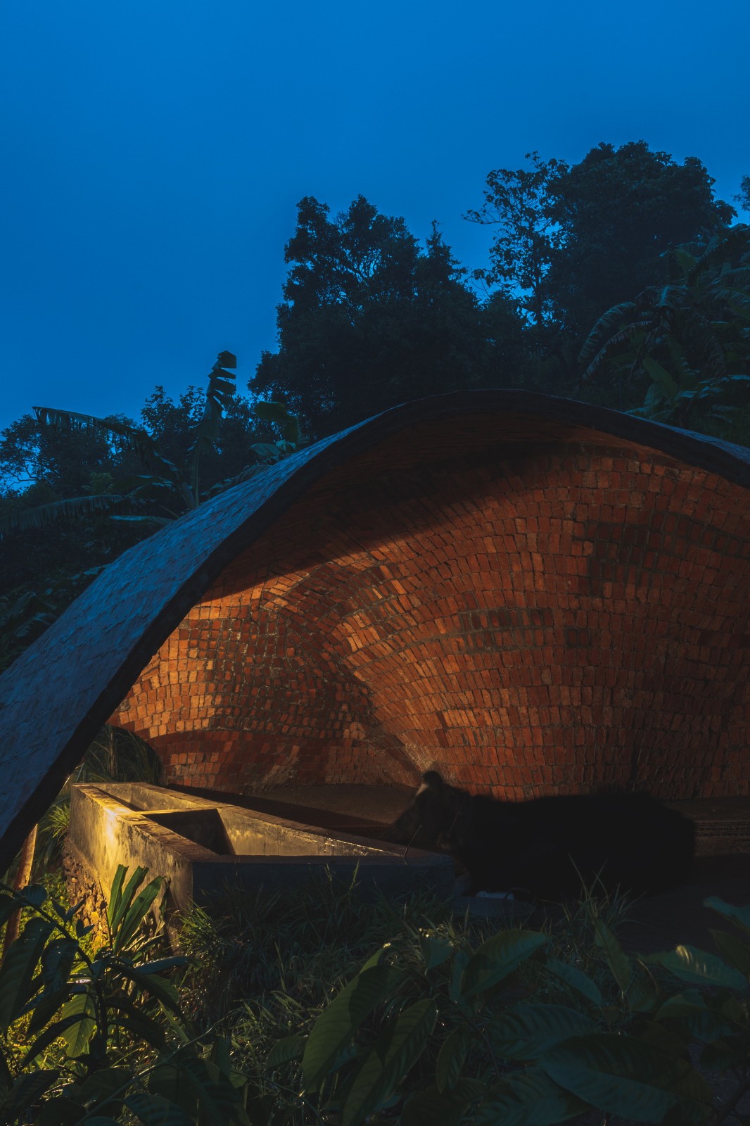 为牛棚搭建拱顶的构想是使用当地易得的材料以降低成本,不使用钢材或混凝土以自己的方式实现可持续。重复利用的杆件、木麻黄和竹子用于结构支撑。拱顶的四个锚点分别位于 0 米、0.70 米和 2.1 米的不同高度,限定出场地内的地平面,。四个不同高度的悬链拱在棚下创造了永恒的体验,由三层 25 毫米厚的“Sithu kal”(小砖块)搭建成,这些都是在附近 40 公里半径范围内可以找到的本地材料。悬链拱最大跨度为 6.6 米,拱顶最大高度为 3 米。