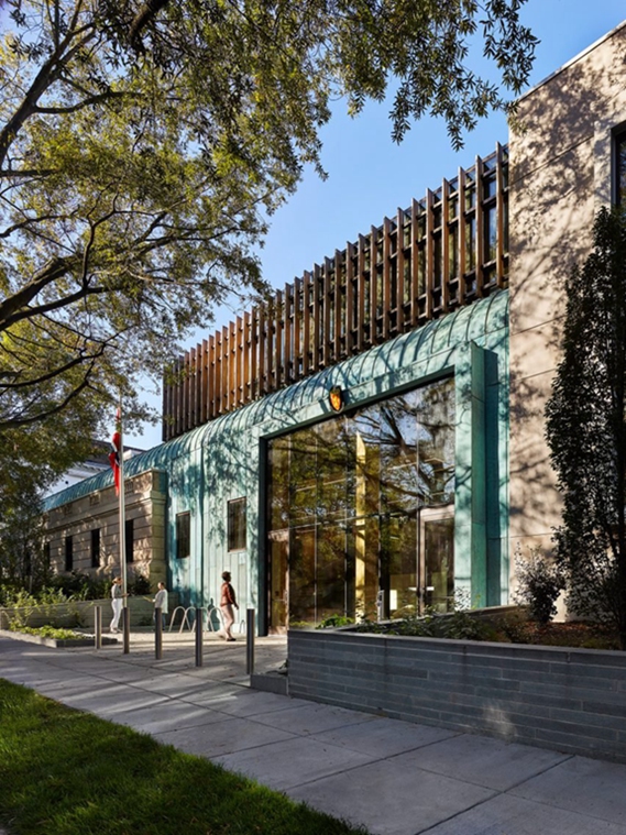 美国芬特雷斯工作室(Fentress Architects)使用铜材和大量木材对挪威驻华盛顿大使馆进行了重新配置,该大使馆已对外开放。