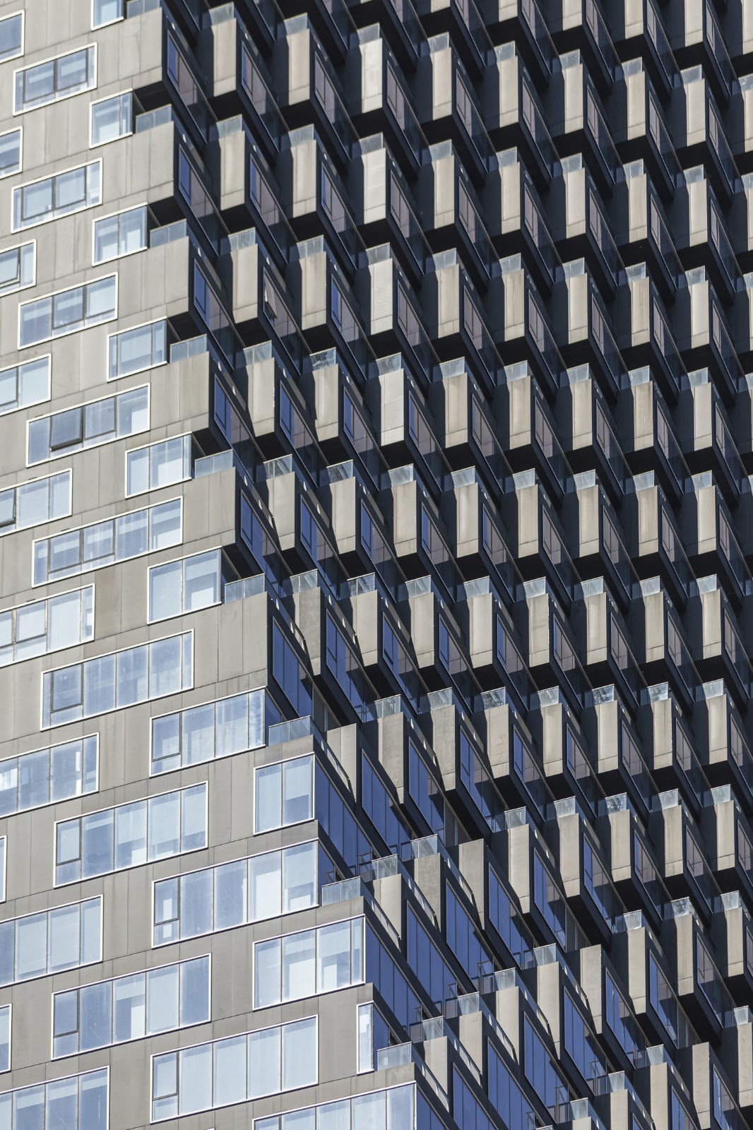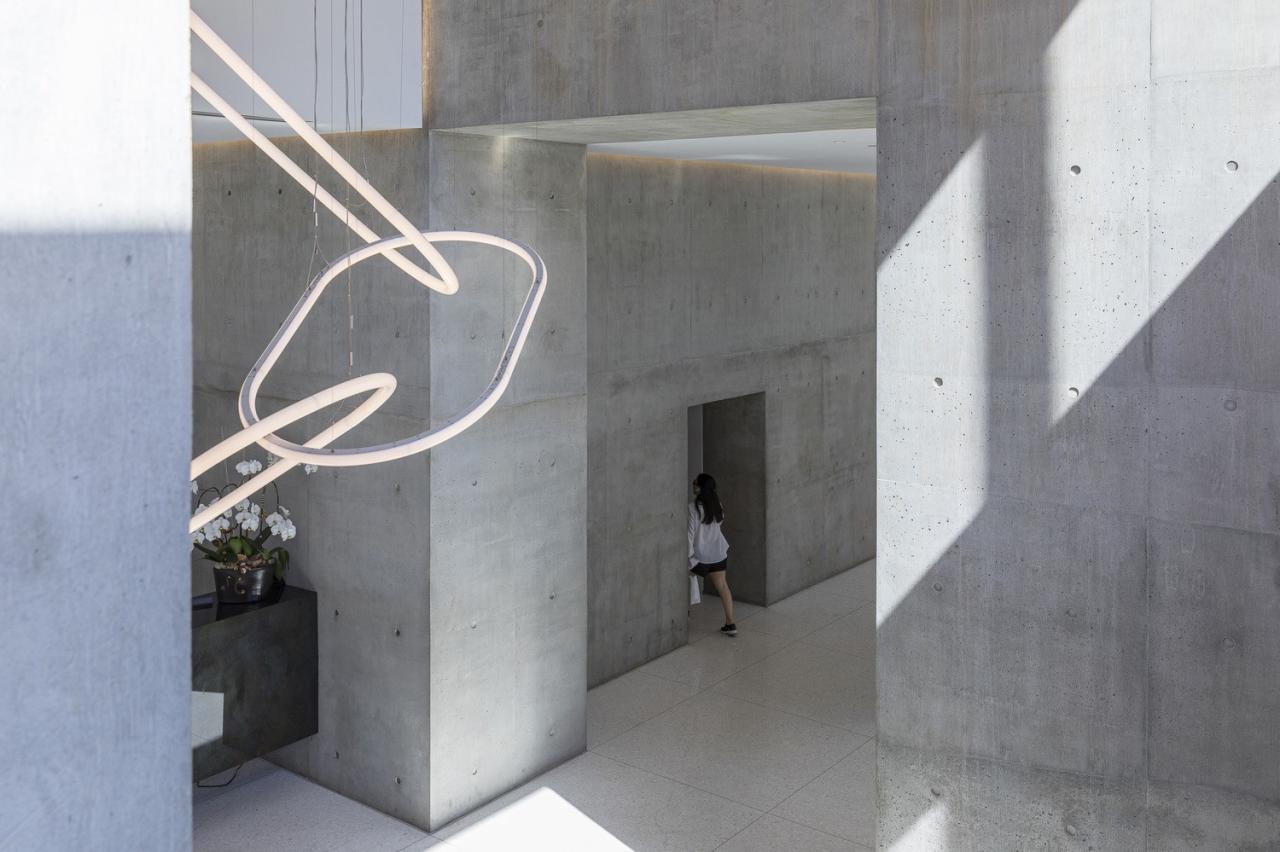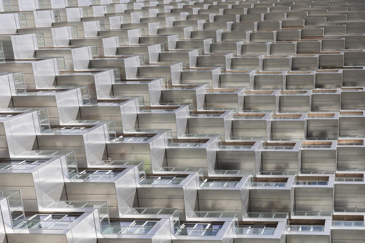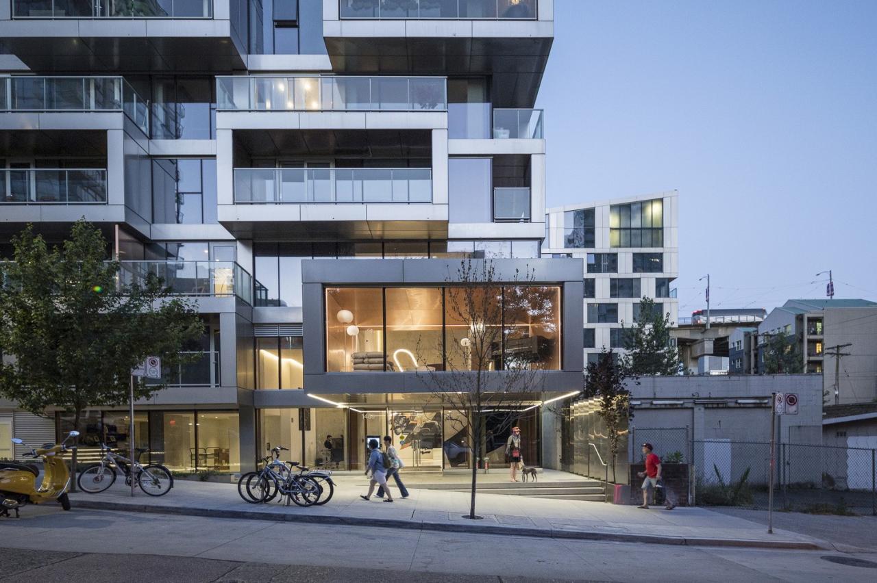 塔楼沿着地面层的正交性、借由对角线的移动创造了像素化的立面,为住户提供了露台和阳台空间。主入口上方的立面像素则延伸到了场地之外,创造了一系列的檐篷、平台和交织于拐角处的休息室空间。而在夜间,由 Douglas Coupland 打造的 15000 平方米“北极光”艺术装置则会照亮塔楼的南北立面,使其成为卡尔加里最大的公共艺术作品。