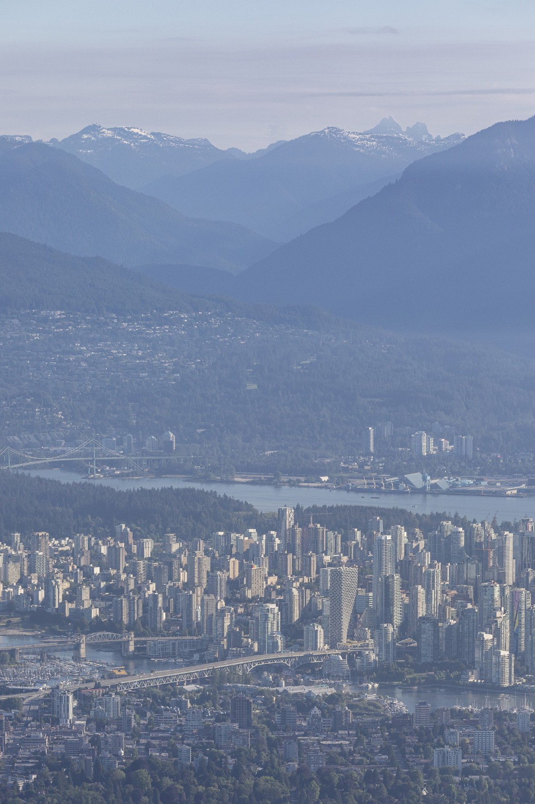 塔楼地处温哥华的主要入口,毗邻格兰维尔桥和邻近的公园;这也意味着该地段存在着些许城市限制与挫折- 余下的仅是一块狭小的三角形场地,几乎无法进行建造。与桥梁 30 米的距离被定义为建筑物在空中达到 30 米之前所应保留的最小距离,而建筑高度超过 30 米后的部分可以重新溢出,这使得建筑师能够将楼板面积翻倍。由此,温哥华之家巧妙地从地面升起,并随着高度的升高而扩展,使人能从视觉上感知到温哥华的自然环境广度。其看似超现实的姿态实则是对所处环境的高度响应,即塔楼被环境所塑造。