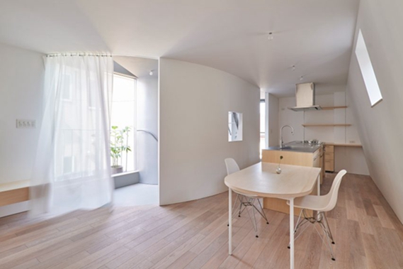 小野说:“‘山谷’两侧的大小房间都有各种形状和高度的开口,可以直接看到外面的风景,也可以看到‘山谷’表面的风景。”银色油漆覆盖了整个空隙的内部,以将光线反射到更深入的“风景收集屋”中,而生活空间则以朴素的白色墙壁和木质地板为特色。