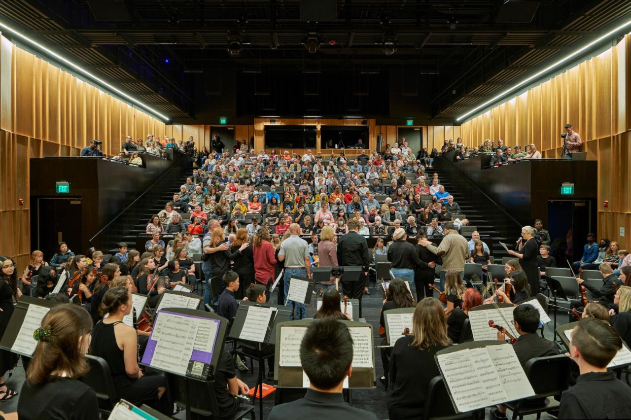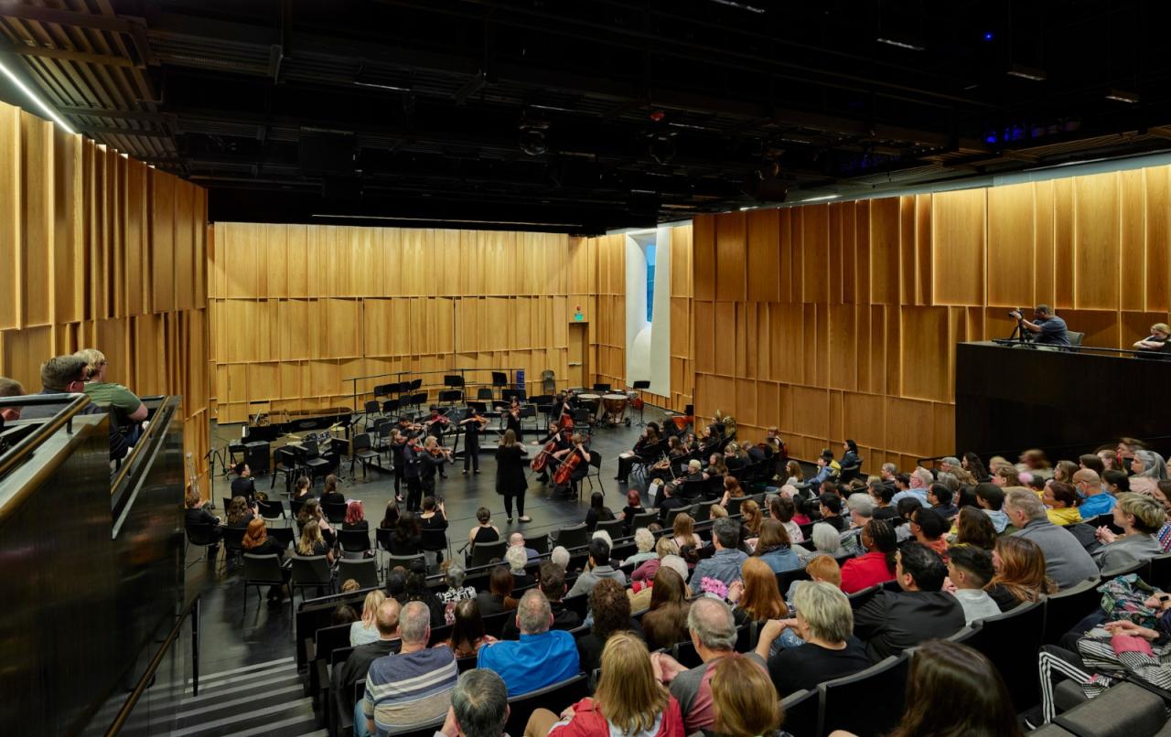表演楼(2021 年 11 月)。 按照校园总体规划的设想,表演楼位于主校区的西北角,凭借其位置,对公众的可见度很高,在维护校园安全的同时,也成为一个吸引人的社区中心。该建筑支持各种表演艺术的教育课程,包括音乐、戏剧和电影,所有这些都可以随时进入一个世界级的表演场地。多样化和高效的空间分配推进了学校作为即兴创作、实验和发挥想象力的舞台的使命和身份。宽敞的空间与富有表现力的顶棚创造了一个强烈而温馨的街道。它们远远超出了建筑的主体,并通向一个天窗入口。除了多色金属外壳升起时露出的两侧玻璃外,3 个表演厅中只有一个大窗户点缀着外部外壳。从这里可以看到校园和原来的 Thaden 之家,这个具有纪念意义的窗户在内部甚至显得更大,它将柔和的间接光线带入了原本密封的表演厅。从舞台直接连接到房子的后面,表演厅是一个多功能的、专业的创意表演场所。