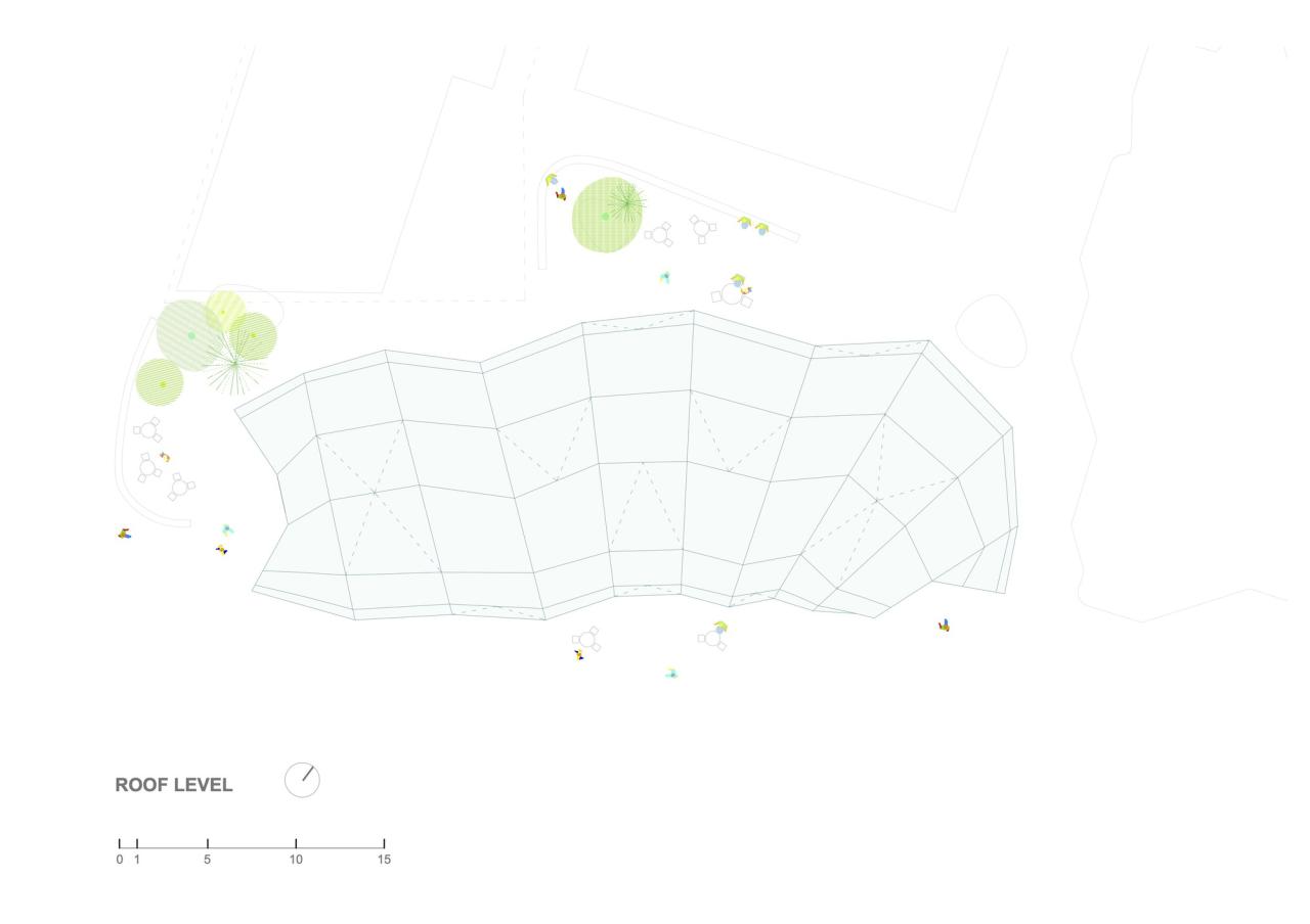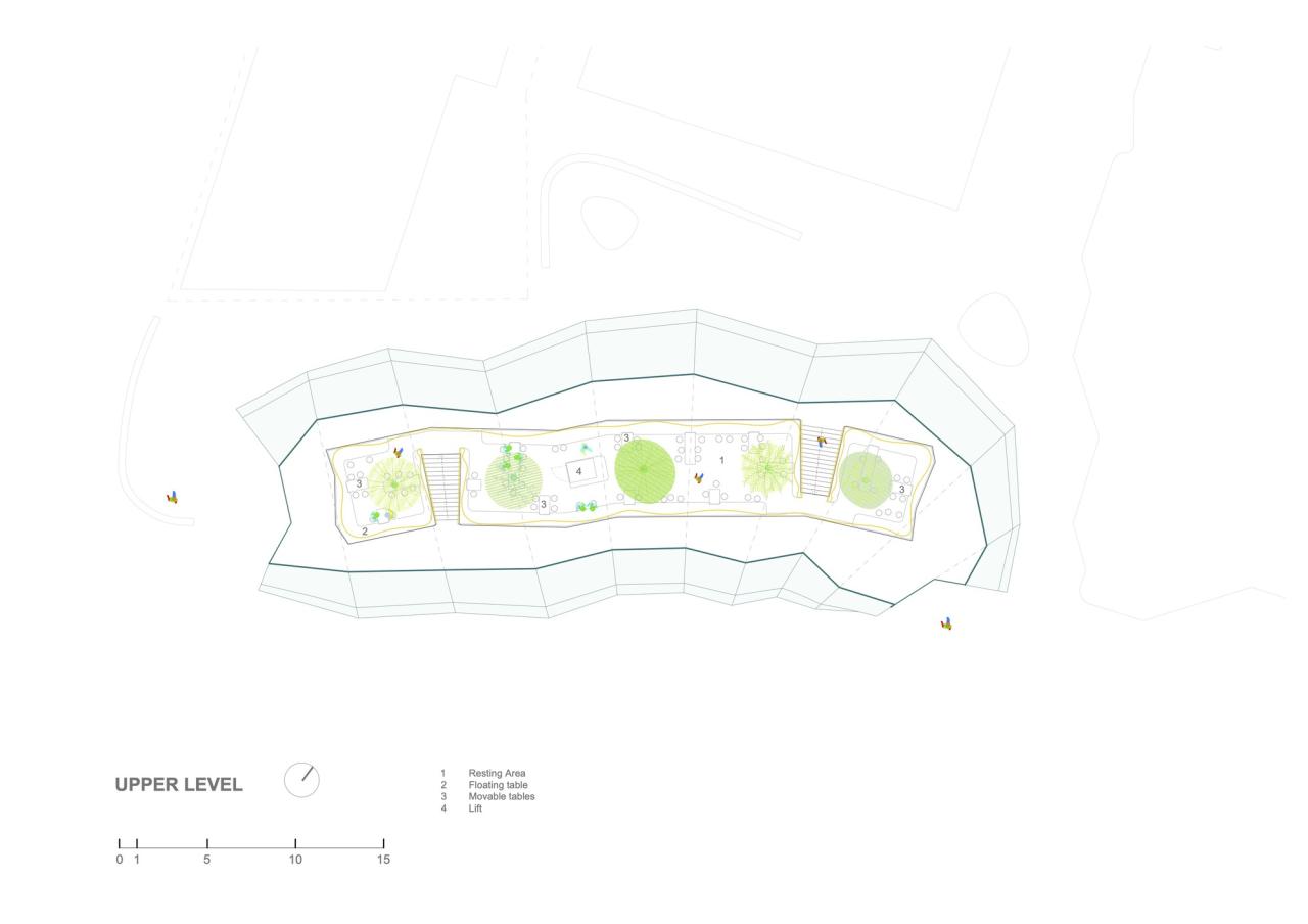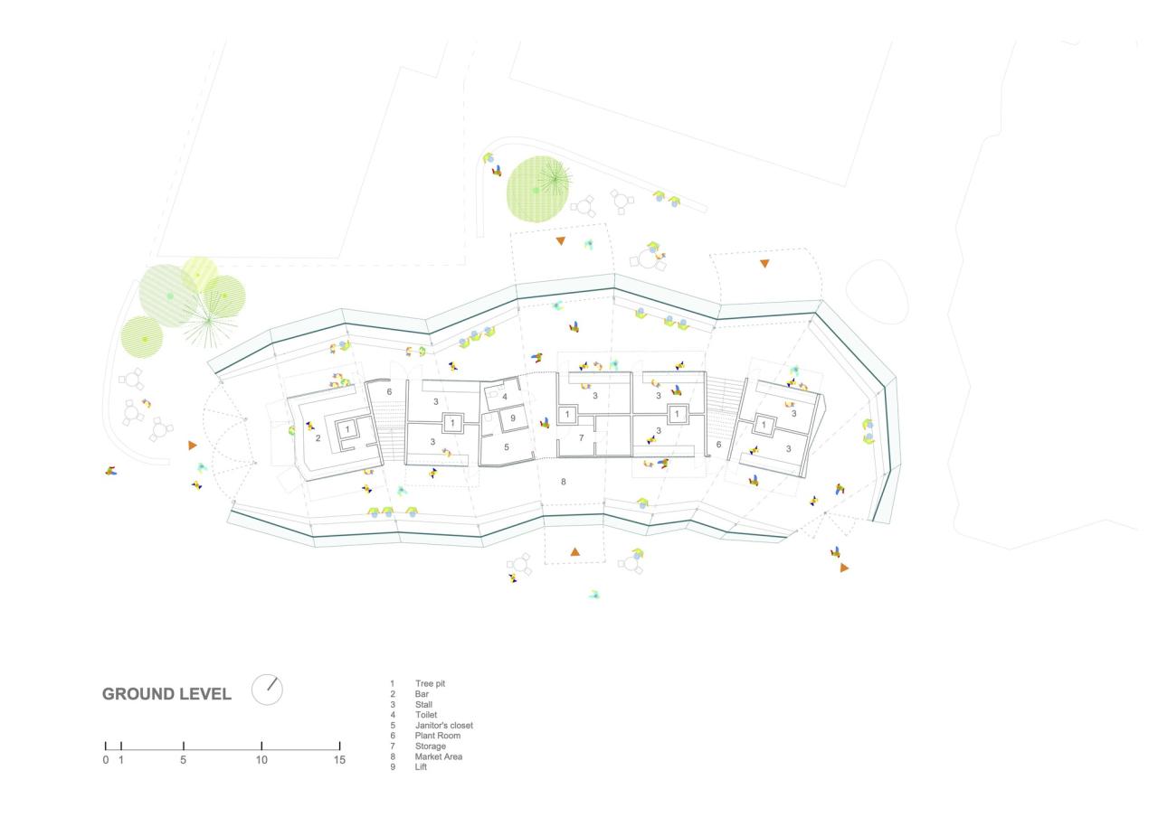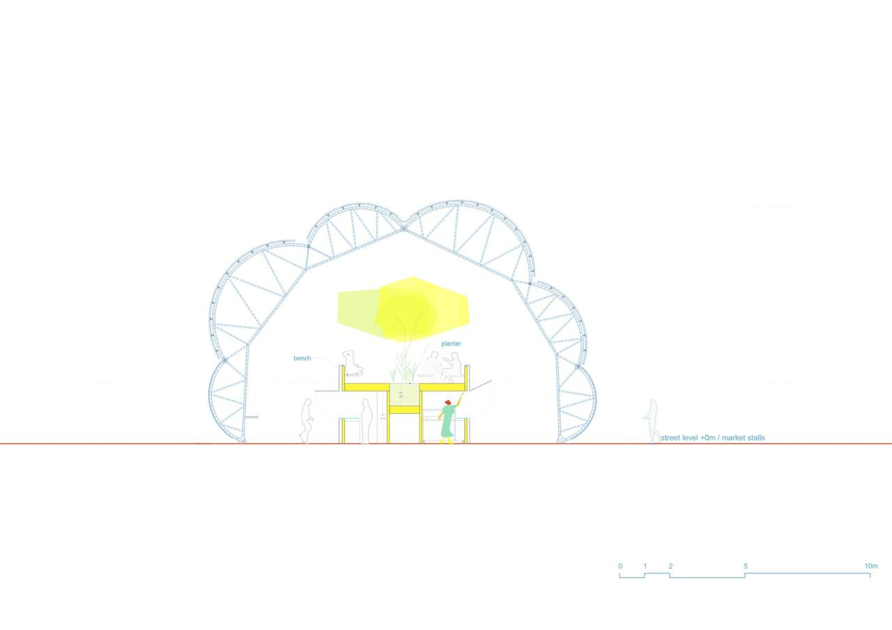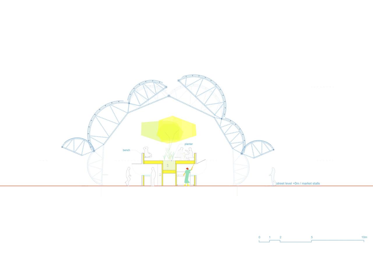 摊位处于透明脊柱地面层的各侧,座位区位于其上方,且正好处于树冠下。整个脊柱结构采用了半透明的背光材料和 ETFE 膜,作为照亮市场的大照明灯,使其在夜间熠熠生辉,成为邻里街区的焦点。