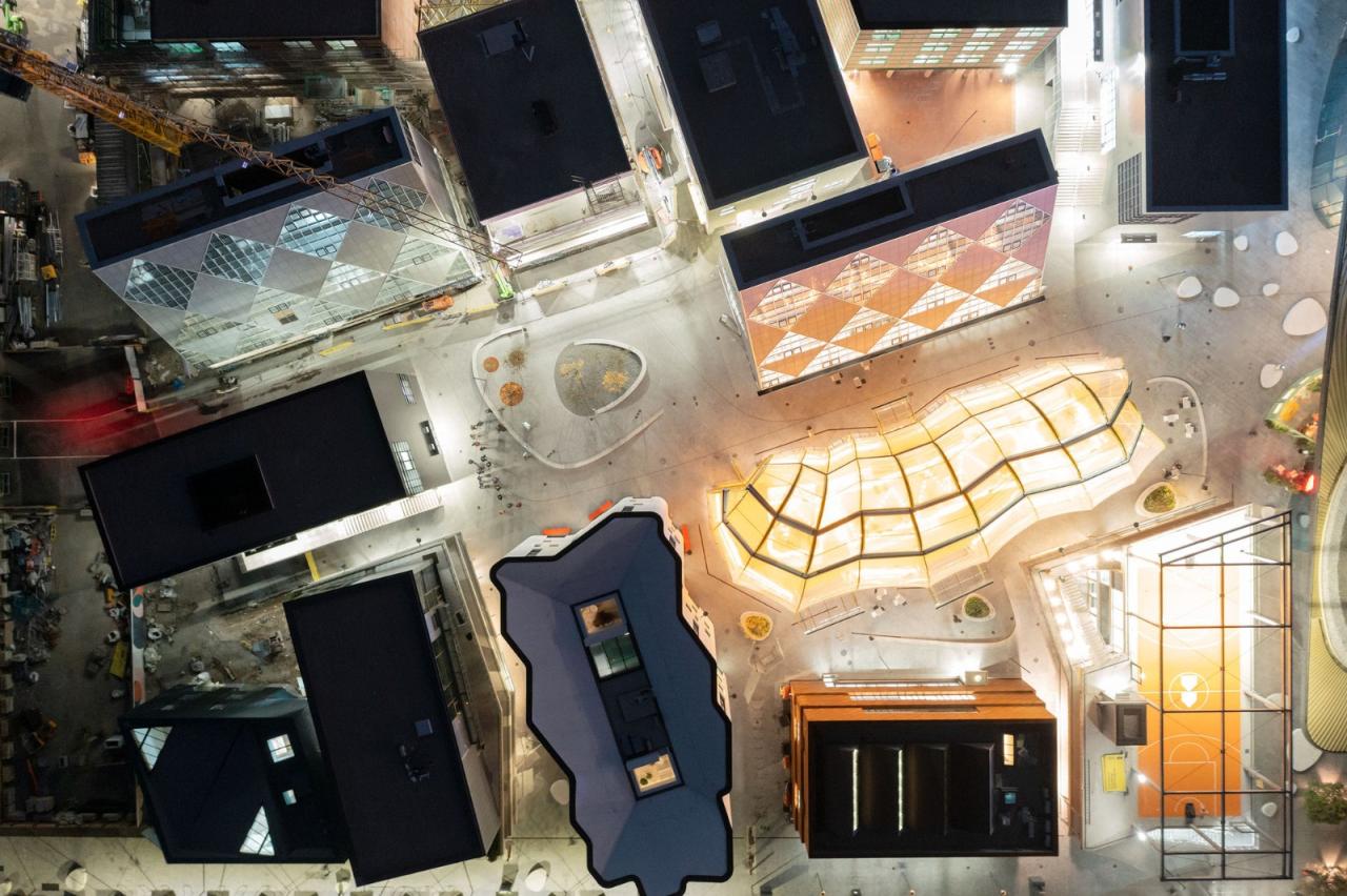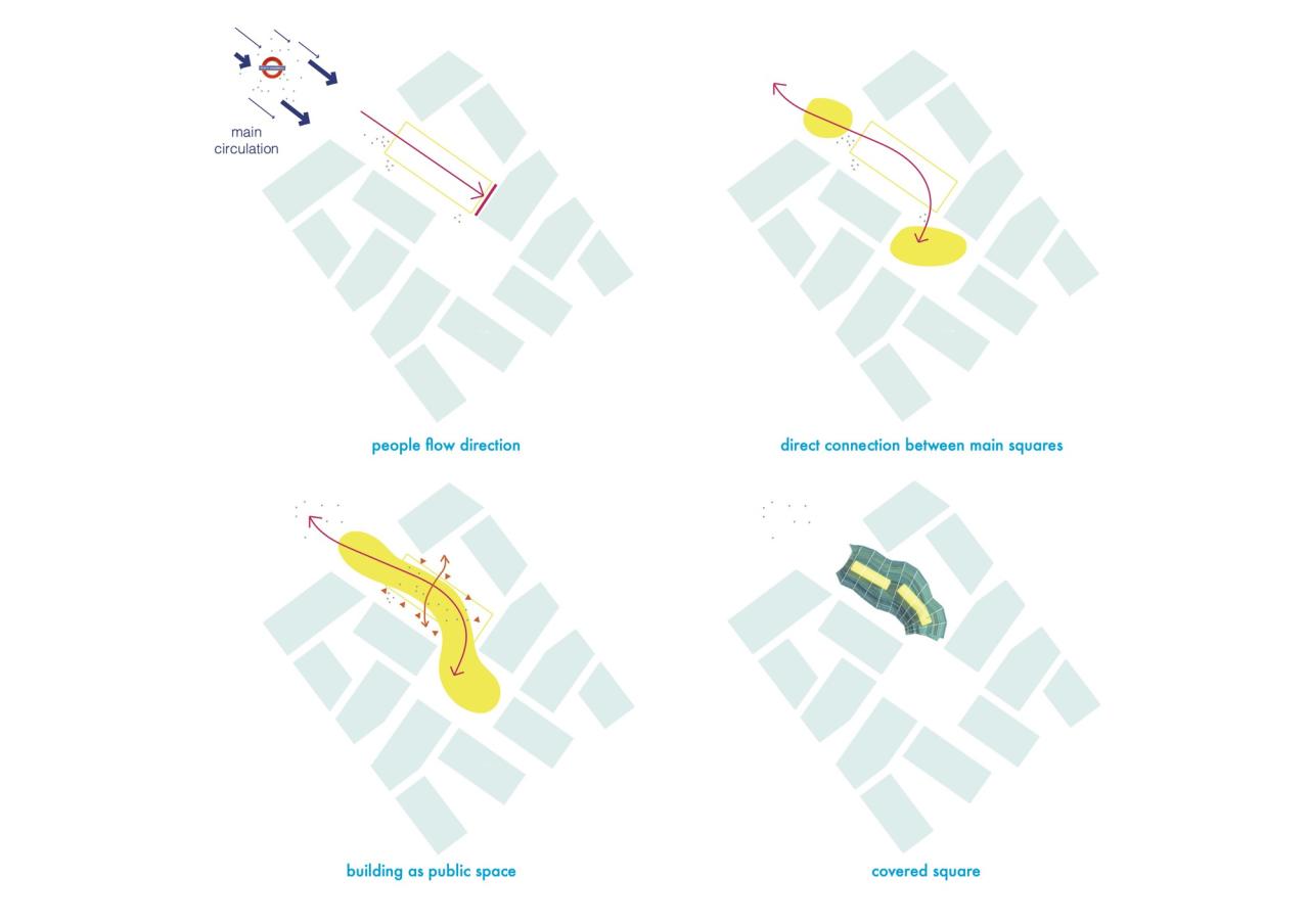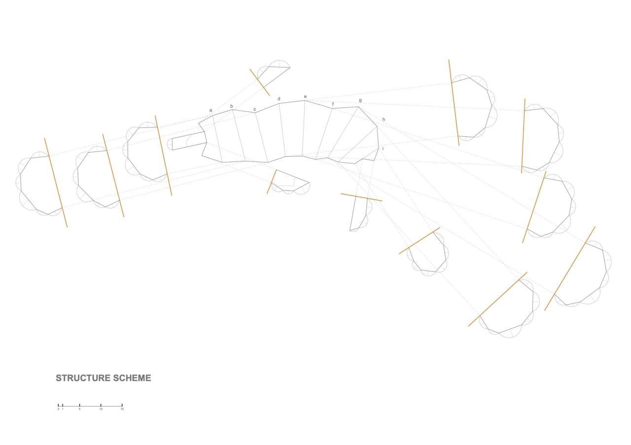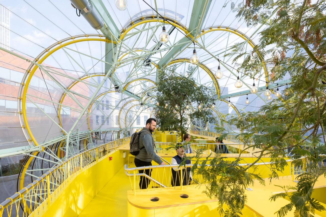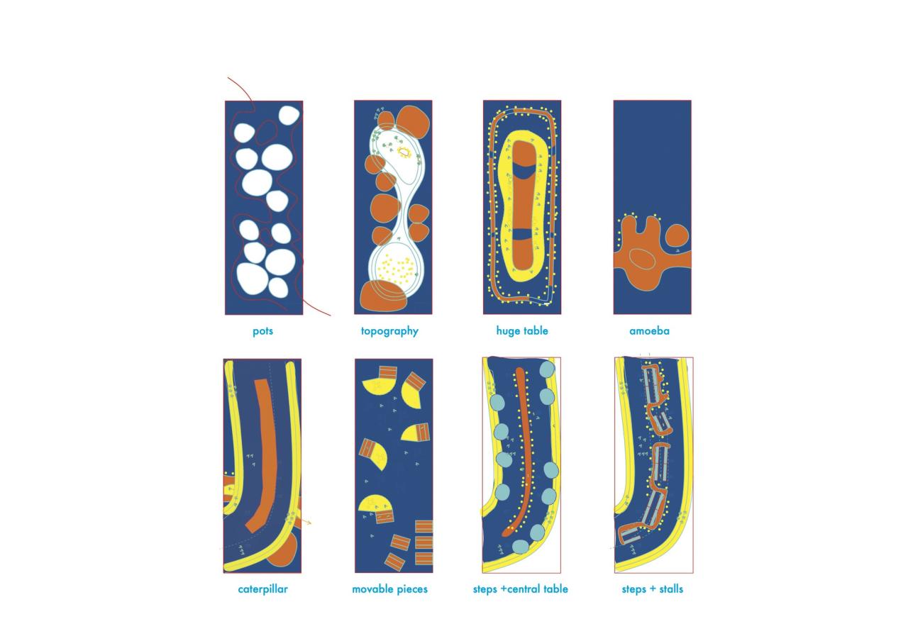 摊位处于透明脊柱地面层的各侧,座位区位于其上方,且正好处于树冠下。整个脊柱结构采用了半透明的背光材料和 ETFE 膜,作为照亮市场的大照明灯,使其在夜间熠熠生辉,成为邻里街区的焦点。