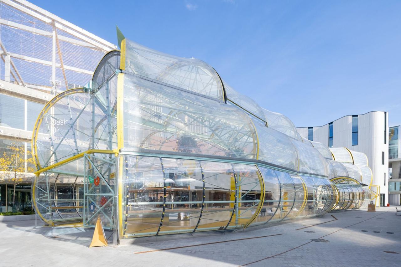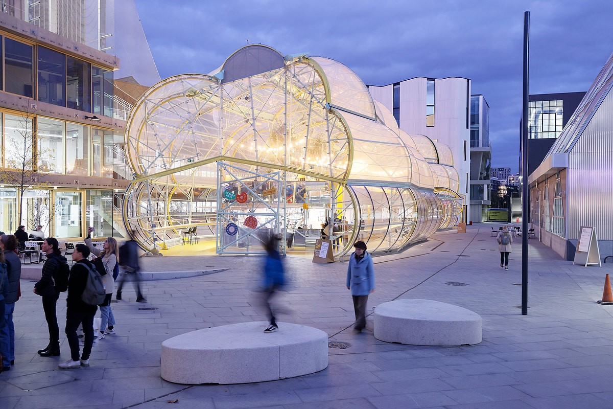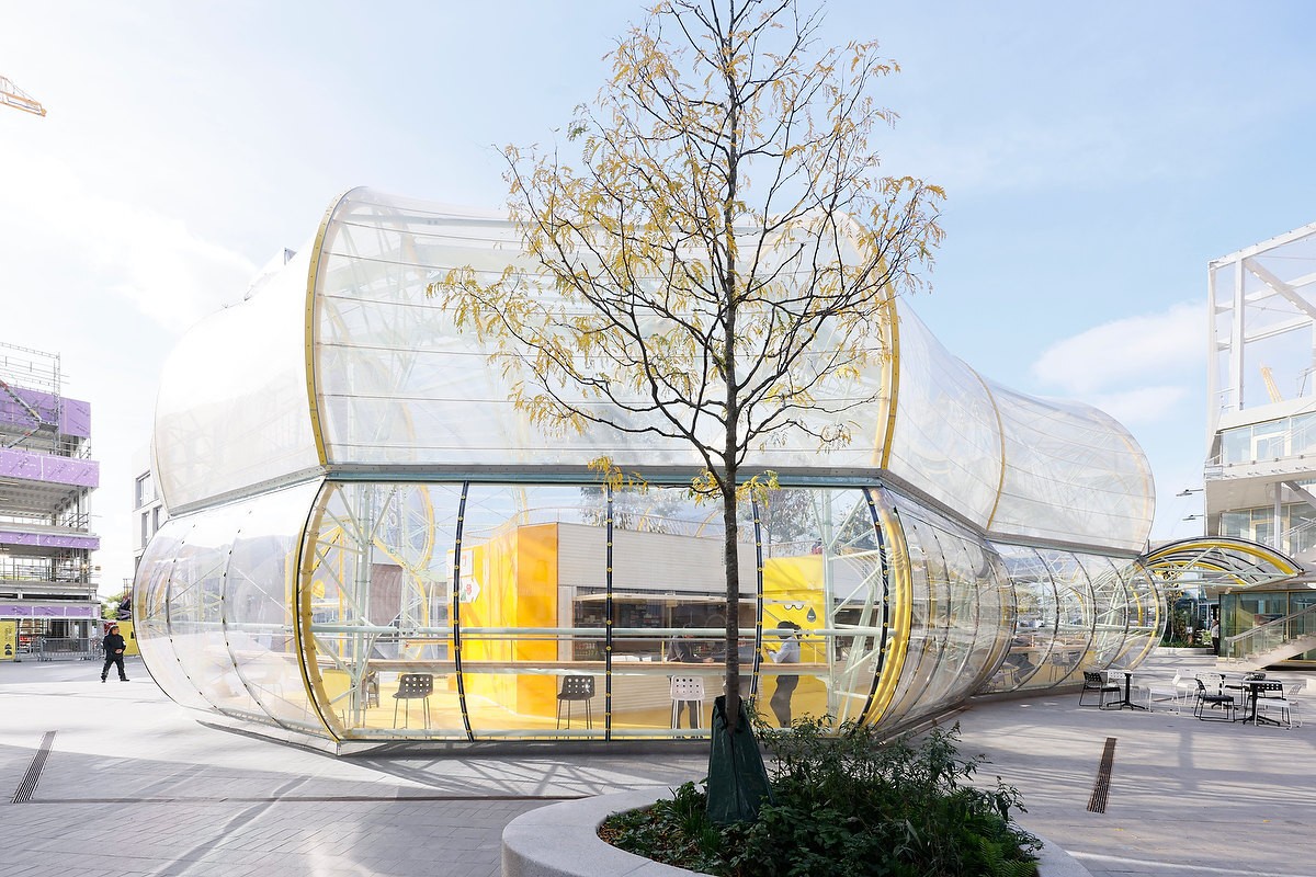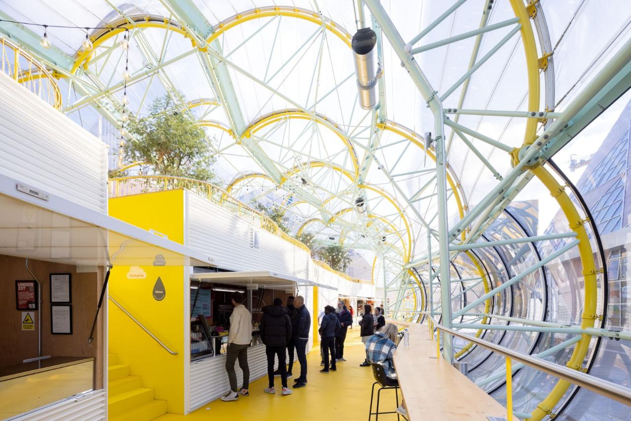 市场通过尽可能透明的状态来彰显其亮眼的形态外观。建筑师采用了一个非常轻质的金属结构,并以绷紧的透明 ETFE 膜覆盖结构的中央脊柱,并在其中设置了摊位和座位区。这一透明脊柱就是市场本身。