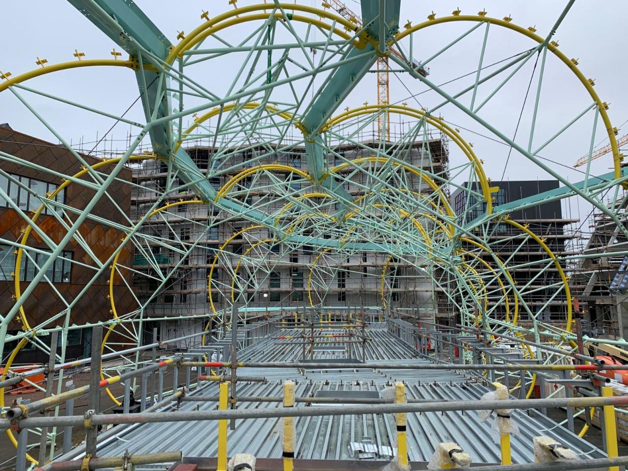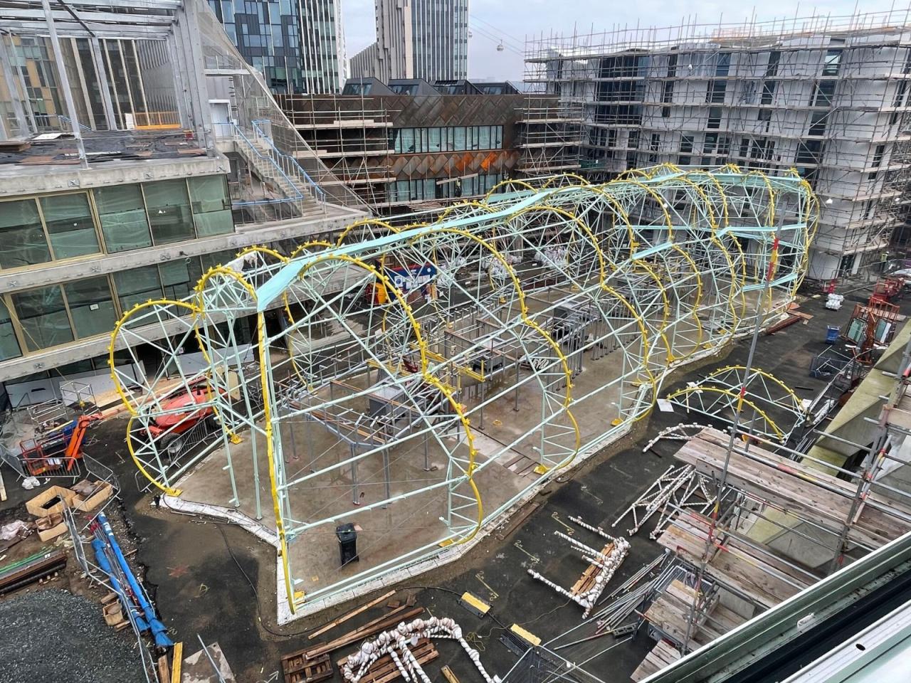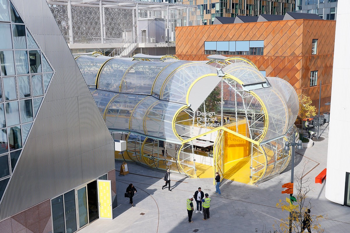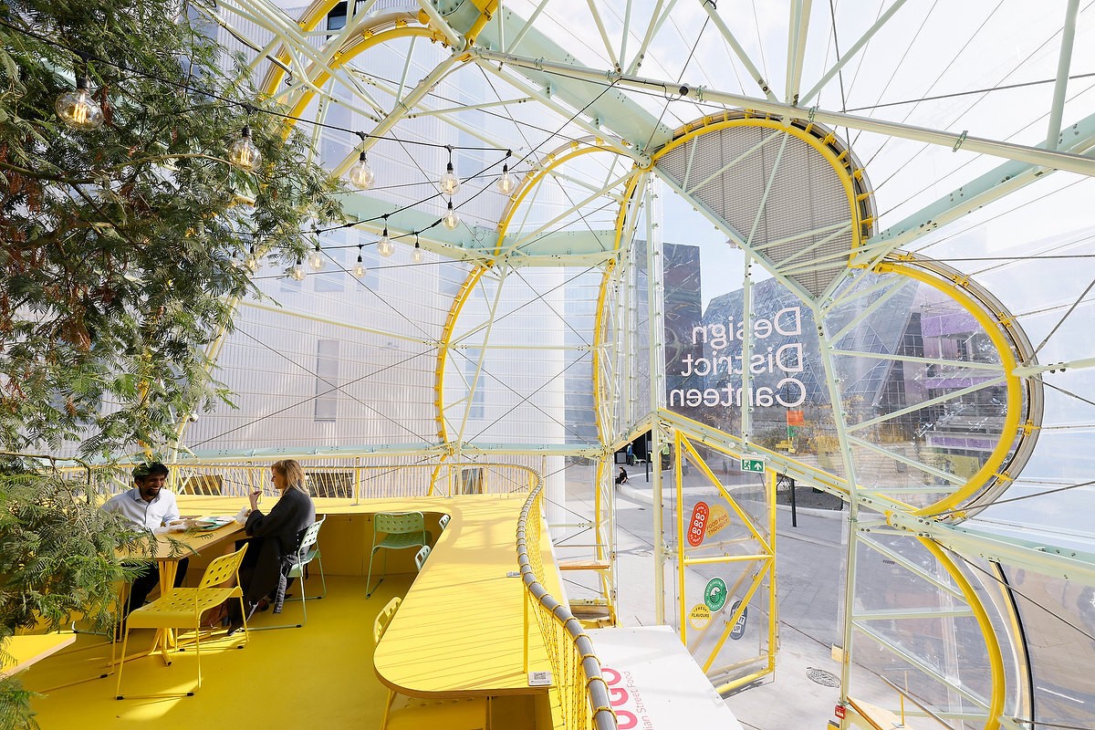 市场通过尽可能透明的状态来彰显其亮眼的形态外观。建筑师采用了一个非常轻质的金属结构,并以绷紧的透明 ETFE 膜覆盖结构的中央脊柱,并在其中设置了摊位和座位区。这一透明脊柱就是市场本身。