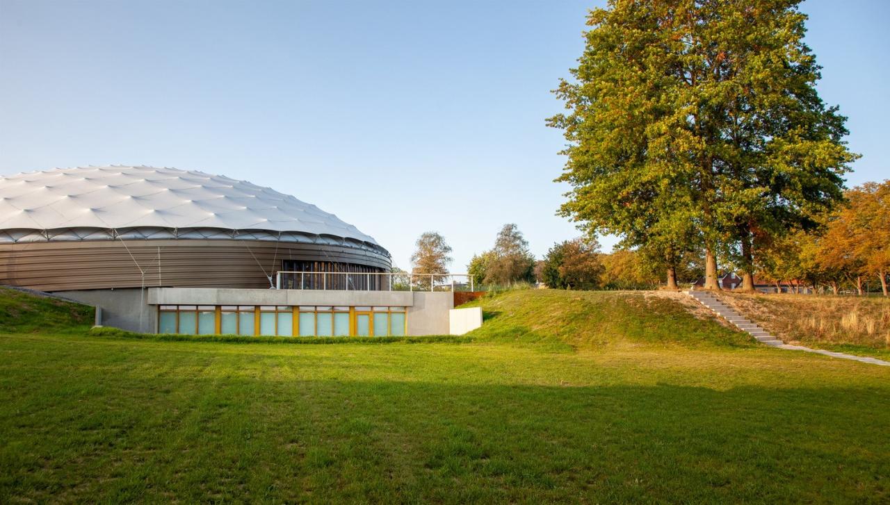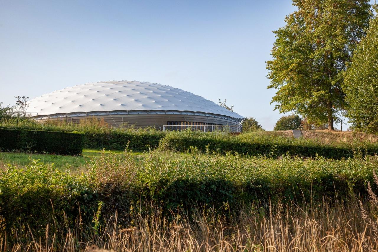 引人注目的 Shaded Dome赫鲁斯贝克Shaded Dome的外形是一个被拉长的穹顶,由轻型织物构成,隐喻在市场花园行动中布满天空的降落伞。建筑坐落在一个平坦的山顶上,略微向山谷倾斜,同时在该方向上削减体量,形成醒目的入口空间。办公室和仓库位于地下,上部空间留给餐厅,在这里可以远眺山谷——当年盟军各师就是从这里开始向德国进发。