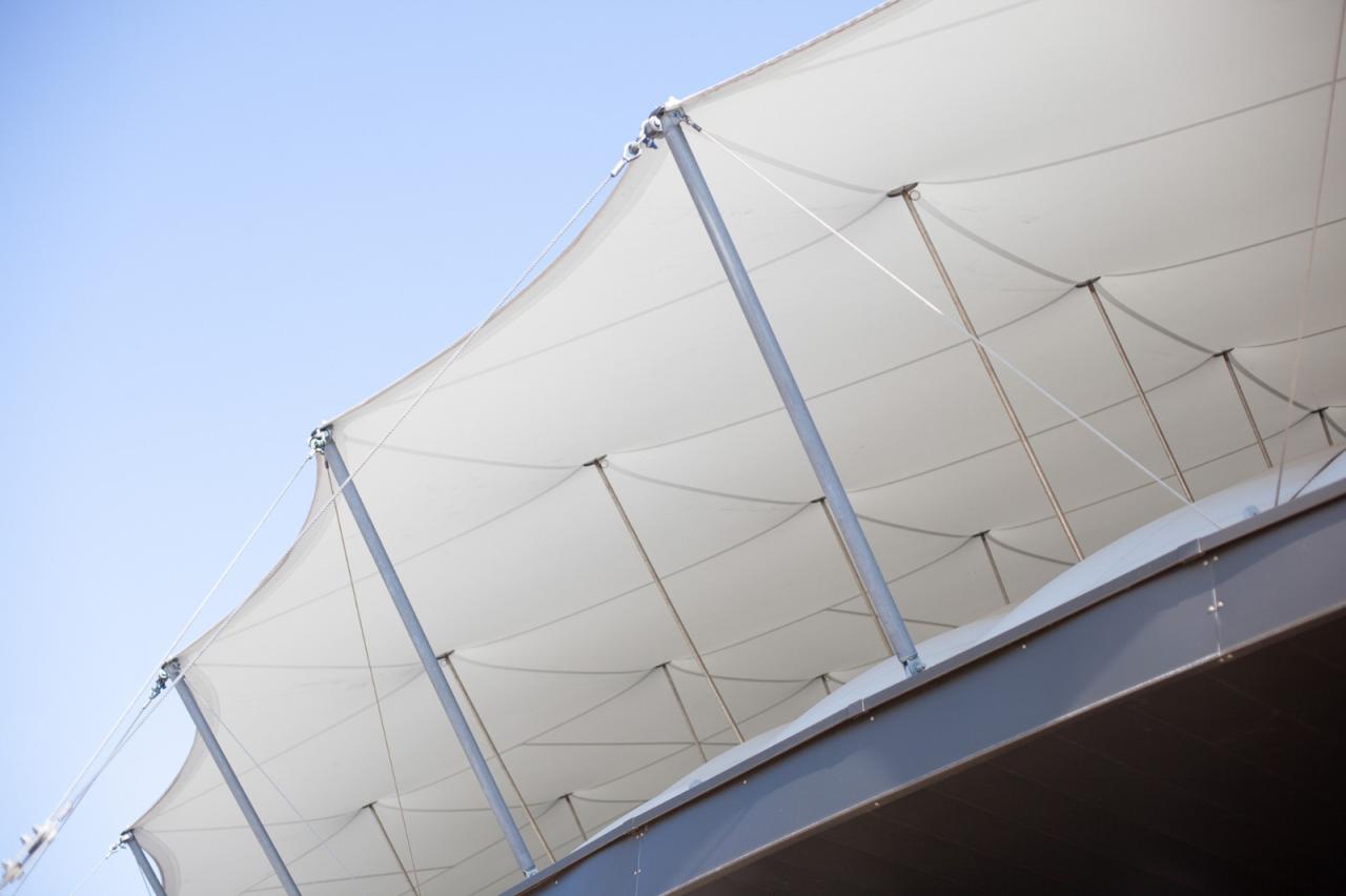 当屋顶充气时,自动对准的撑杆就会竖起来,在它们之间形成一个空腔,加快空气流通,并自然而然带走太阳辐射产生的热量。相比于传统膜结构,Shaded Dome 这种双层织物加 50 厘米空腔的结构,能够用更少的能耗创造健康舒适的室内环境。