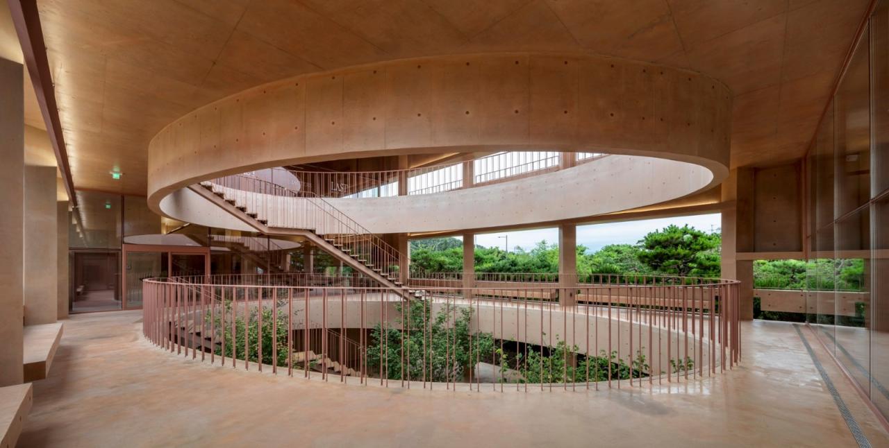 被分割的两座建筑被放置在场地的单侧,自然形成了多个层次。椭圆形规划的墙体和直线型的墙体相接,形成不同宽度的空间,裸露的混凝土顶棚调整高度,保持空间张力。由涂层胶合板制成的光滑的裸露混凝土不断拥有强烈的阴影形式,45 度旋转的方形柱子为迷人的空间做出了贡献。除了建筑中的空间外,新的景观和不锈钢墙被添加到古老的松树林中,它们也增强了空间的活力。为了让人们从不同的高度感受到古老的松树林,在地板上约五级台阶的高度上安装了钢制甲板。通过一个最小的翻新过程,两个旧仓库创造了粗糙的阴影,游客可以在这里穿越到过去。这是一个由不确定的程序、不同时代的树木和建筑之间的关系创造的动态景观。