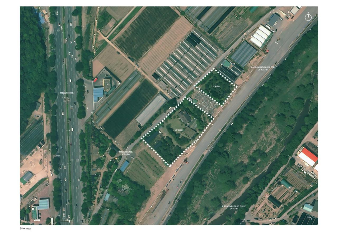 场地条件MRNW 大邱是一个将客户继承的其父亲过去培育的景观树农场改造成一个新空间的项目。该场地位于大邱的北部边界,被指定为限制开发区域,作为景观农场使用了 20 年。该地块的南侧面向东华川路(双向六车道),北侧面向虎谷路(单向单车道)。东华川路比场地面高约 2.3 米。场地面向虎谷路的边界是由农场围栏和围栏上的松树组成。当项目启动时,场地上有很多景观植物,这些植物是客户的父亲凭着他对树木的感情培育种植了 20 年,同时也是为了出售。一个古老的花园在一个广阔的草坪院子里,五个仓库被安排在周围,在后面是管理住房。