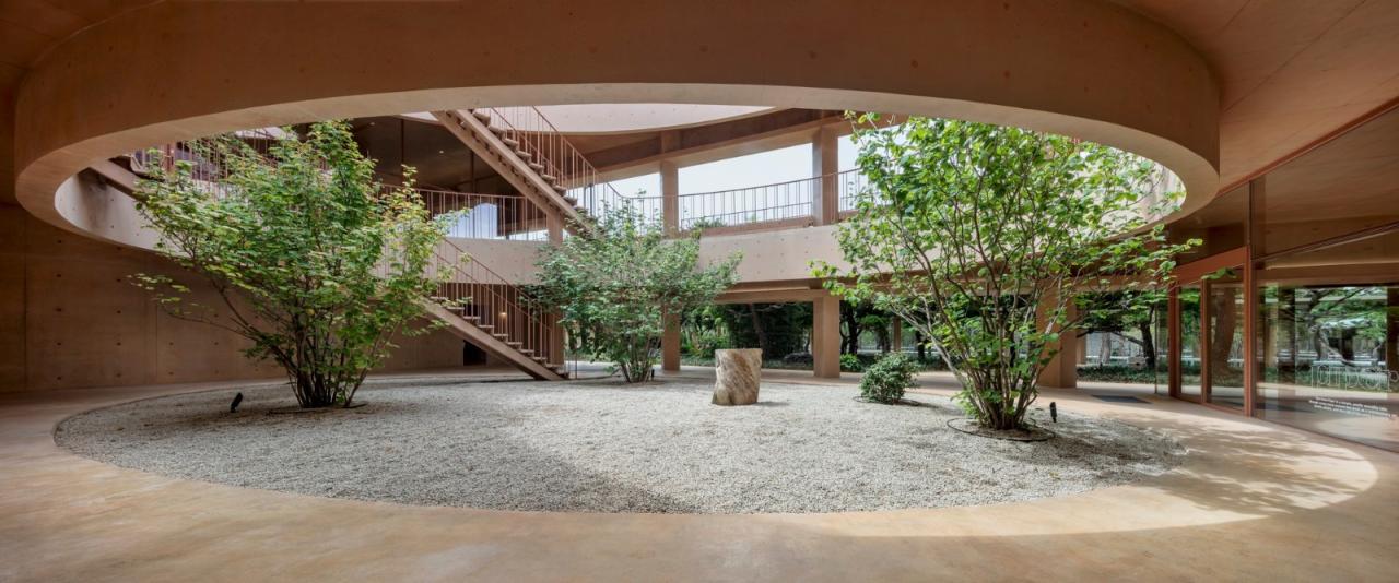叙事空间进入狭窄的入口,穿过淡粉色的裸露混凝土墙,一些树木一起映入眼帘:两棵现有的柿子树,形状和类型都很好,还有一棵新栽的金丝楠木,在围墙上开着黄色的花。这个场景是衡量 MRNW 计划概念的一个重要线索。MRNW 从孩子们几代人对他们父亲那一代人耕种的茂密而古老的花园的平面和剖面的精心干预开始。建筑物可以成为树木的背景,或者通过视觉控制充当框架。此外,在裸露的混凝土墙的阴影下,它成为一条看花园的路线,以及通过进入树荫下的平台。MRNW 分为五个区域,其中停车场、咖啡馆、花园、庭院、古朴的老花园和松树林依次重叠在一起。室内空间的放置方式与室外区域相交,实现了几种组合的视觉关系。参观者在这里会体验到多样化和不同的印象。当人们转过入口坡道,走向主入口时,他们会遇到一系列丰富多彩的场景。