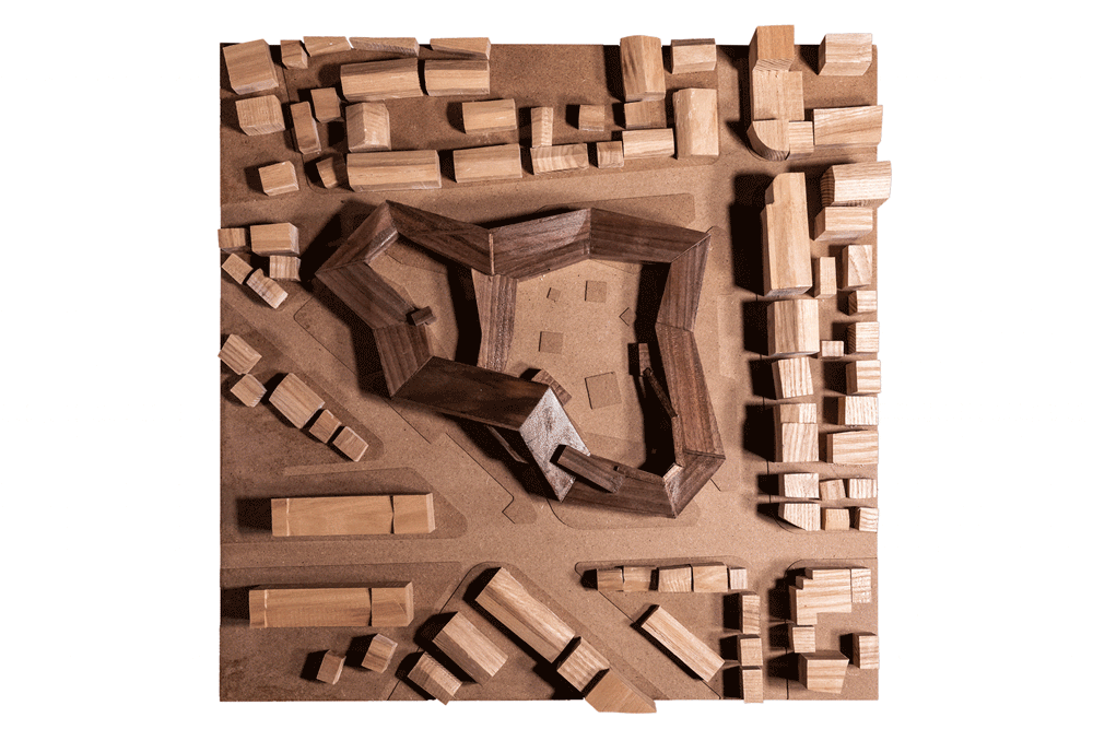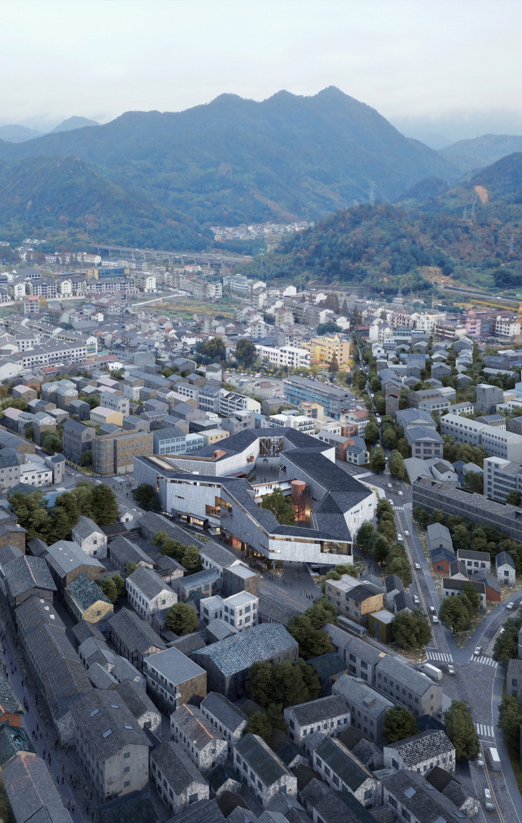 基于以上两点目标,我们提出了中心围合与底部开放、多重尺度以及复合功能的设计策略。建筑尽可能贴临场地红线布局,守住老街边界的同时保持街巷的连续与完整;内侧围合出一大一小两个庭院;进而通过边界退让与角部抬升,呈开放姿态。同时,建筑上部以超日常的巨构尺度、连续一体且不规则起伏的悬浮形态,与远山遥相呼应,与周边民居相区别,呈现出相对谦和的视觉标识性。