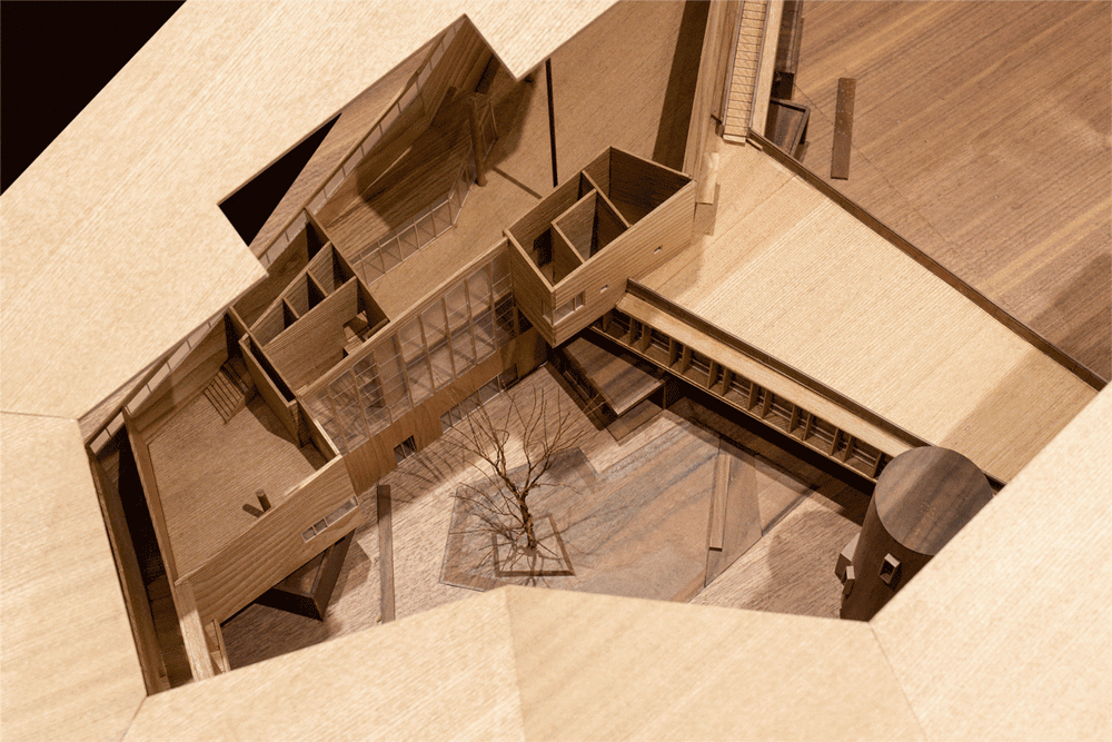 其三,围合的空间内部,在建筑二层设置架空的连廊,以此打破大空间的单一性。尺度不一的庭院丰富了艺术中心面向日常的公共属性:大庭院提供小镇千人集会的场所;小庭院则以保留的百年朴树为中心,延续乡镇中依附大树而存在的寻常公共空间。