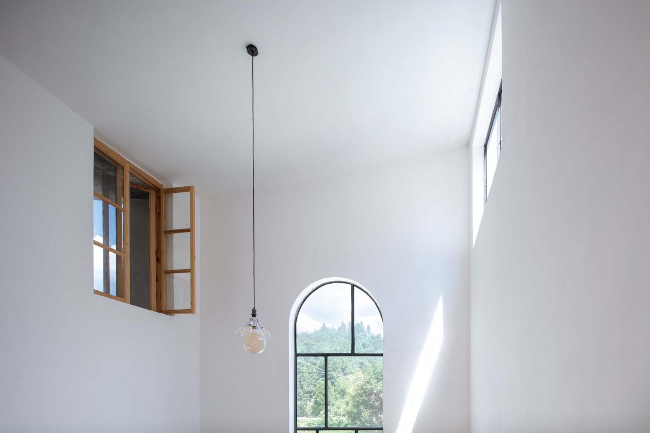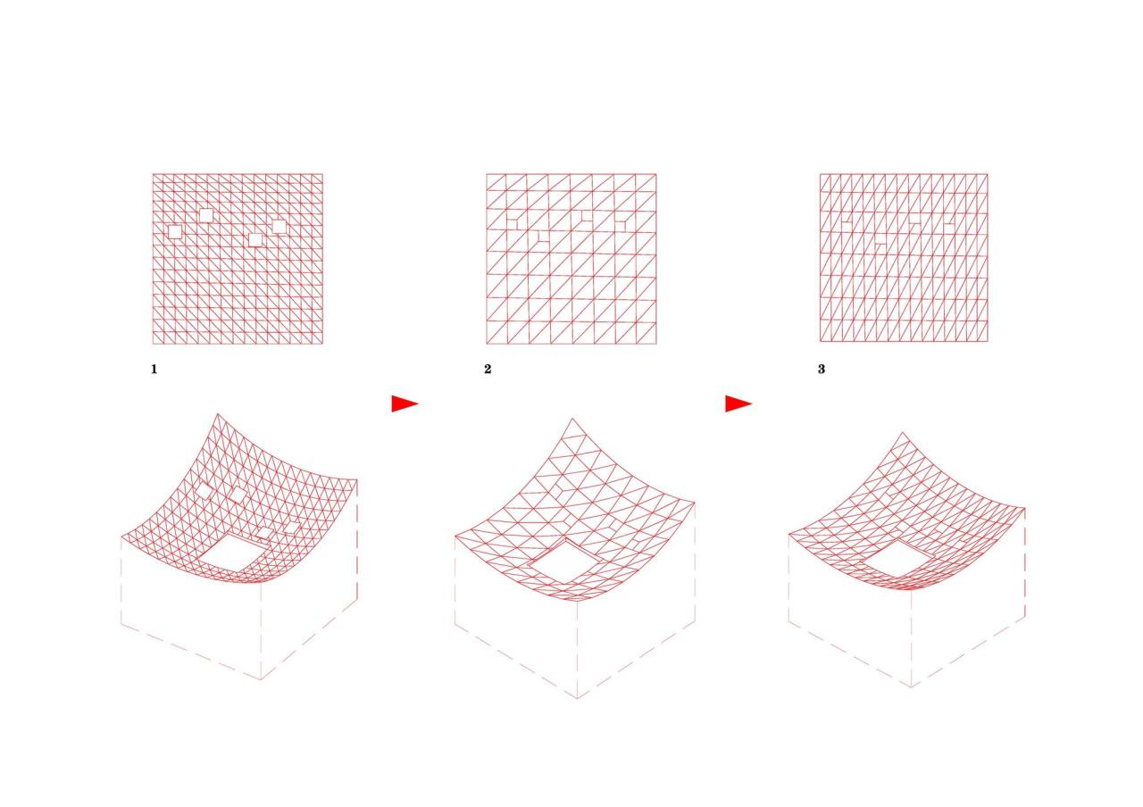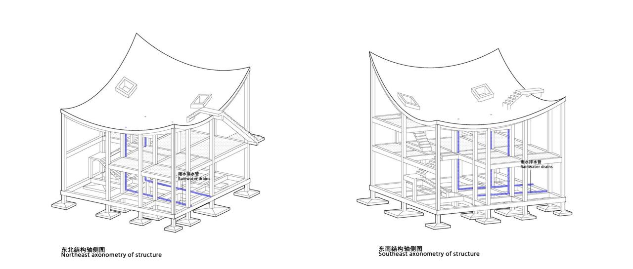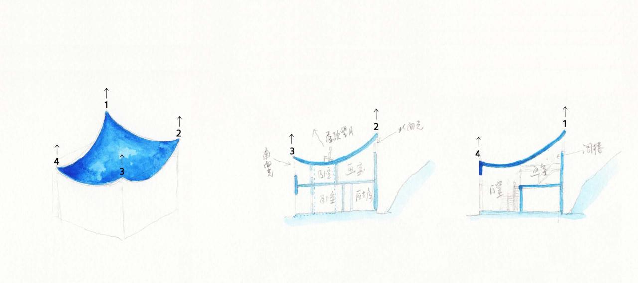 掀起房子的四角想象一间两层房子的四角被掀起。更多的光便照了进来,层高也变得模糊,有的房间有两层通高,有的房间有一层半那么高,还有的房间只有贴近屋顶的半层,自然成为客厅、画室、檐廊或者阁楼…屋顶自然成了一处由四条曲线围合出来的双曲面露台,像一个面向天空敞开的院子,院子的中间是晴天夜晚人们乘凉望月的地方,也是雨天雨水汇聚的地方,这里隐藏着四处排水点,将雨水从屋内引向屋外。