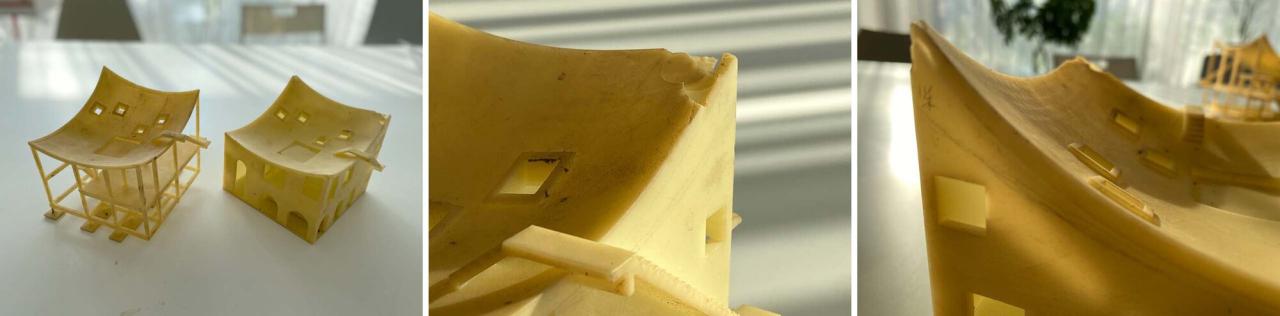 建造建造这个房子对于当地人来说是个新鲜事儿,也不是件易事,参与建造的是邻村的师傅,主要负责的两位师傅一位年长,一位年轻,年长的活儿好,年轻的能看懂图纸,善于沟通。竹子父亲管理施工的同时也亲自参与了建造。这个房子在预算极其有限的情况下能建成离不开他们的付出。为了方便师傅们直观地理解方案,除了施工图,我们还分别3D打印了建筑模型和结构模型放在现场。最难建造的是屋顶,主要是支模难和浇筑难,对于只做过平屋顶和坡屋顶的师傅们来说,双曲屋顶一下多了几十个定位点,难度自然提升了不少。