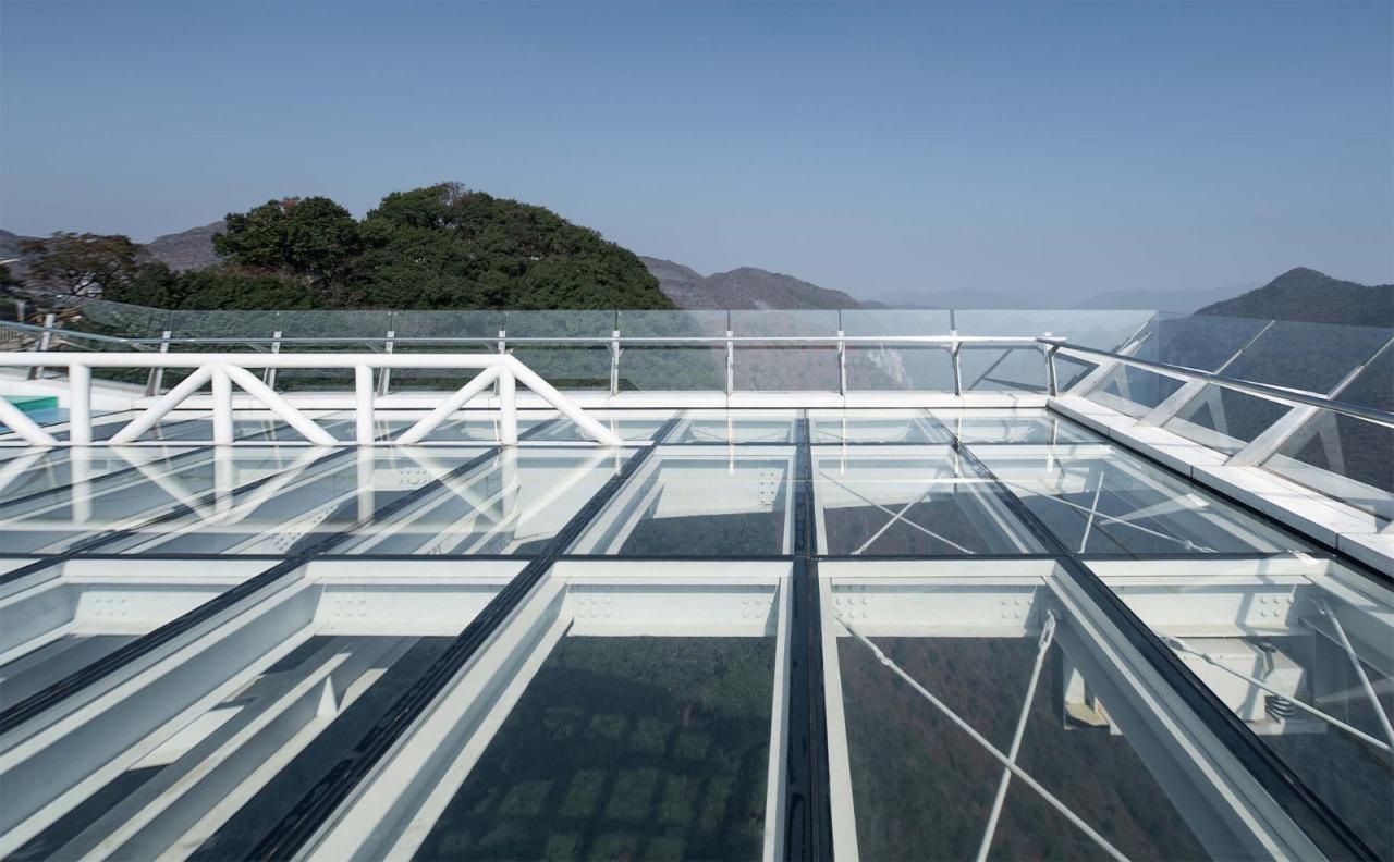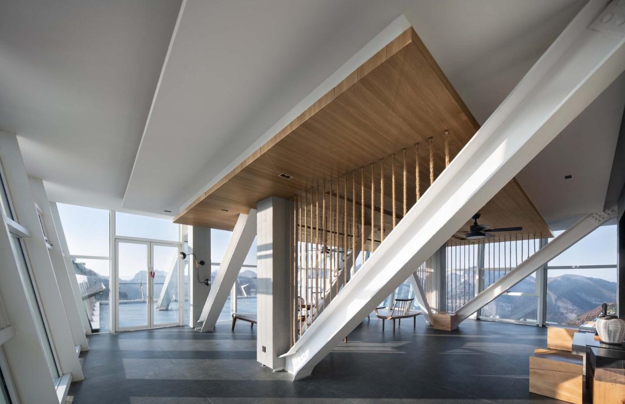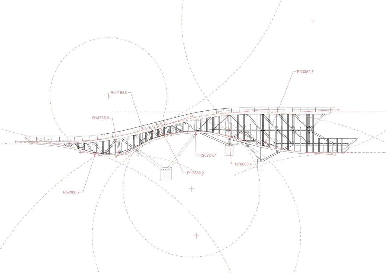 完成34米的悬挑尺寸仅仅是设计面临的挑战之一,平台的变形度、振幅控制,为了保证安全的心理感受,为设计增加更大的难度。山脊顶部400米长的裂缝是项目最主要的不稳定因素。除了灌浆处理,建筑的支座设计向内倾斜,水平分力提供山脊环抱力,增加场地的稳定性。建筑结构一体化的设计方法,结合结构设计原理,将变形最大的部位向颈部后移,悬挑最前端的变形反而更小。液态阻尼箱的采用进一步控制了振幅与振动频率。减少垂直力对山体的破坏,建筑的自重尽可能减轻到基础开挖的岩石相同的重量。观景平台主体结构采用空间钢桁架结构,前端栏杆作为桁架结构的一部分,使前悬臂尽可能的轻薄。通过增加支柱长度,实现了前悬臂结构的预应力拱形结构,同时对静载和部分活载下的挠度进行补偿,这也保护玻璃免受大的变形。结构系统和构件的布置适应了力的分布,与建筑几何完美对应。
