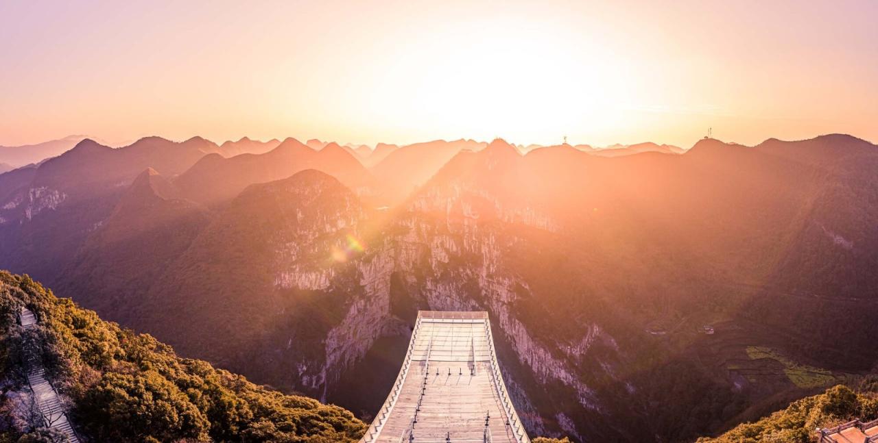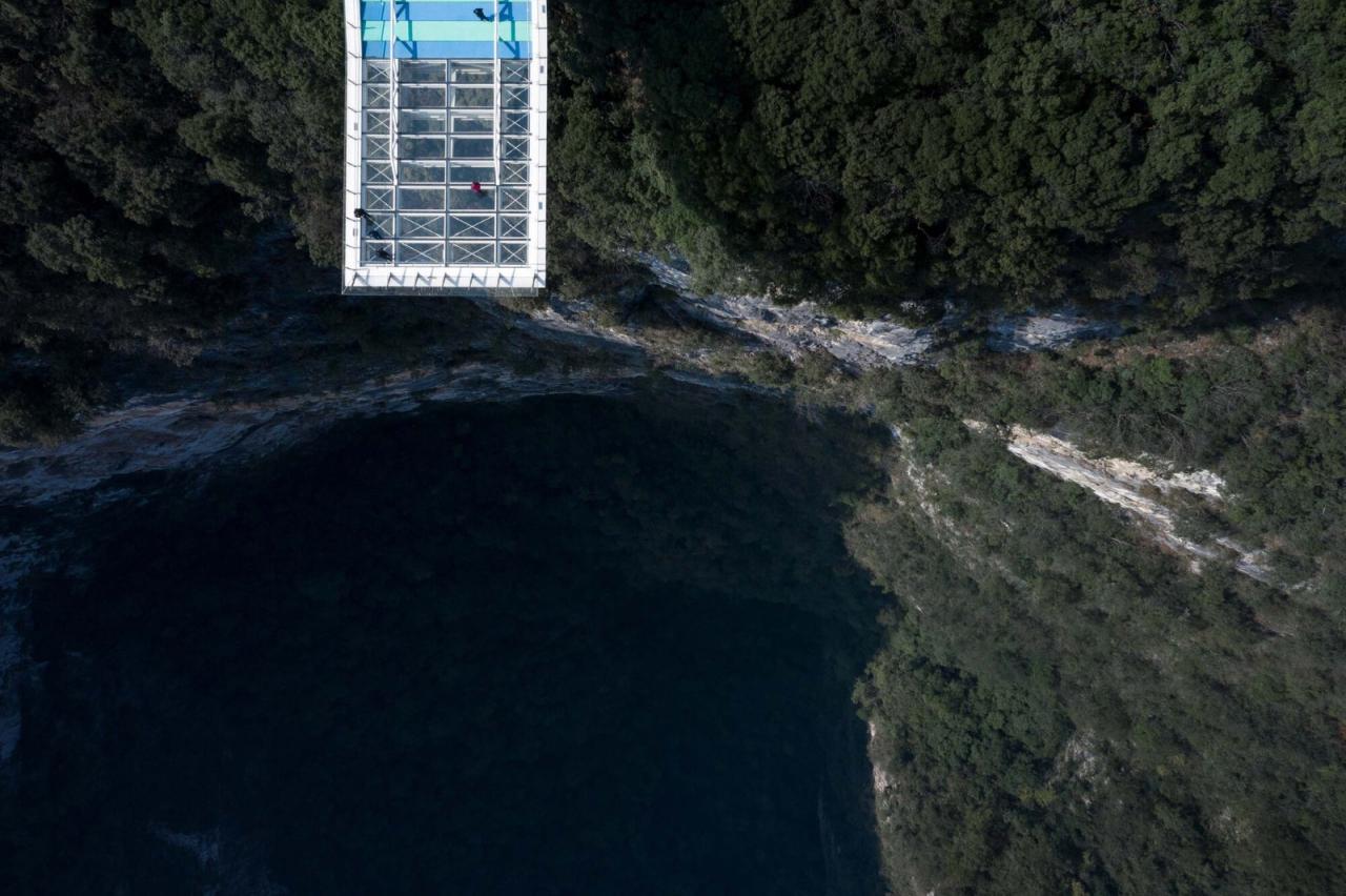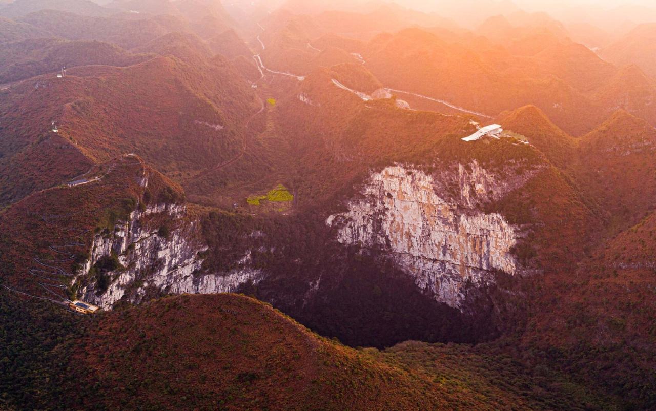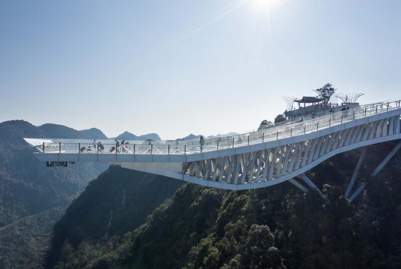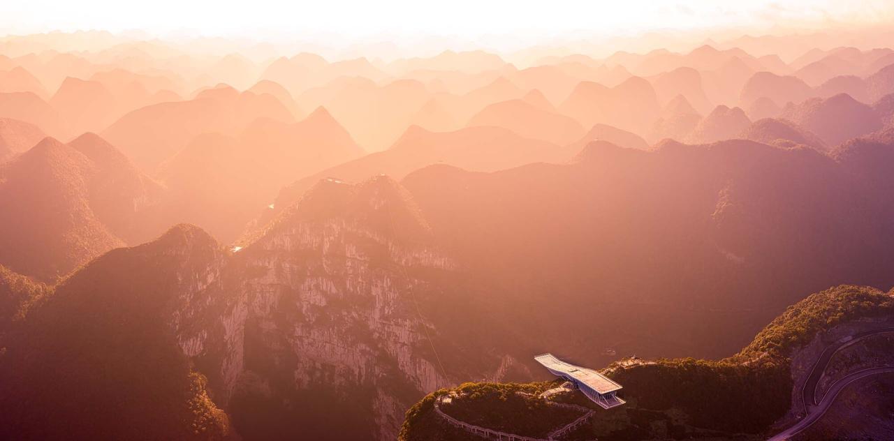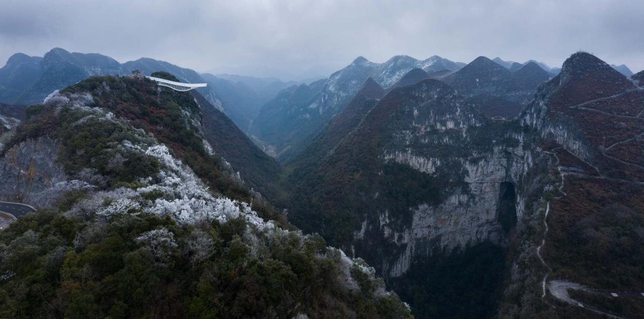 喀斯特地貌分布在广西、贵州、重庆等地,其中广西分布最为广泛。喀斯特(KARST)即岩溶,是水对可溶性岩石进行以化学溶蚀作用为主,流水的冲蚀、潜蚀和崩塌等机械作用为辅的地质作用。桂林山水即是喀斯特地形的典型表现。侵蚀形成的溶洞天坑等地理景观。乐业县大石围天坑群是世界上最大的天坑群,被誉为“世界天坑博物馆”。云海天舟项目正是为体验这种大尺度地理奇景。观赏峡谷大尺度地理景观的典型案例,美国亚利桑那州科罗拉多大峡谷观景平台,悬空的甜甜圈造型将建筑的凌空感和旅游动线相结合。山西悬空寺建筑与崖壁融为一体,中国山水画情境的再现。大石围天坑的崖壁距离山顶被植物覆盖,想要体验天坑的凌空感,需要使游客接近或超出崖壁。如果采用甜甜圈造型,后部需要巨大的支座平衡前端重量。