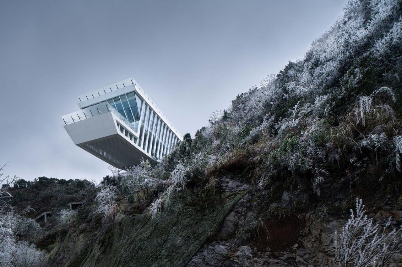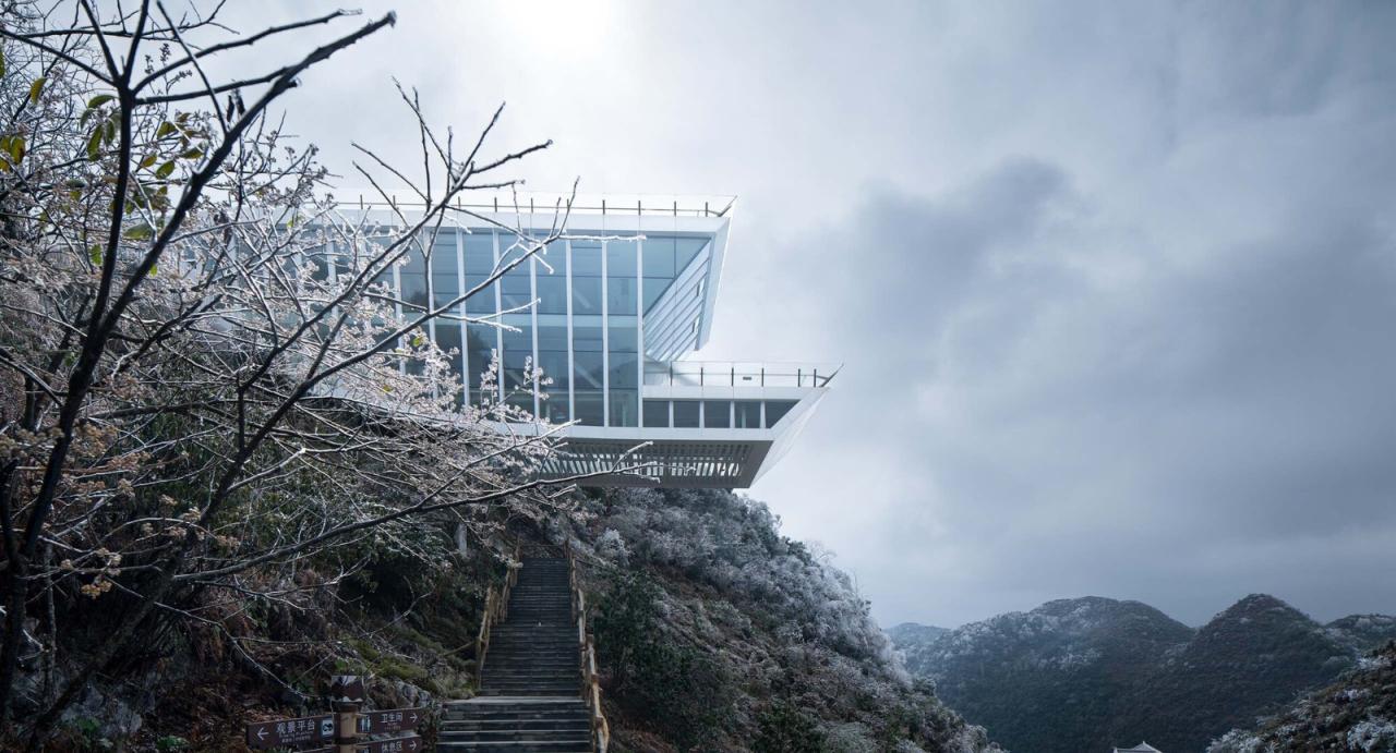 建造过程考虑到喀斯特地形存水困难,当地植被生长缓慢,生态条件脆弱,在山脊非常有限的场地内建造一座80米长,10米宽的观景建筑,三座塔吊接力将预拼装构件吊装至山顶,最终完成建造。云海天舟的设计在自然景观保护与利用的两难之间,从设计理念与技术的角度给出了一种解答。技术的应用不单是为了实现悬挑尺寸的数字指标,应对设计目标技术的内在碰撞与设计理念的契合,自然形成了设计的最优解。让更多的人能够体验到喀斯特地形天坑带来的震撼性体验。建筑以一种高调的姿态谨慎的应对脆弱的地质条件,强烈的视觉形象背后则是谨慎分析之后的理性回应。山谷间实现34米悬挑是建筑结构的一次大胆尝试,放眼整个天坑群,云海天舟仅仅是山间渺小的一叶小舟。
