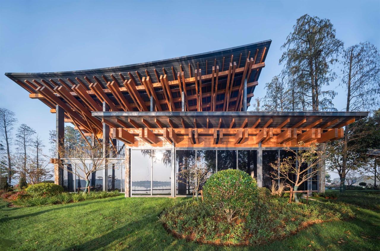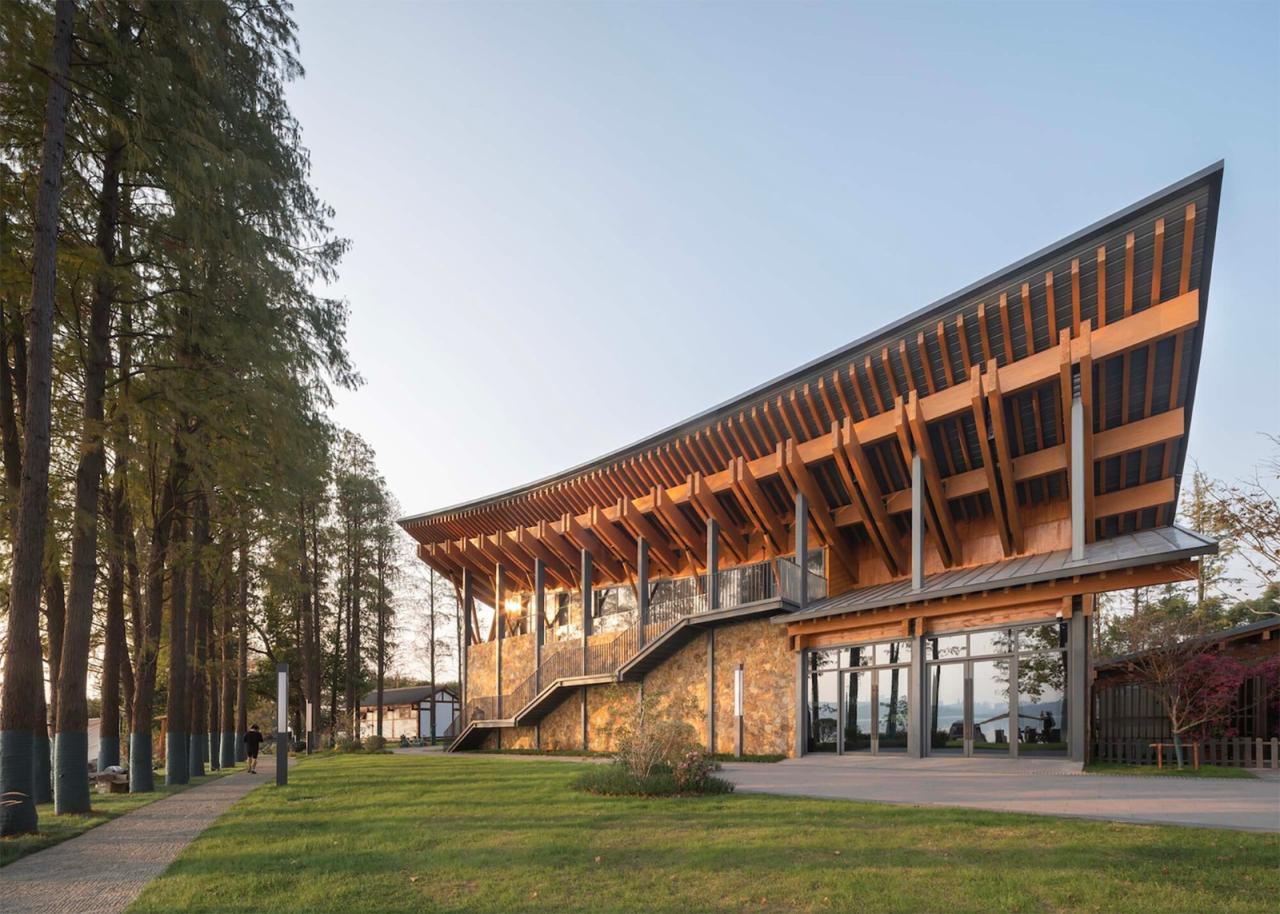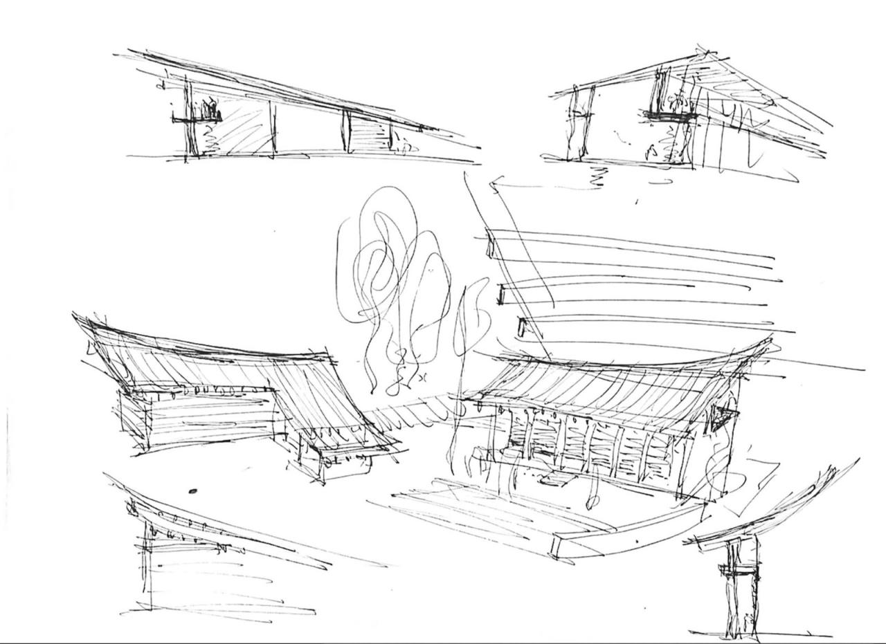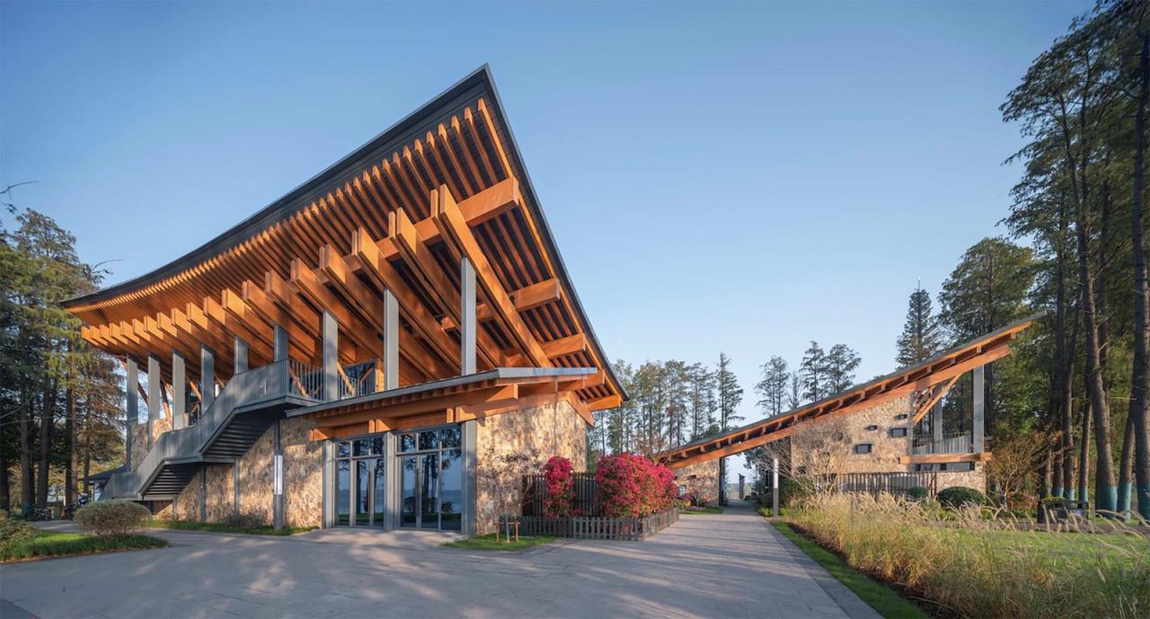 原有厂房的旧屋顶显得沉闷,原有员工食堂和厨房的单坡屋顶潦草简陋,原有宿舍的平屋顶与优美的东湖环境格格不入。我们参照水鸟翅膀的形态,结合中国传统木构建筑的举折曲线,设计了出檐深远的单坡屋顶,在面对大湖面的高侧空间中设置夹层,形成观景、观鸟平台;我们按照中国传统建筑的“彻上露明造”逻辑,特意暴露全部结构,以展现屋檐之下具有表现力的木构体系。建筑竣工之后,有人看出了飞鸟展翅的动势:野木迢迢遮去雁,渔舟点点映飞鸟,有人看出了湖北出土之编钟的影子,有人看出了钢琴键盘的隐喻,也有人看到了楚文化的特征;还有人看出了九头鸟的气势:天上九头鸟,地上湖北佬。建筑形态的多义性解读赋予了这组建筑更多的内涵。