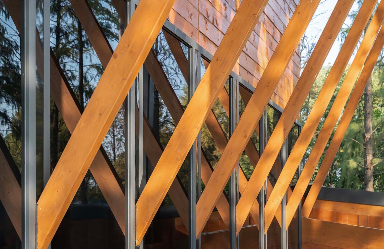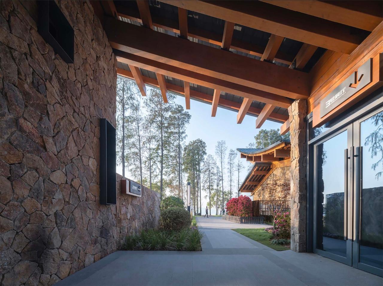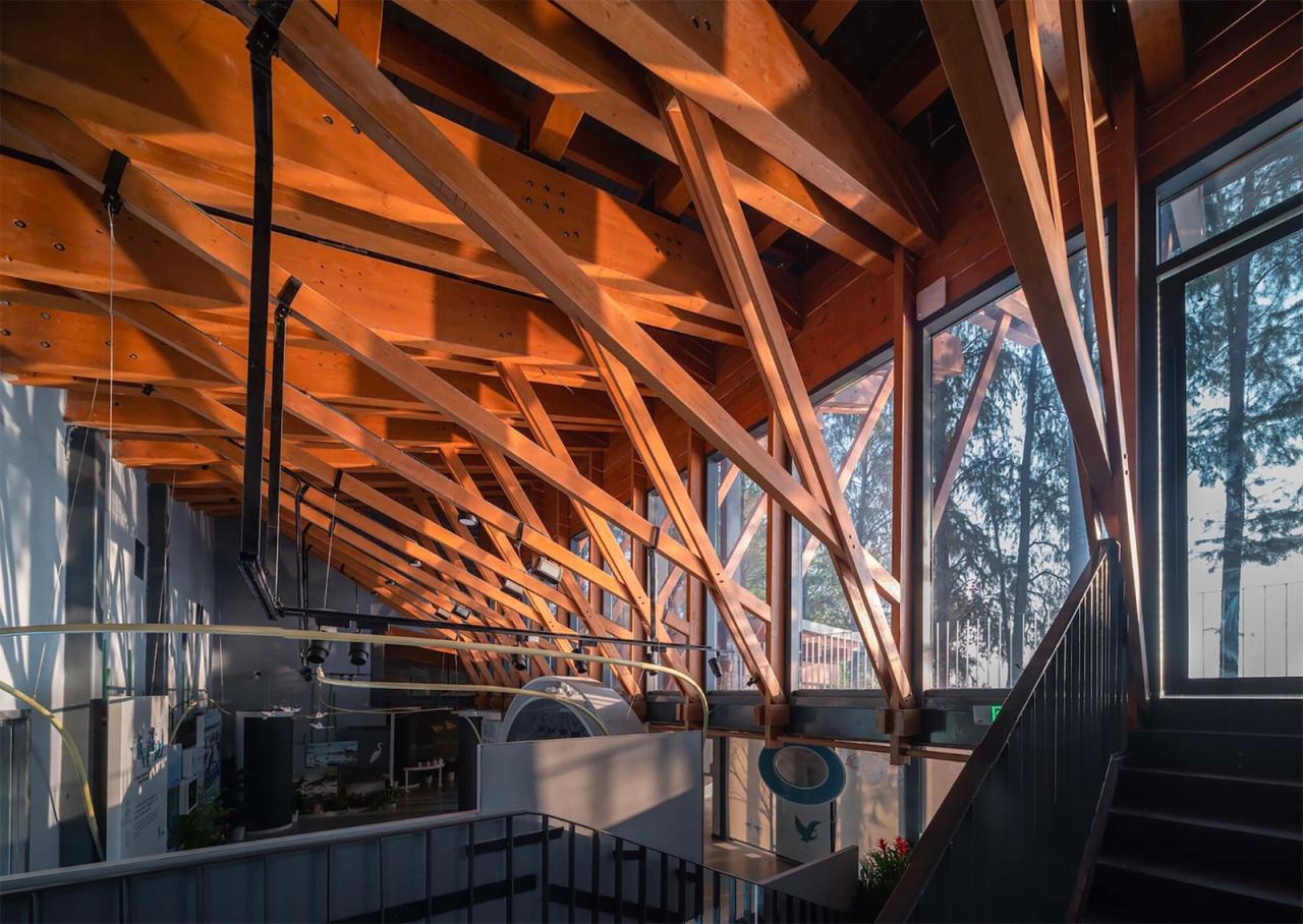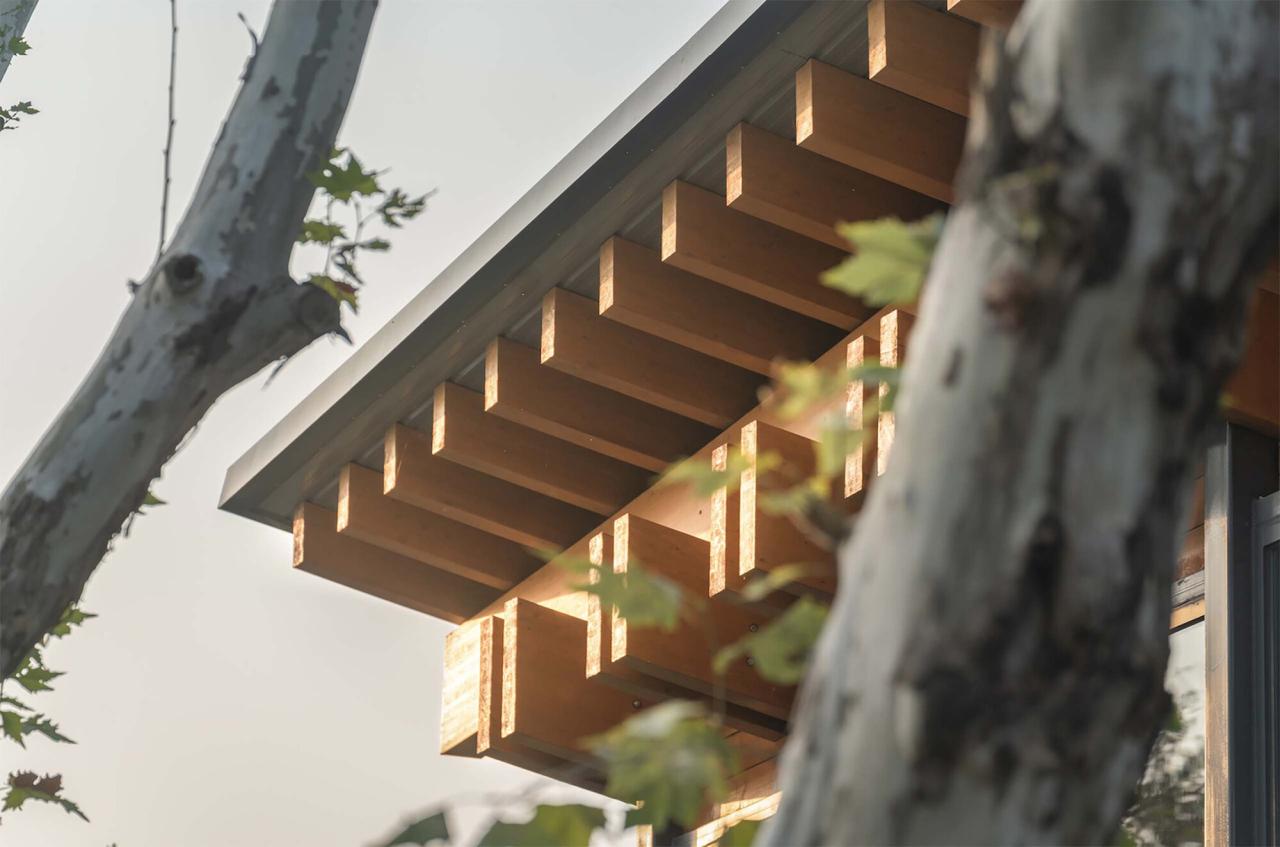 原有厂房的旧屋顶显得沉闷,原有员工食堂和厨房的单坡屋顶潦草简陋,原有宿舍的平屋顶与优美的东湖环境格格不入。我们参照水鸟翅膀的形态,结合中国传统木构建筑的举折曲线,设计了出檐深远的单坡屋顶,在面对大湖面的高侧空间中设置夹层,形成观景、观鸟平台;我们按照中国传统建筑的“彻上露明造”逻辑,特意暴露全部结构,以展现屋檐之下具有表现力的木构体系。建筑竣工之后,有人看出了飞鸟展翅的动势:野木迢迢遮去雁,渔舟点点映飞鸟,有人看出了湖北出土之编钟的影子,有人看出了钢琴键盘的隐喻,也有人看到了楚文化的特征;还有人看出了九头鸟的气势:天上九头鸟,地上湖北佬。建筑形态的多义性解读赋予了这组建筑更多的内涵。