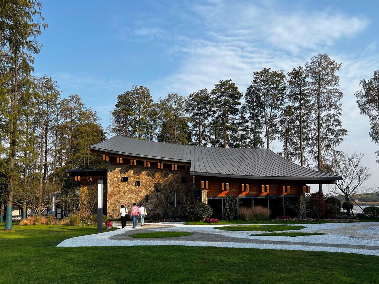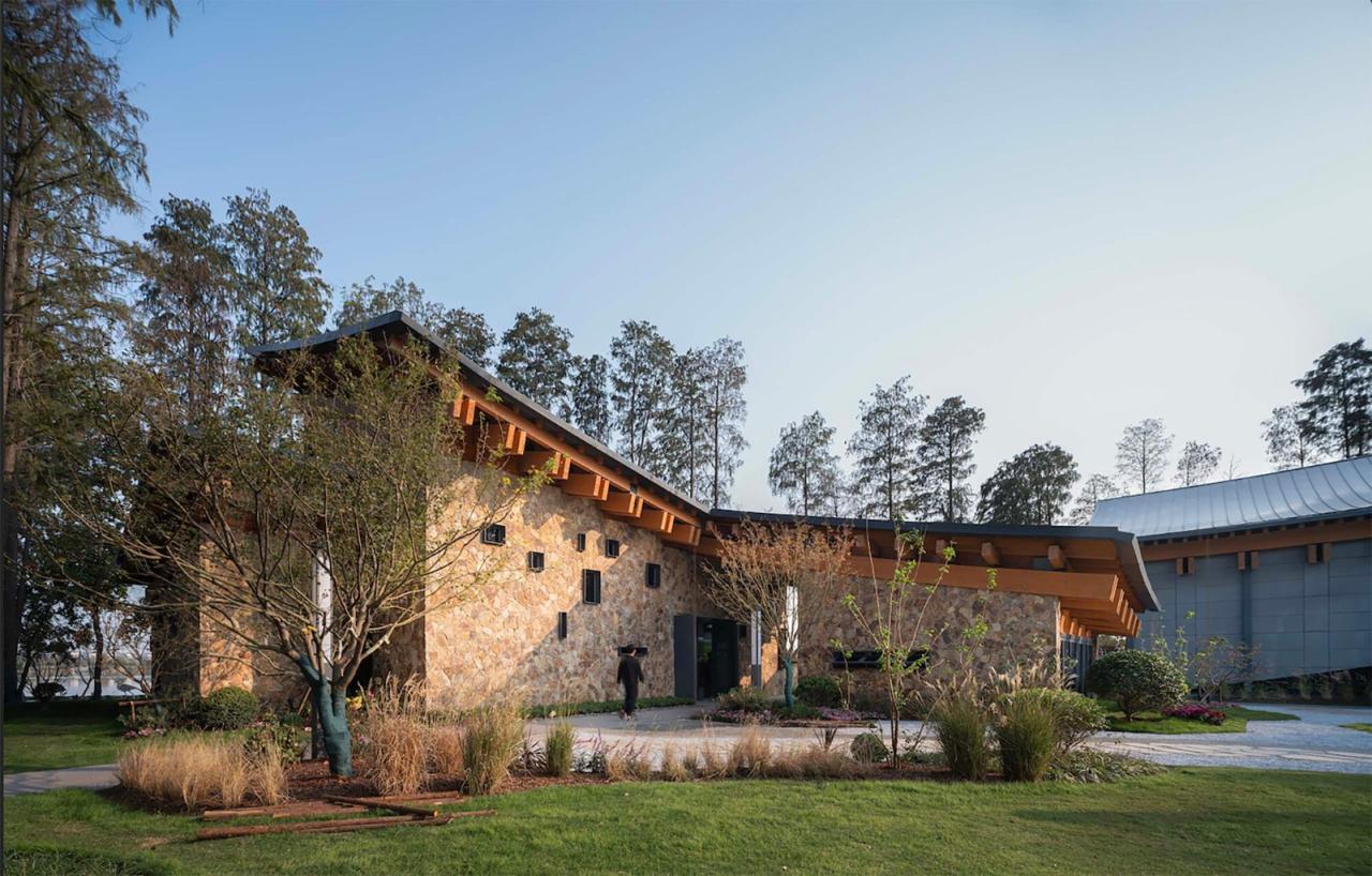 这里原是一个工业水厂,厂区内有水泵房、员工食堂、厨房及员工宿舍。20多年前水厂废弃,但建筑及内部的机械设备尚存。我们希望通过设计使得旧厂房得到活化和再生,在保留场所记忆的同时,植入新的文化场景和展示功能。我们在这组废弃建筑的基础上重新设计了外墙及屋面,重新组织了观展动线。由于原有建筑面积太小,不足以承担展览的全部内容,我们在背水一侧挖了7米深的地下室,将其作为多媒体展厅。厂房空间高大,作为一般尺度的展览,并不需要如此高的空间,我们在面对大湖一侧做了夹层,形成了文字、实物及多媒体多种展示方式组合,地面、空中及地下多元空间相结合的当代展示馆。旧水厂因工业而生,因环保而废,如今又因湿地而重生,可循环的人居环境生生不息,一脉相承。